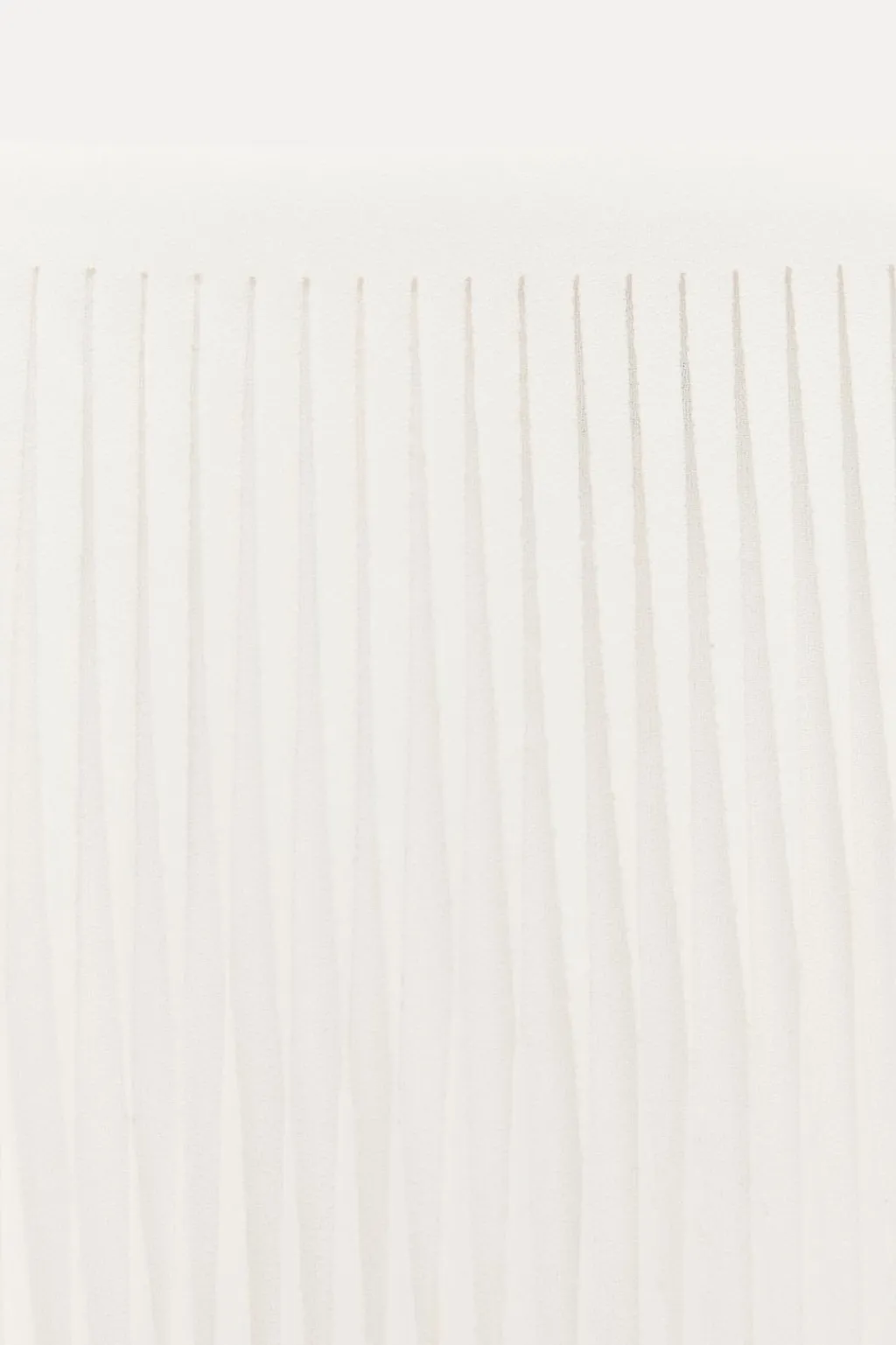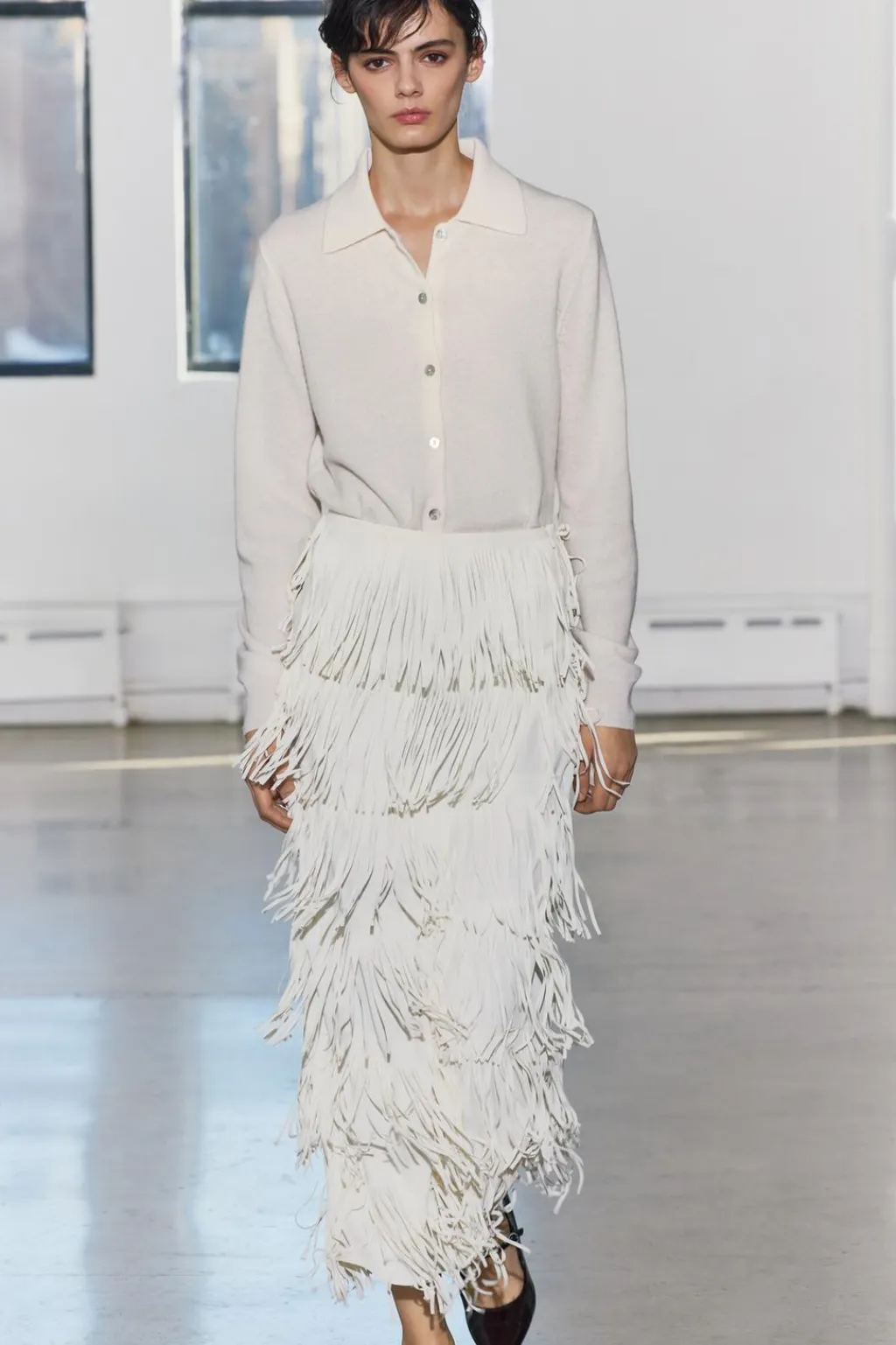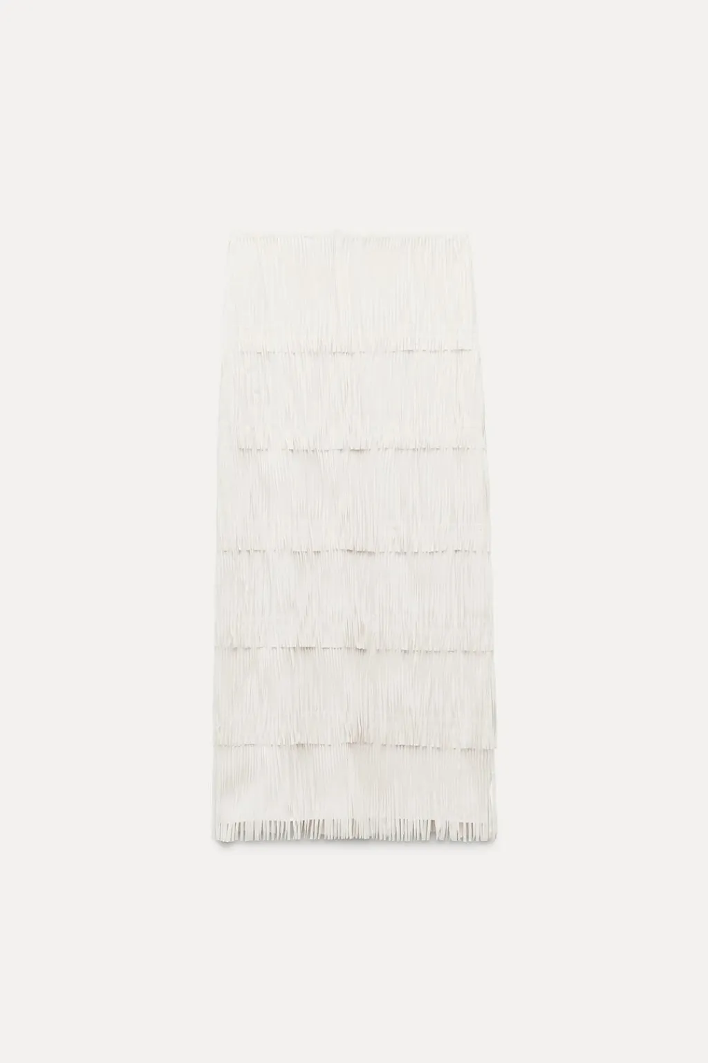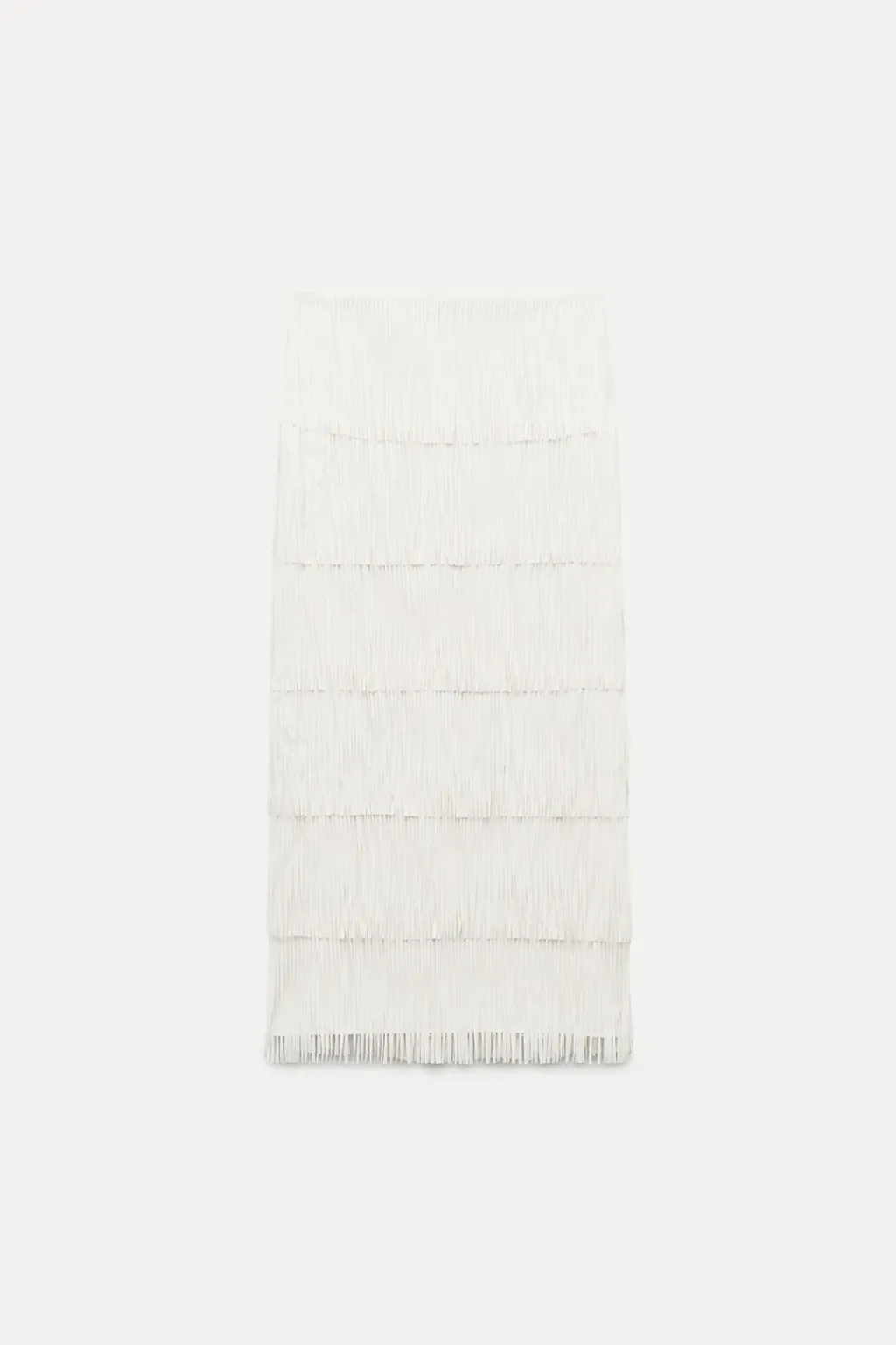 Falda midi de tubo con tiro alto. Detalle de flecos en mismo tejido. Cierre con cremallera oculta en costura.