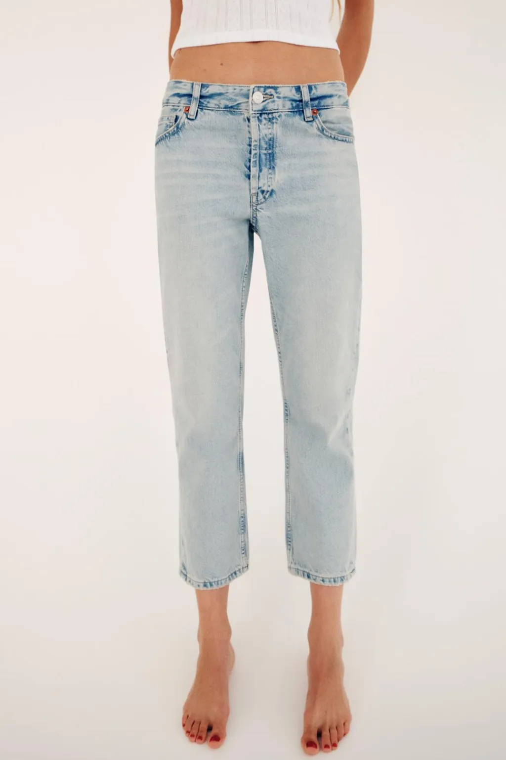 Jeans de tiro bajo y cintura con trabillas. Cinco bolsillos. Efecto lavado. Cierre frontal con cremallera y botón metálico.