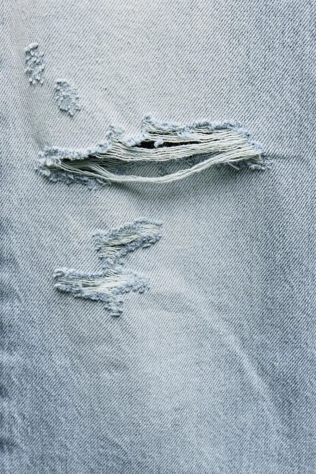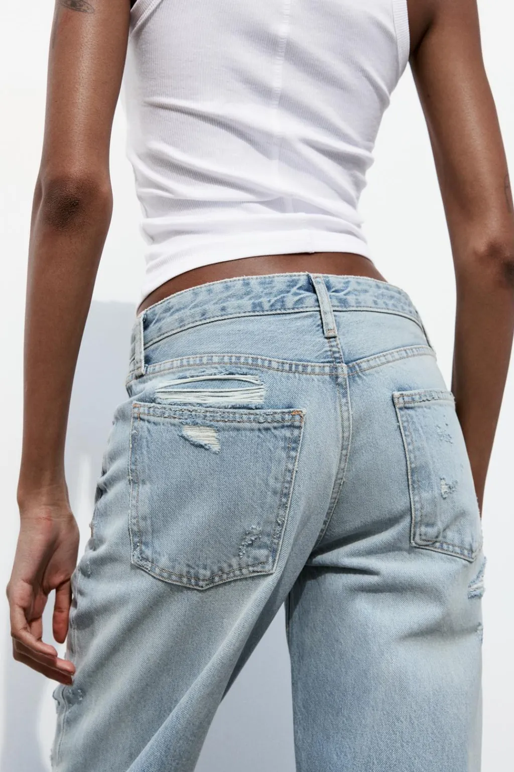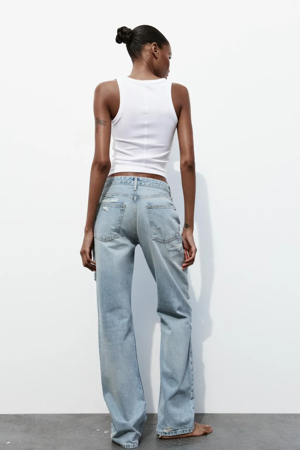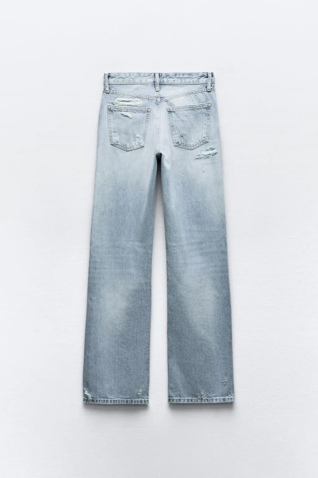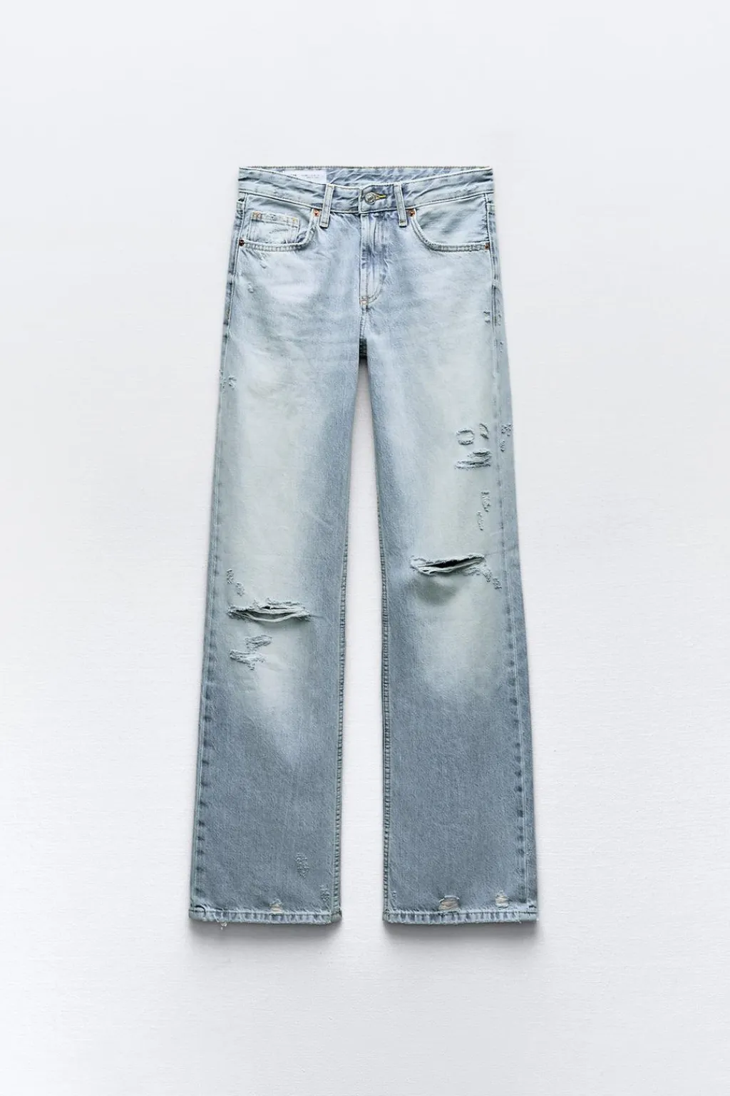 Jeans de tejido rígido con tiro medio y cinco bolsillos. Cintura con trabillas. Pierna ancha larga. Detalle de rotos. Cierre con cremallera y botón metálico.