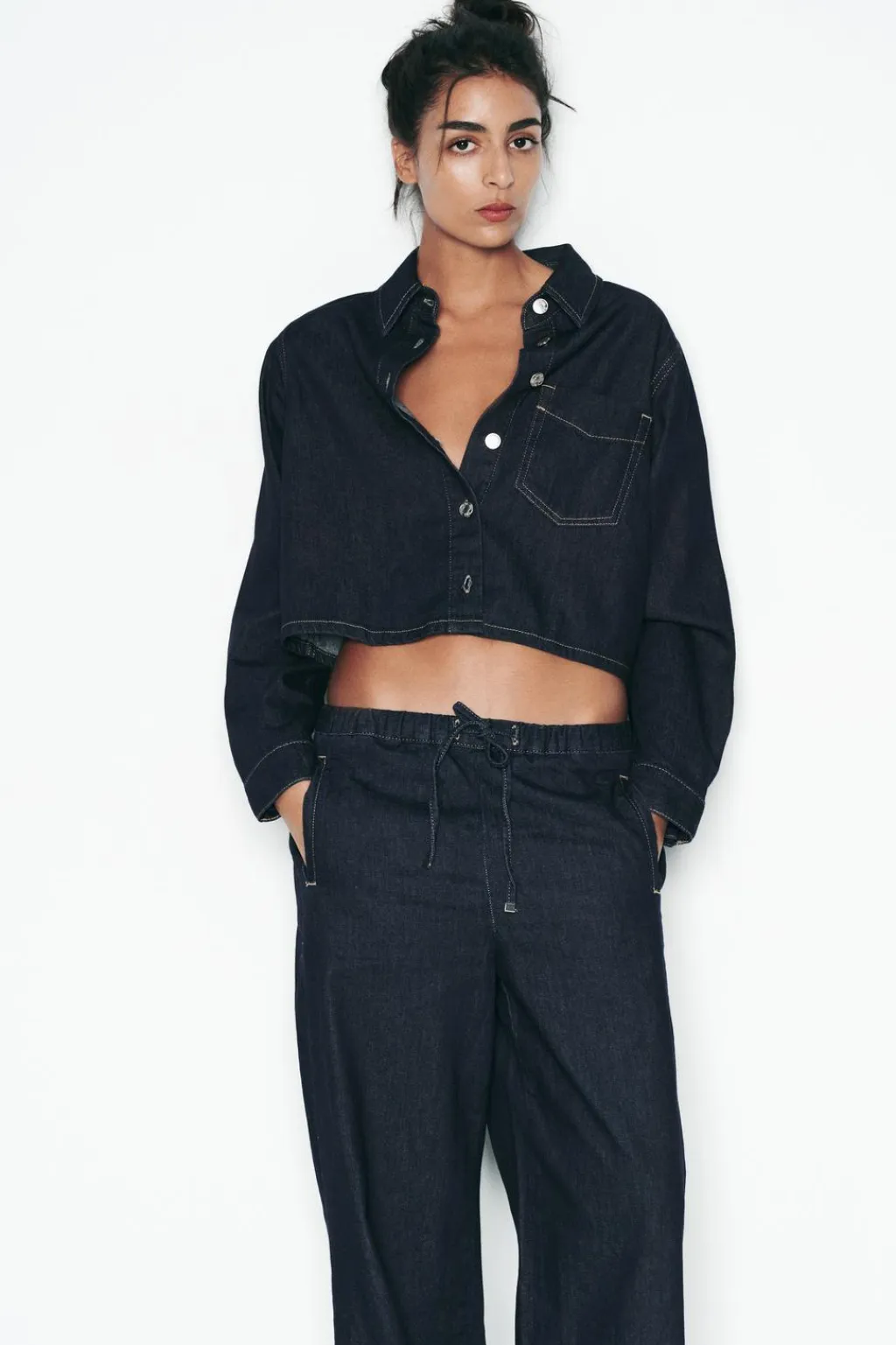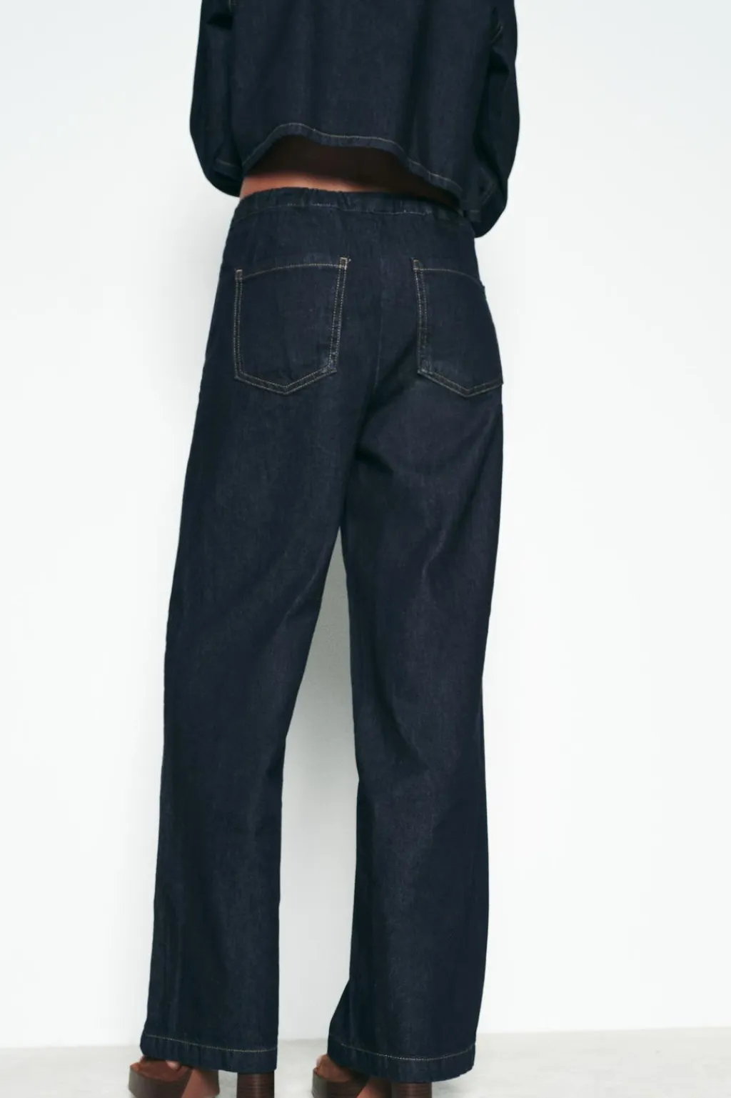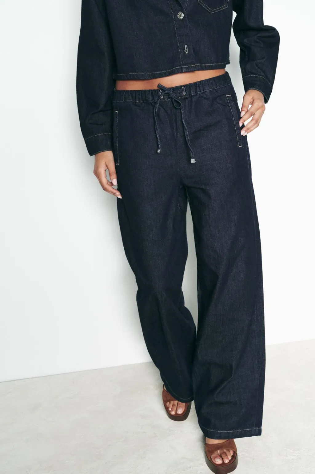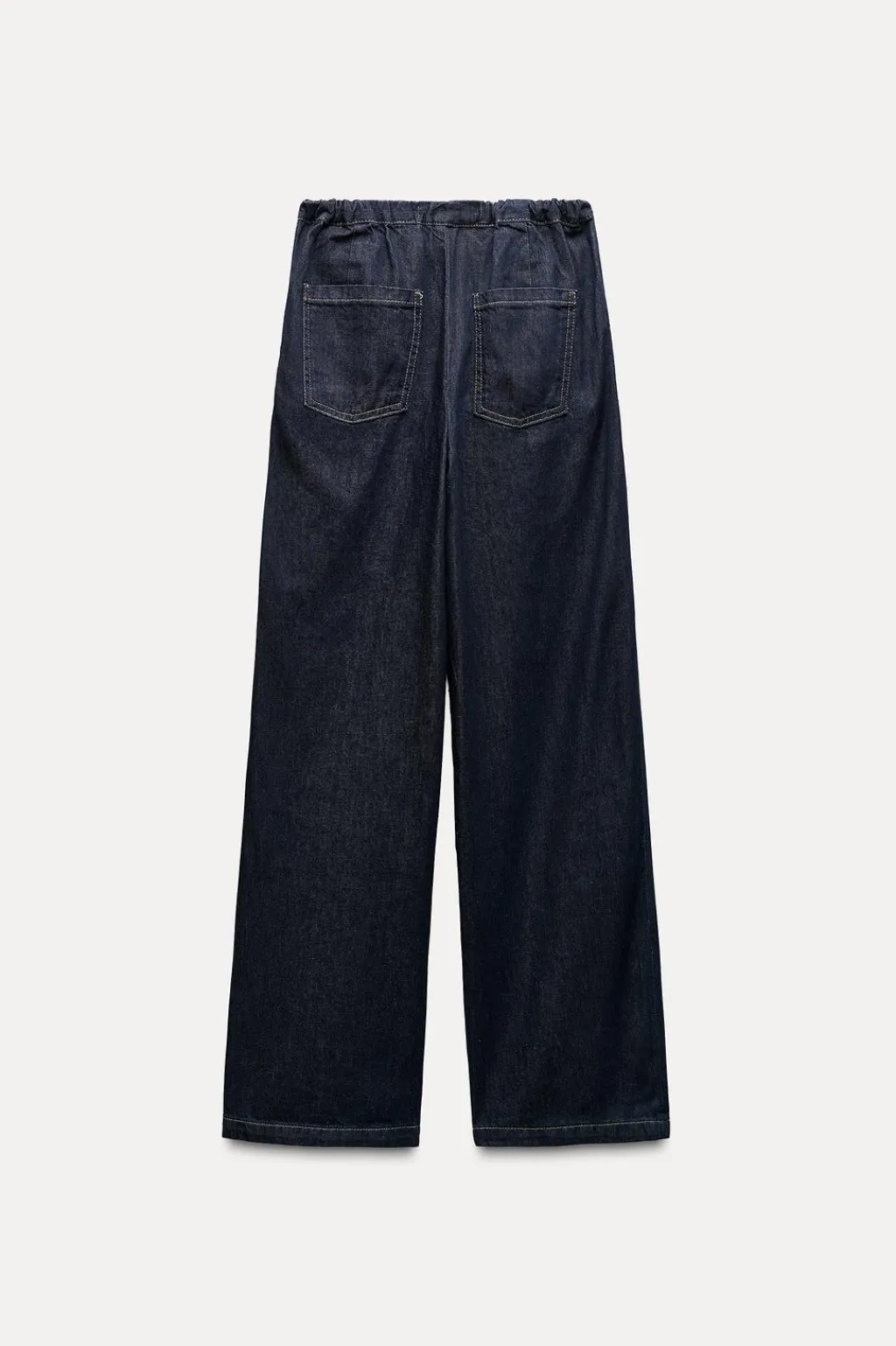 Jeans de tiro alto con cintura elástica ajustable con cordones. Bolsillos delanteros de vivo y bolsillos de plastrón en espalda. Pernera ancha.