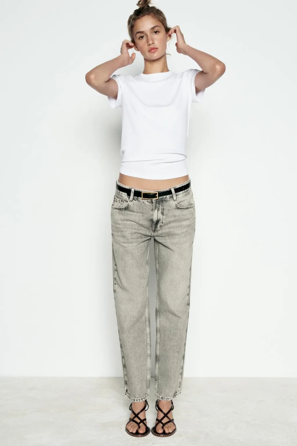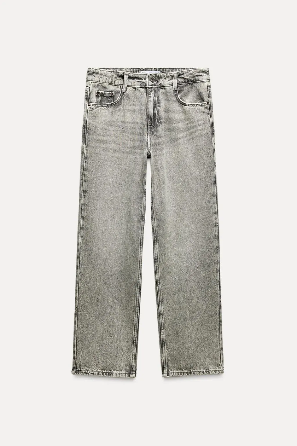 Jeans de tiro medio con cinco bolsillos. Efecto lavado. Pernera recta y corta. Cierre frontal con cremallera y botón metálico.