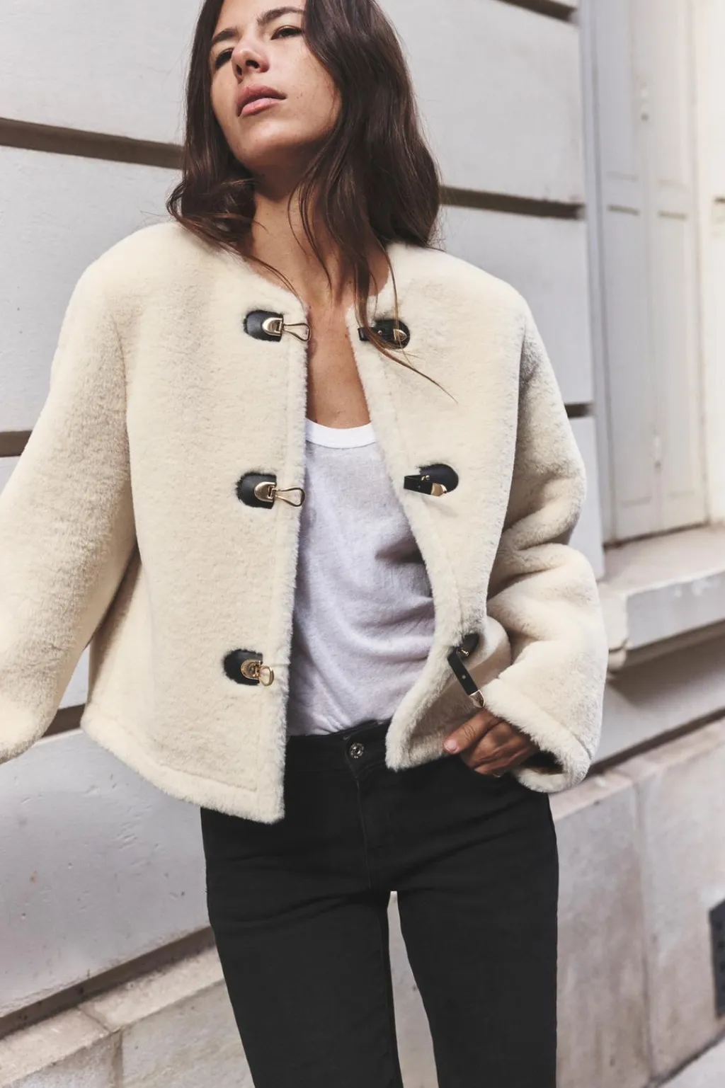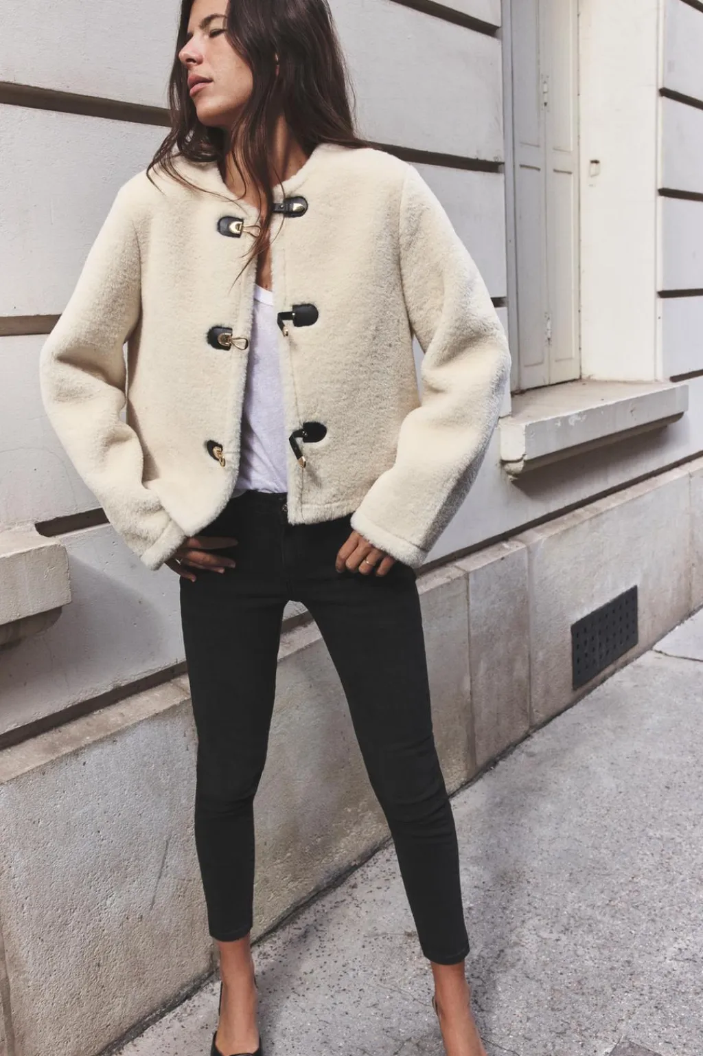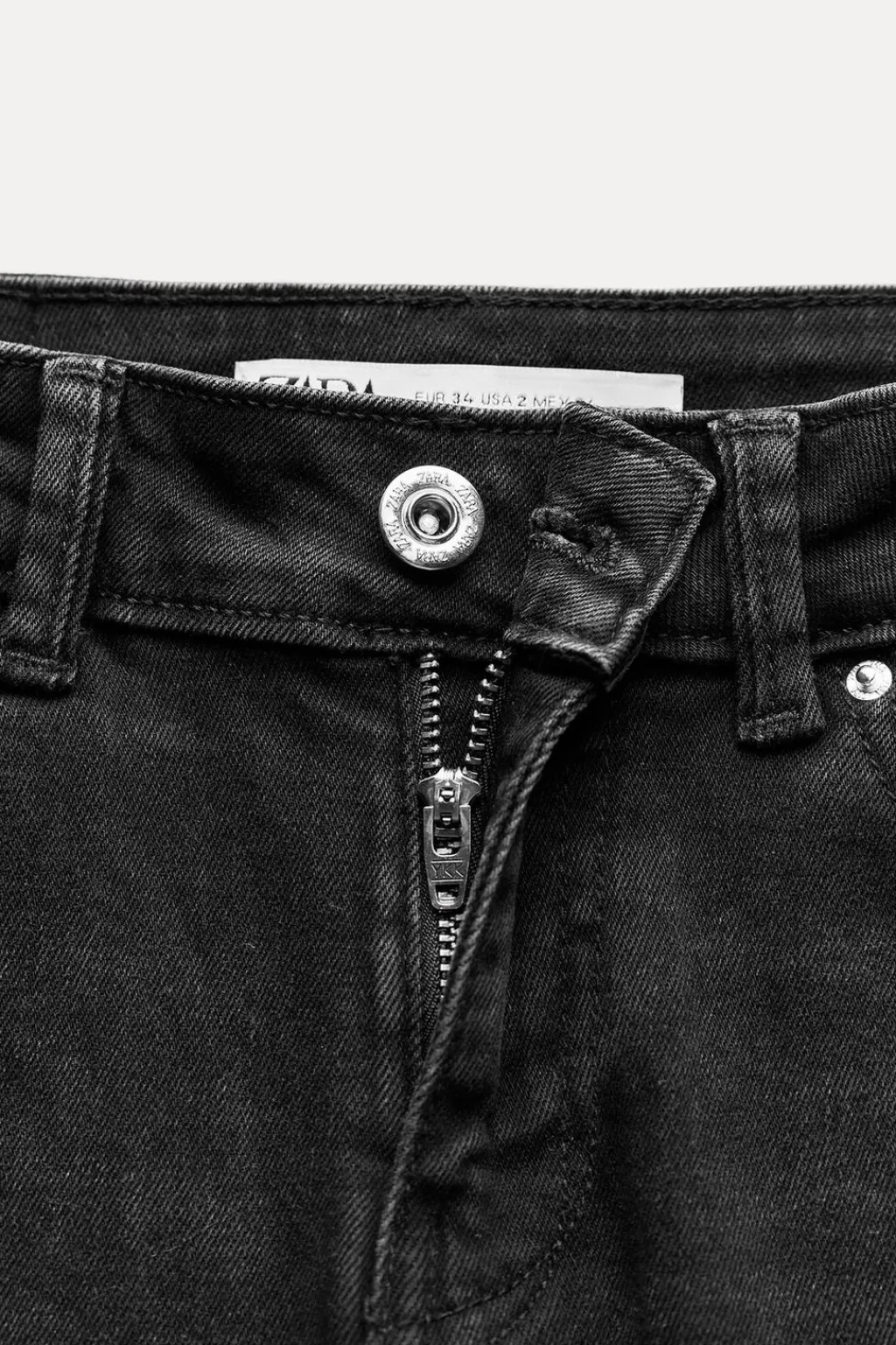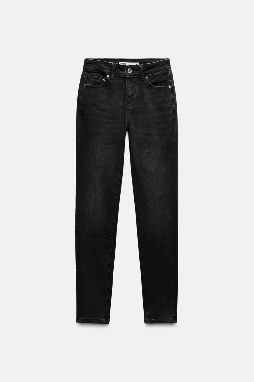 Jeans de tiro medio con cinco bolsillos. Efecto lavado. Cierre frontal con cremallera y botón.