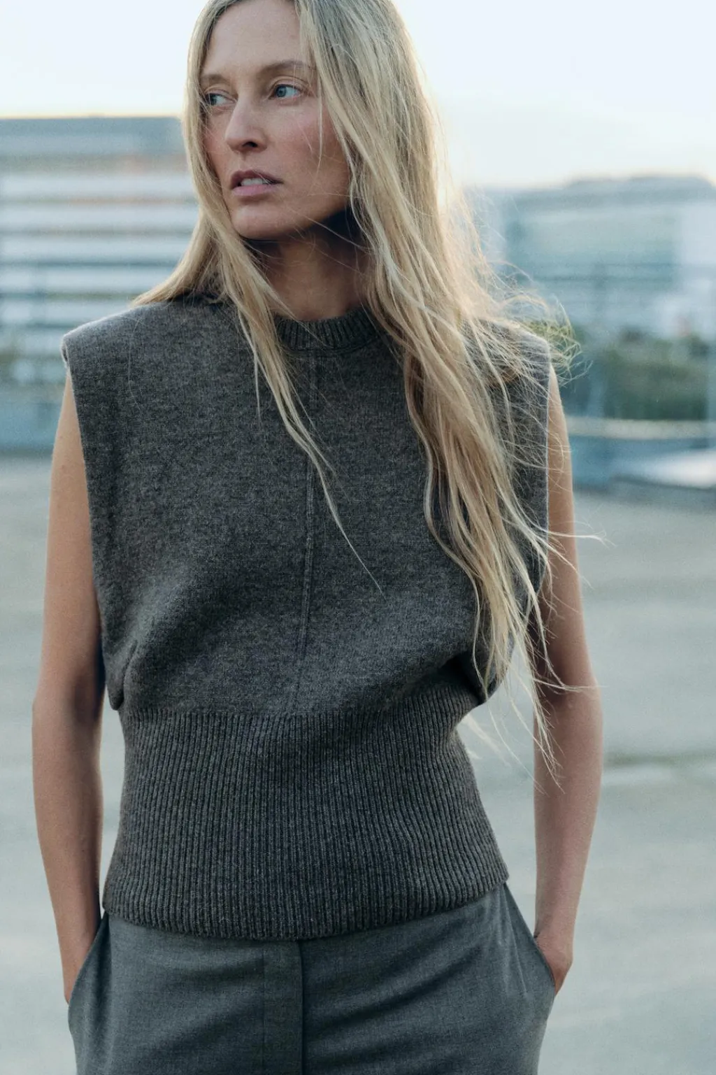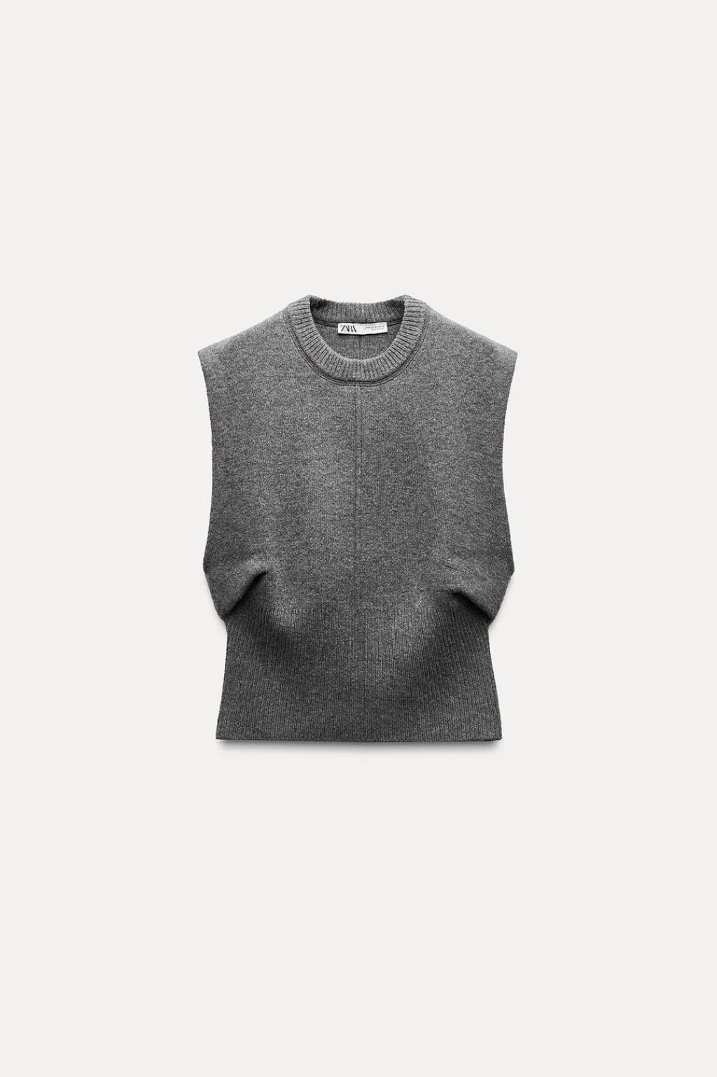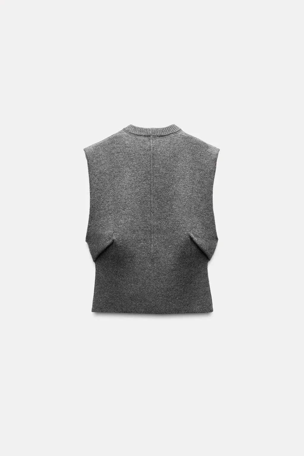 Jersey chaleco confeccionado en 96% lana. Cuello redondo y manga sisa. Detalle de cintura entallada con pinzas laterales. Bajo acabado con canalé ancho.