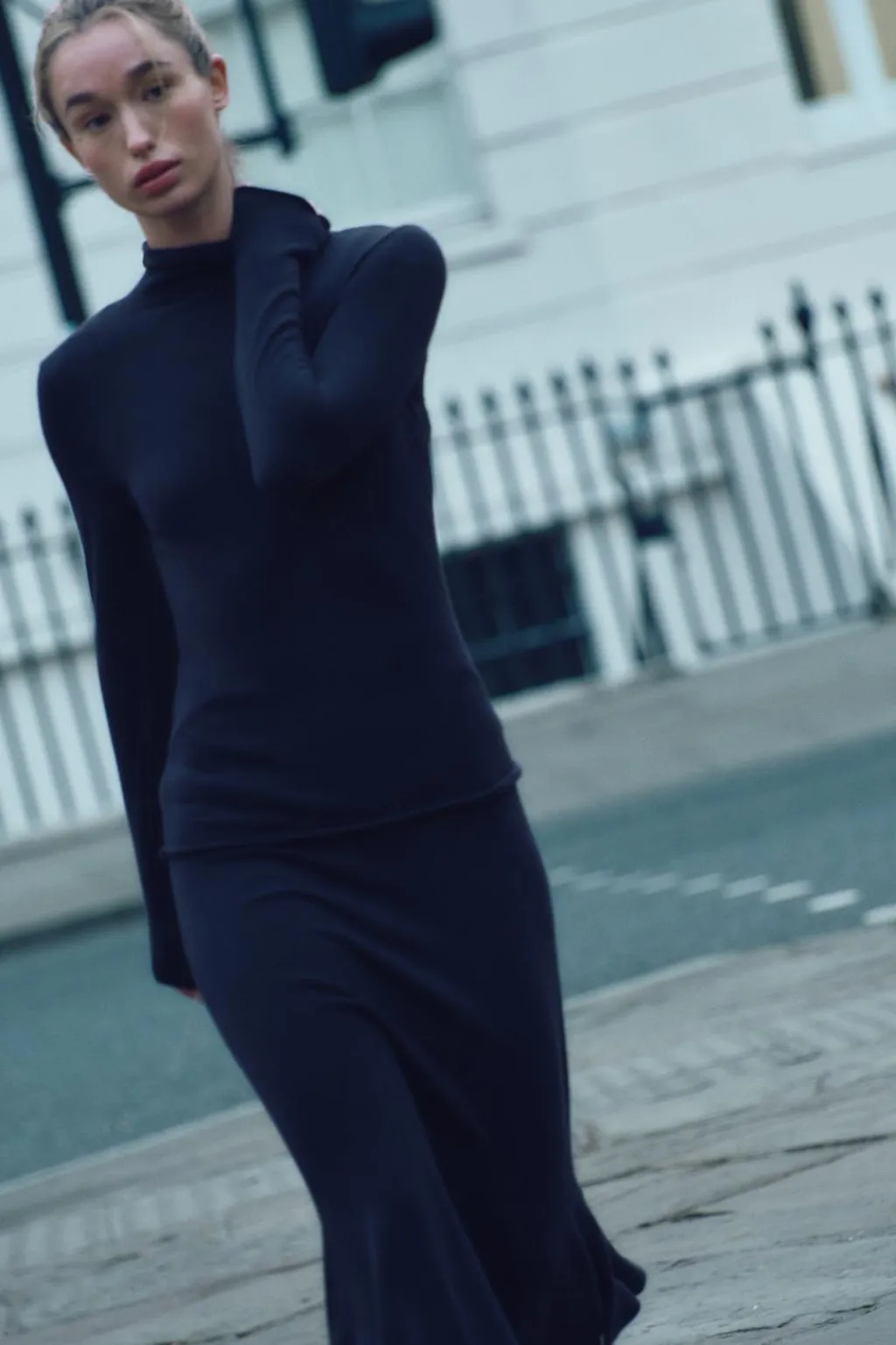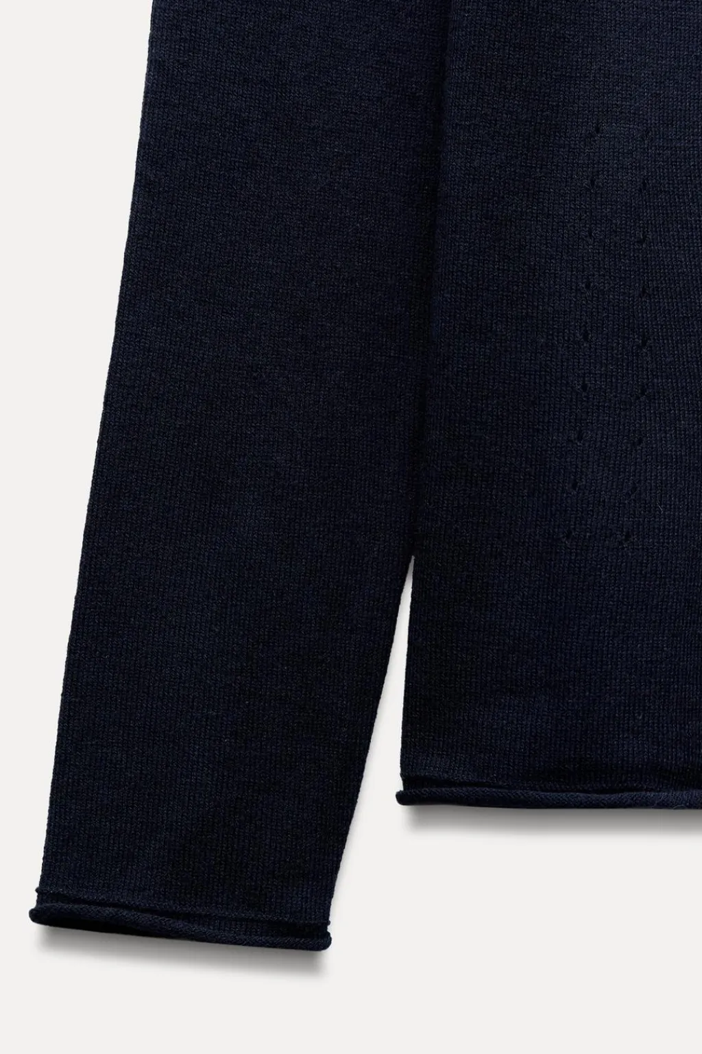 Jersey de punto liso confeccionado con lana. Cuello subido y manga larga.