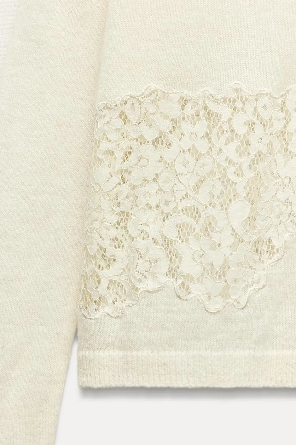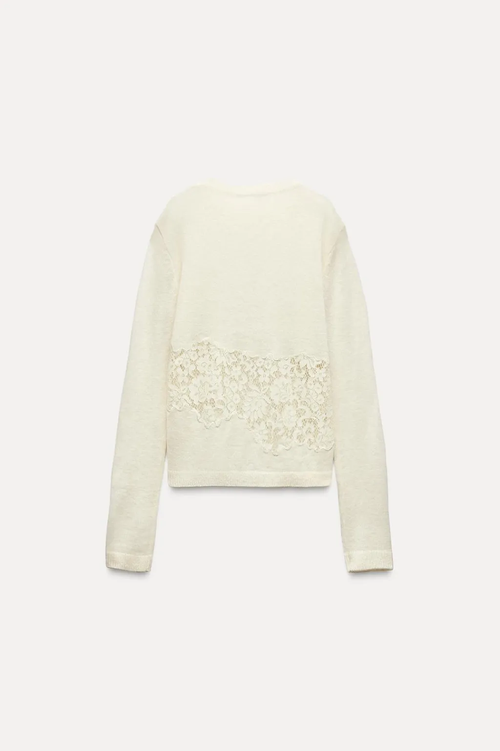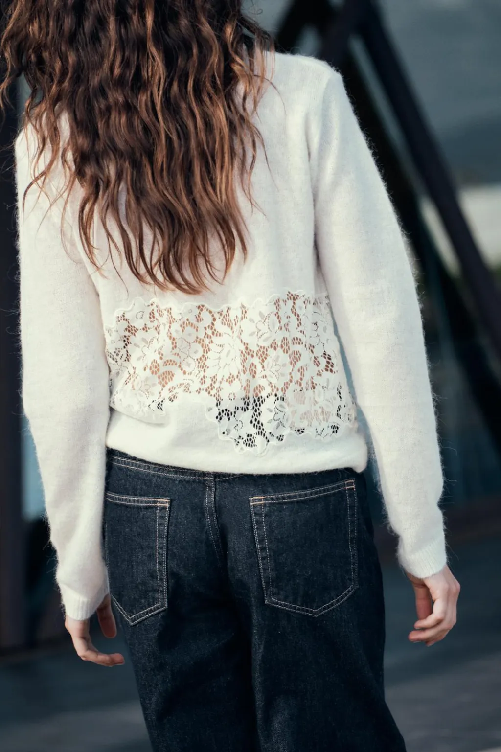 Jersey de cuello redondo y manga larga. Detalle de tejido combinado con encaje a tono. Acabados en rib.