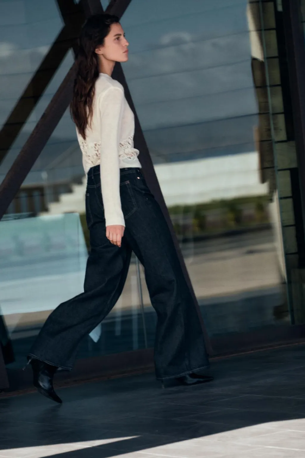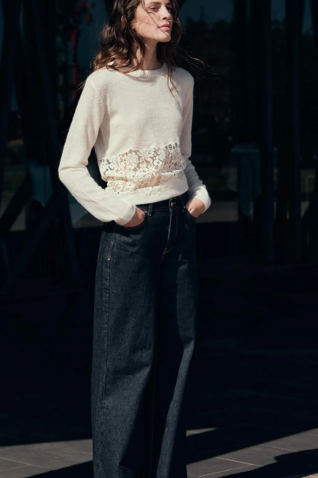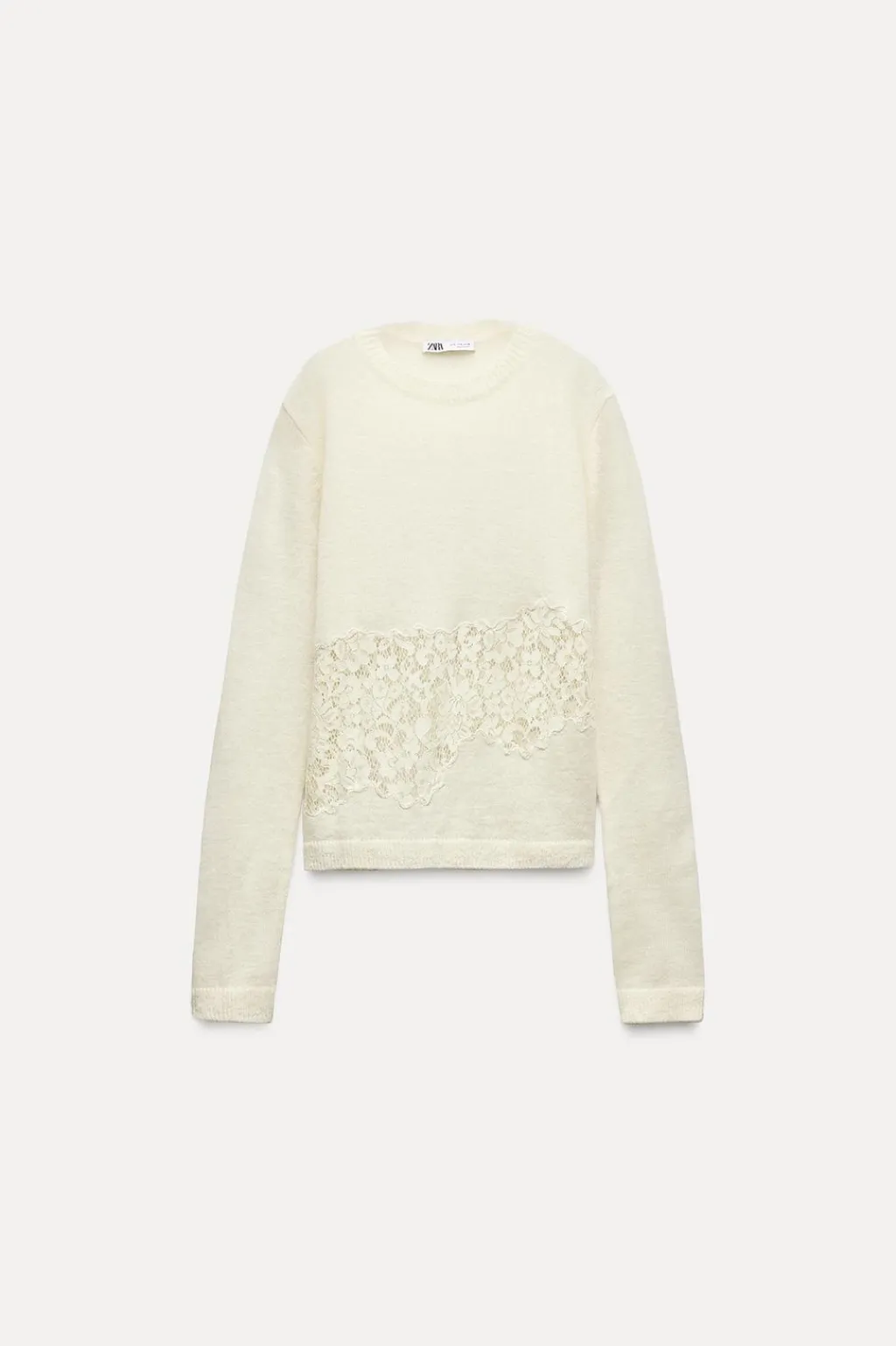 Jersey de cuello redondo y manga larga. Detalle de tejido combinado con encaje a tono. Acabados en rib.