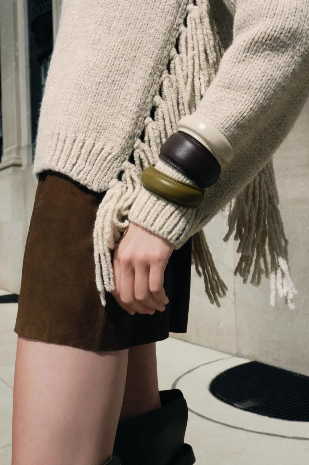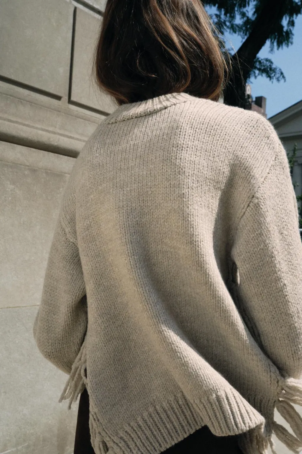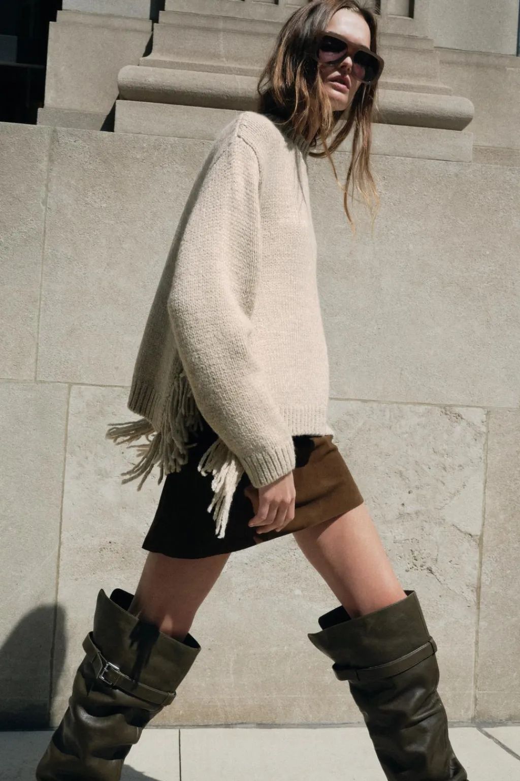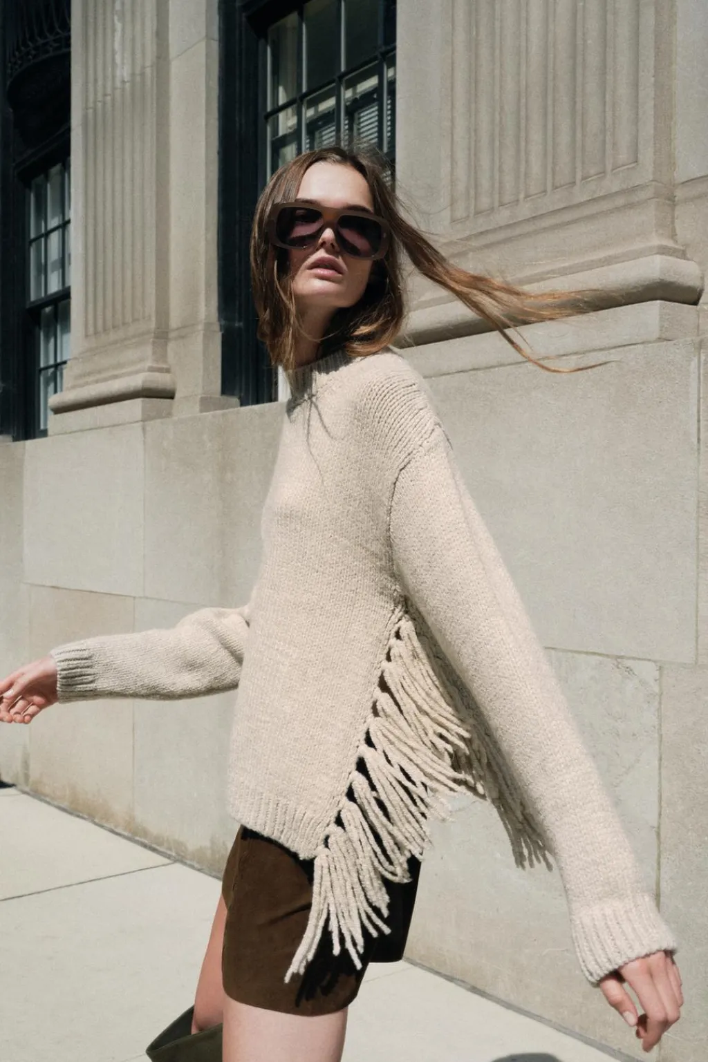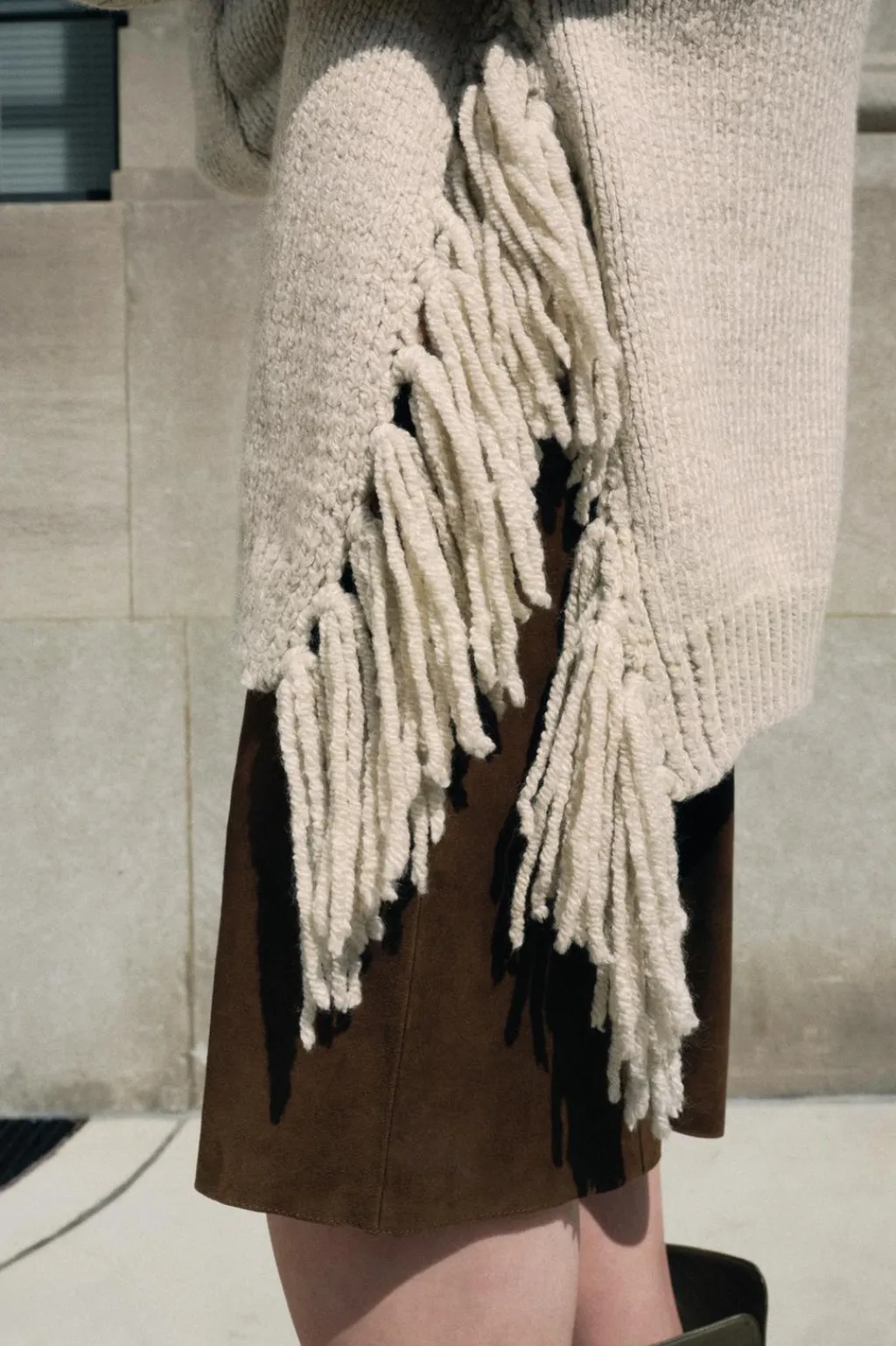 Jersey de cuello subido y manga larga. Bajo con aberturas laterales y flecos.