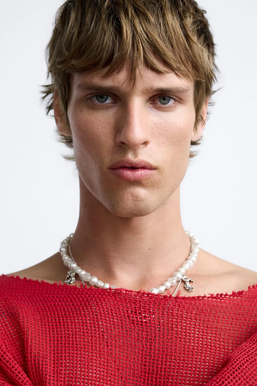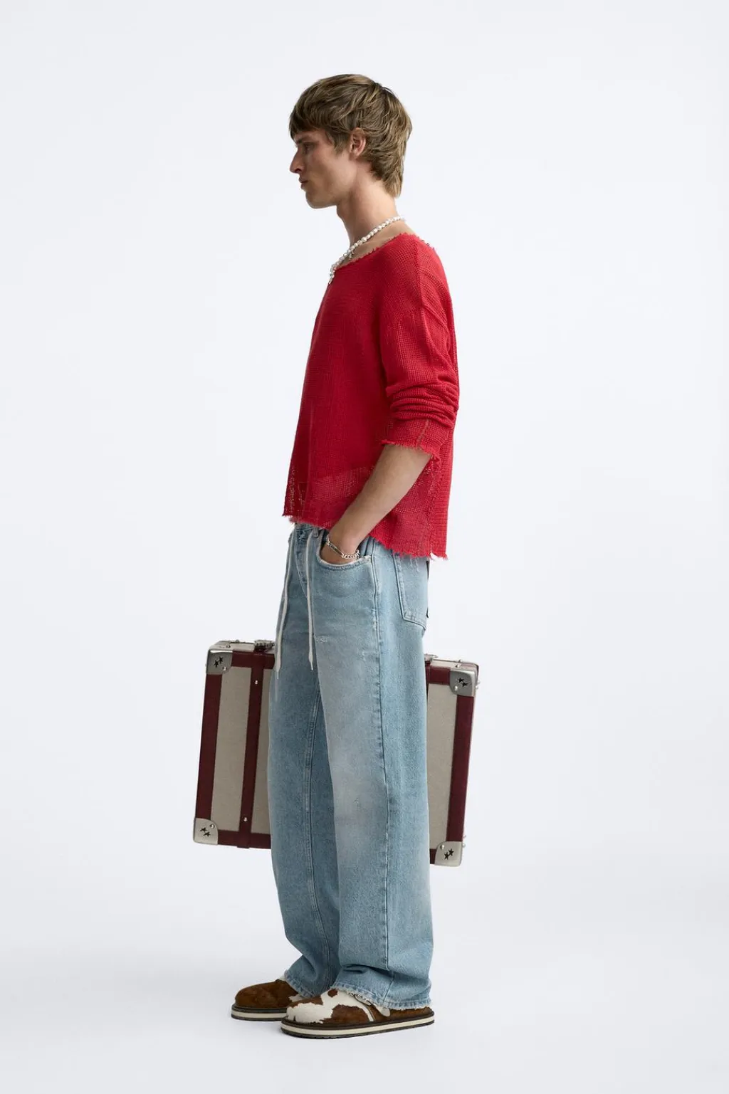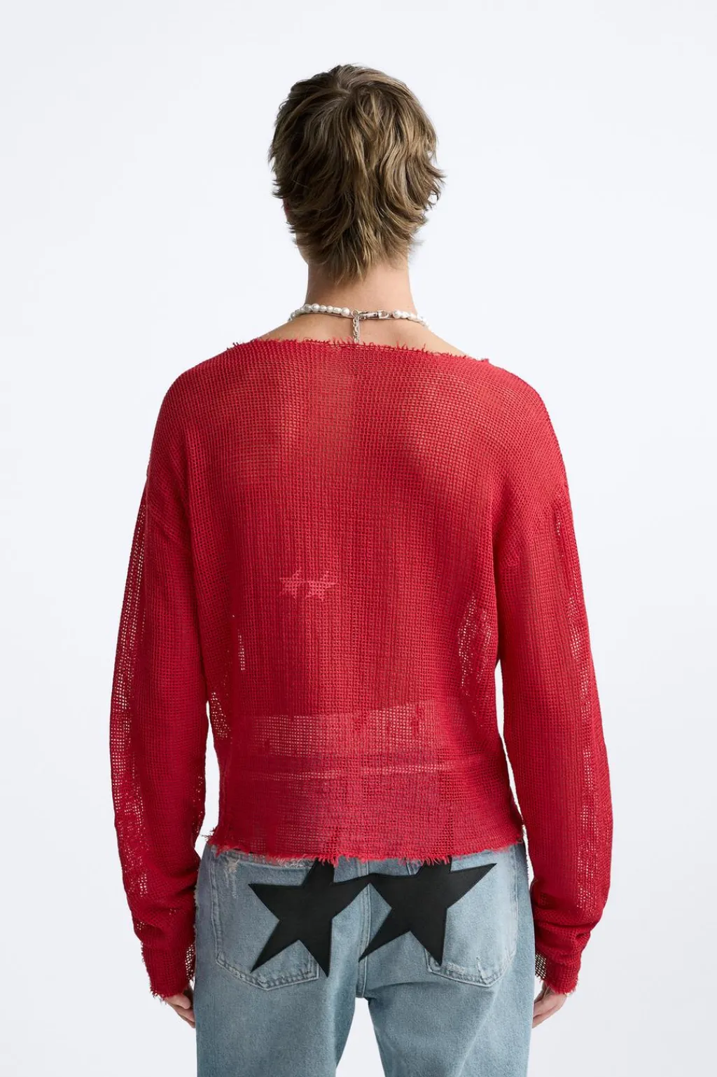 Jersey relaxed fit tejido en hilatura de algodón y estructura abierta. Cuello amplio y manga larga. Acabados irregulares.