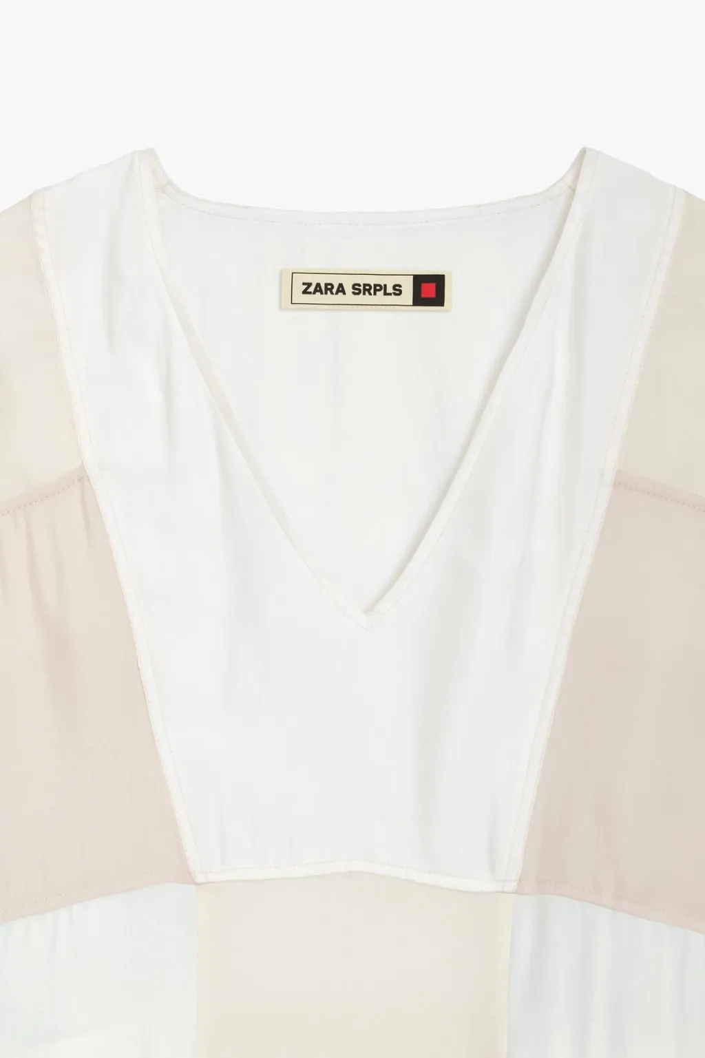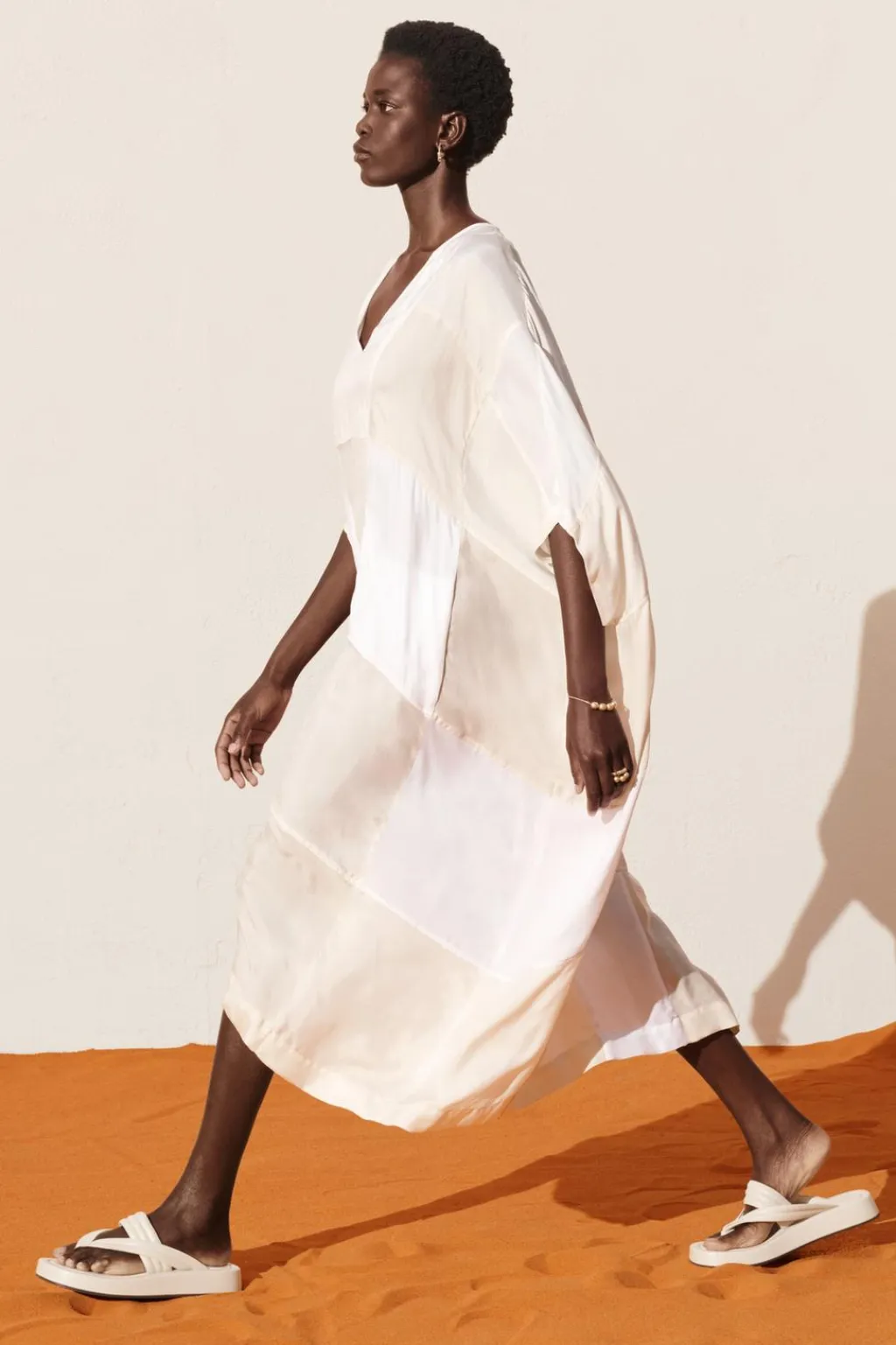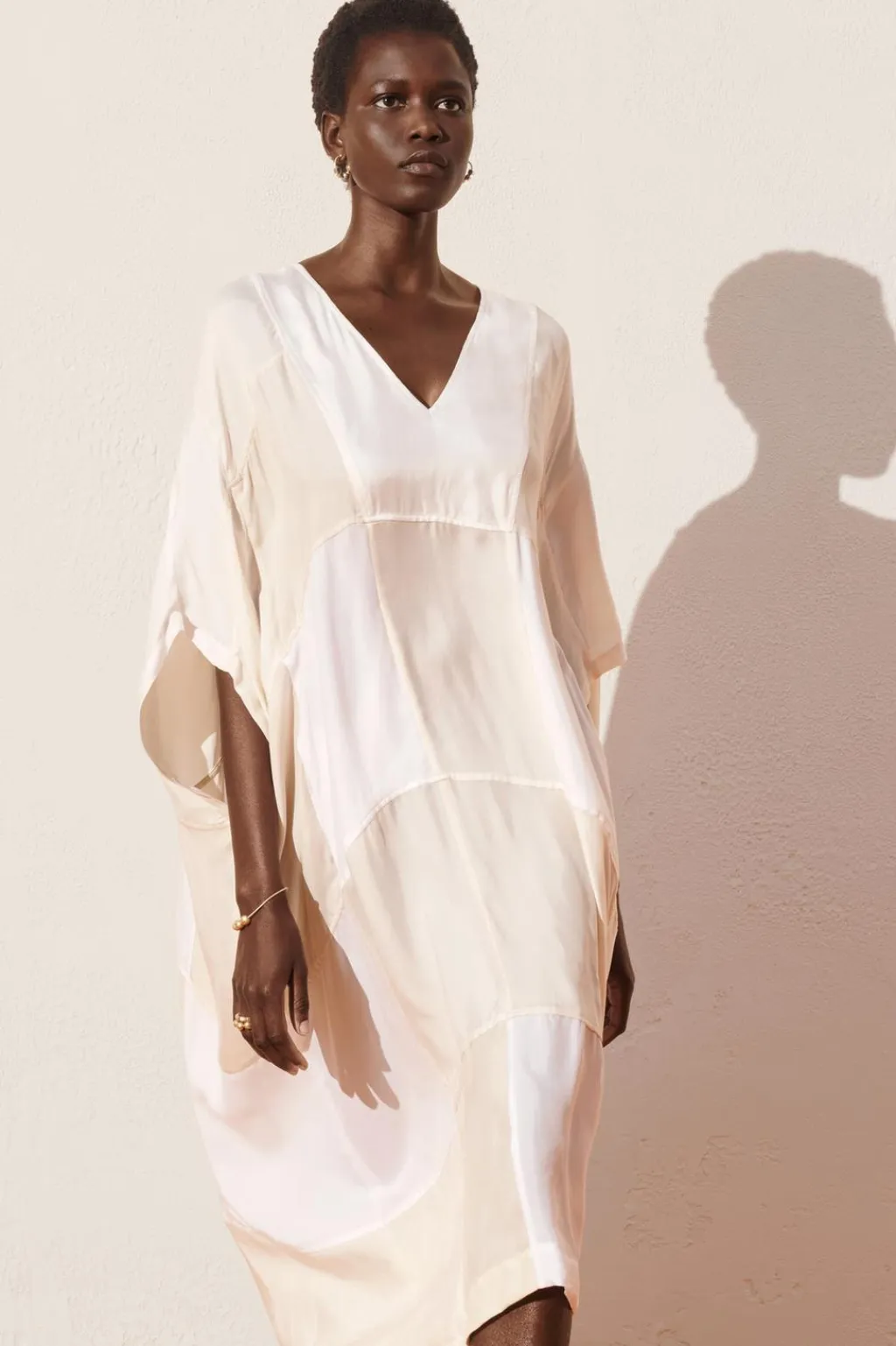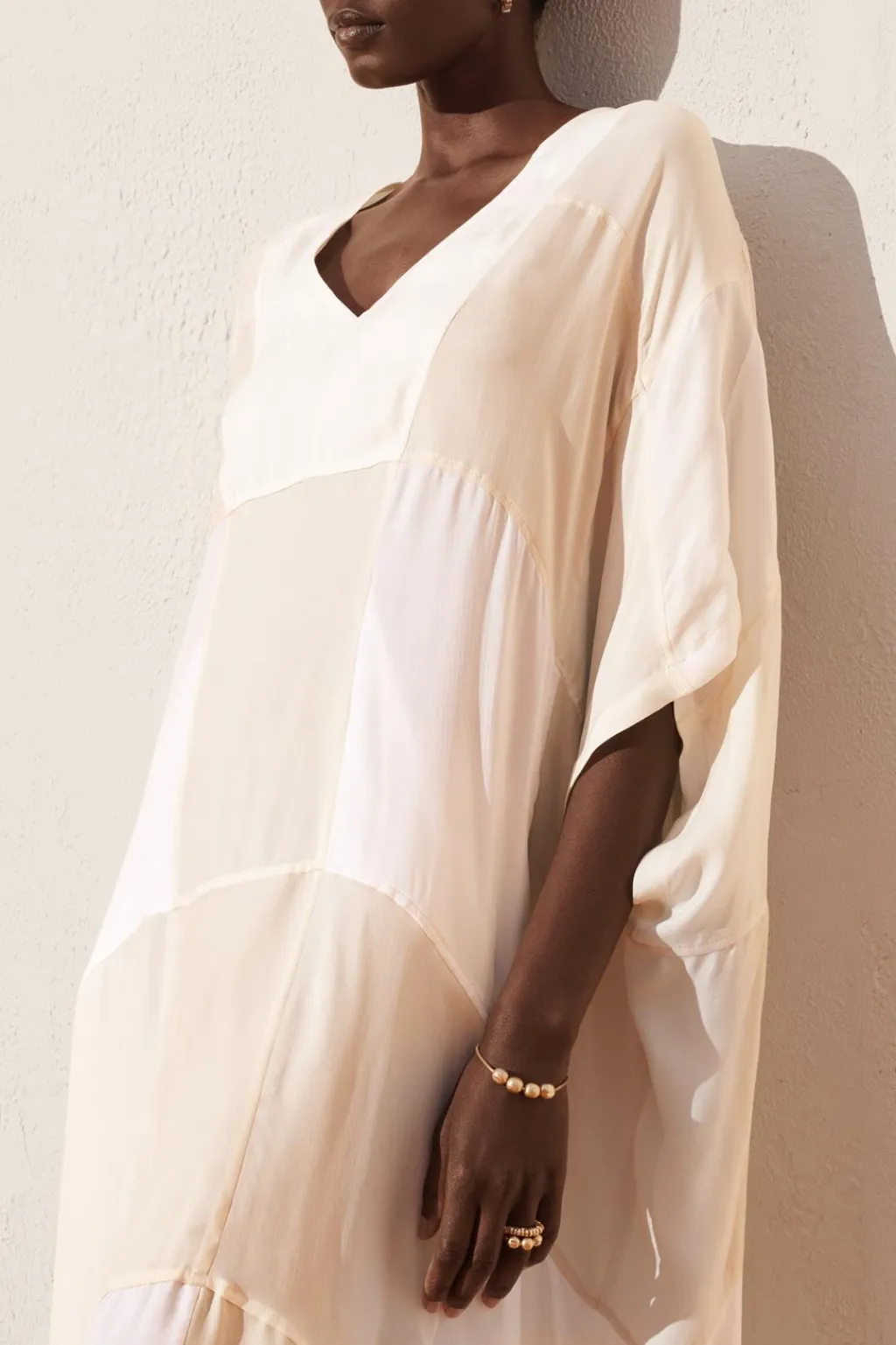Vestido tipo kaftán confeccionado en cupro 100%. Escote pico y manga corta. Detalle de combinación de tejidos tipo patchwork a contraste.