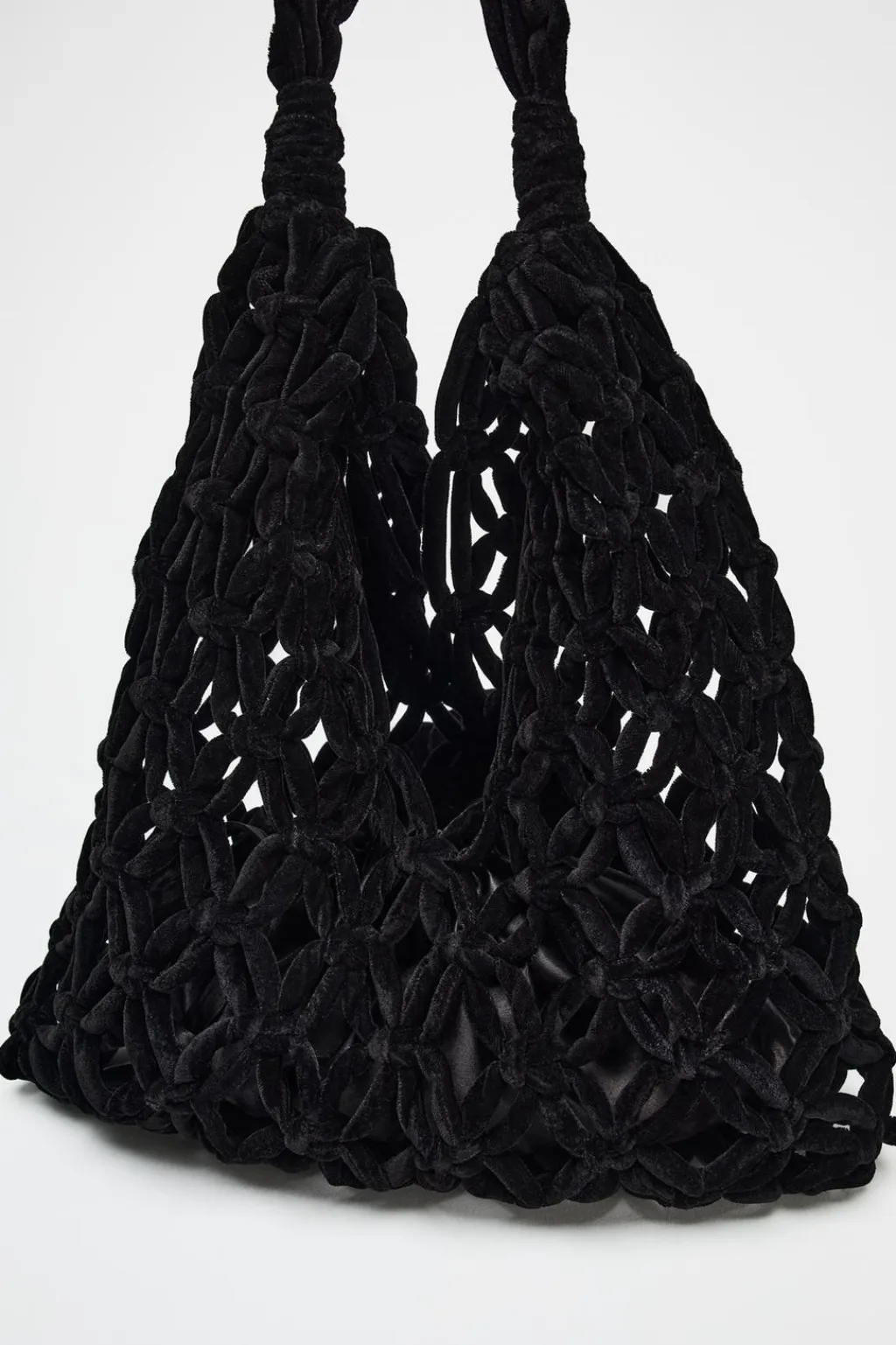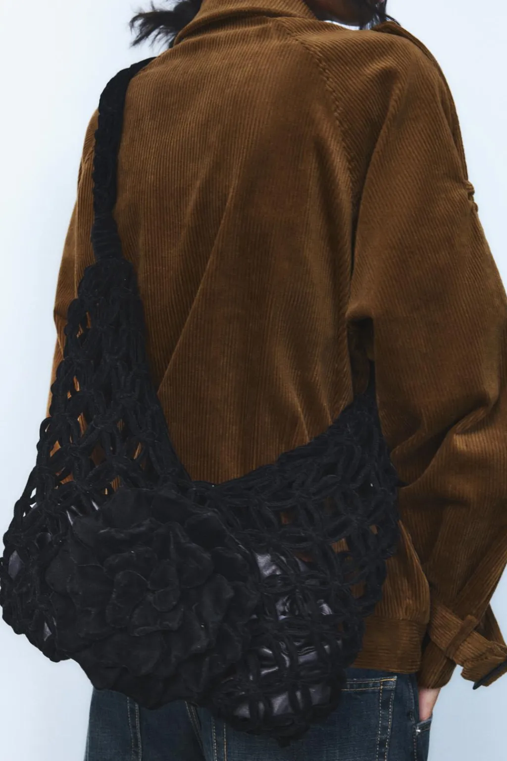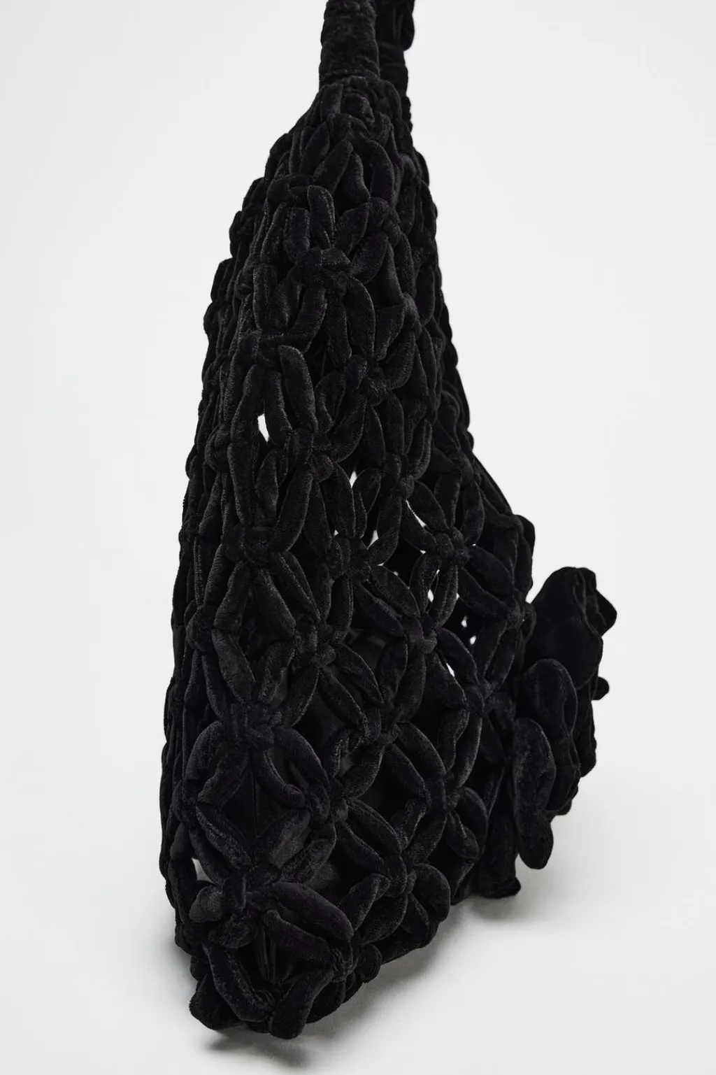 Bolso formato maxi saca en efecto terciopelo. Asa bandolera. Detalle de flor en la parte delantera. Bolsillo interior con cierre mediante fruncido.