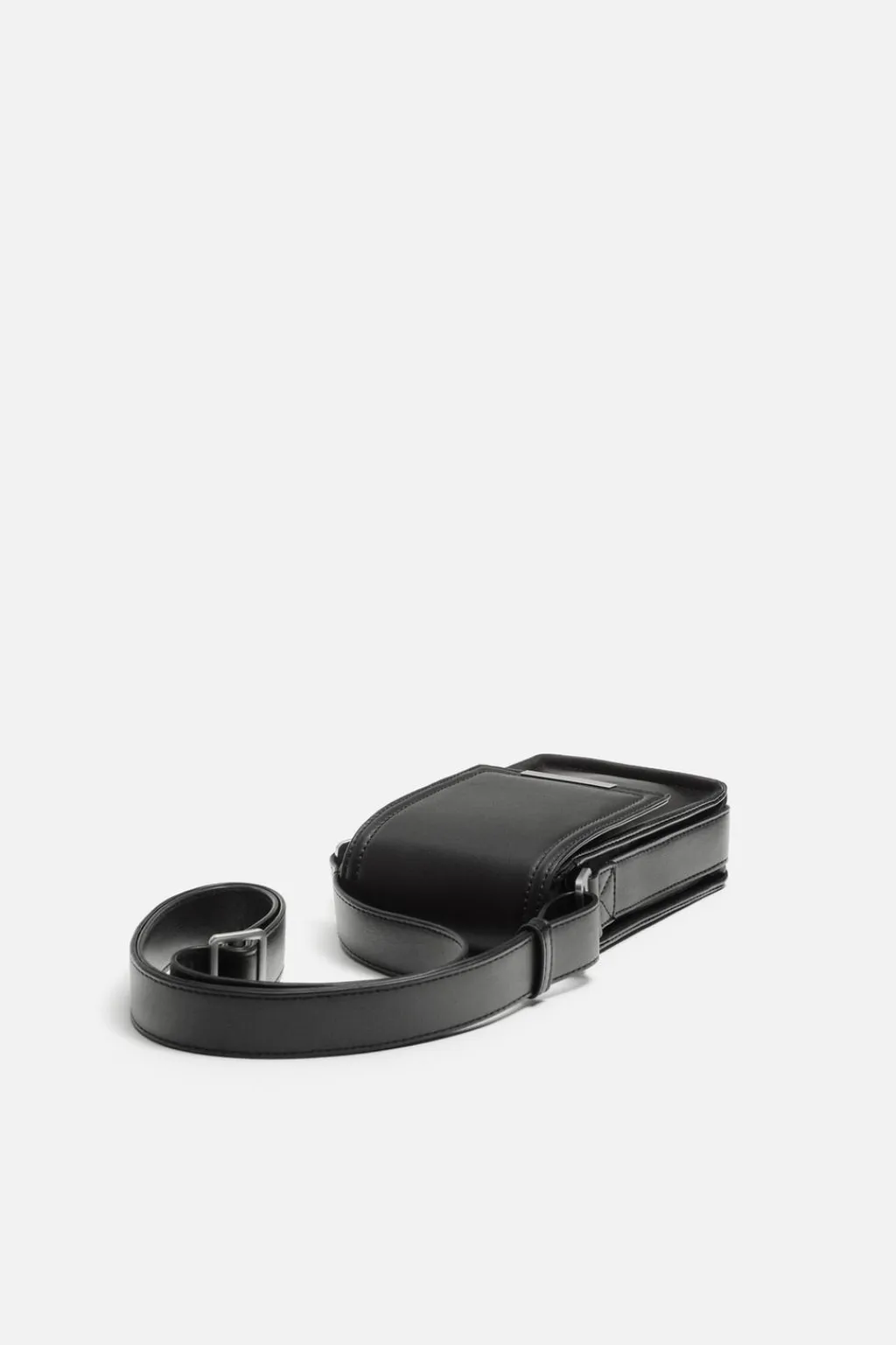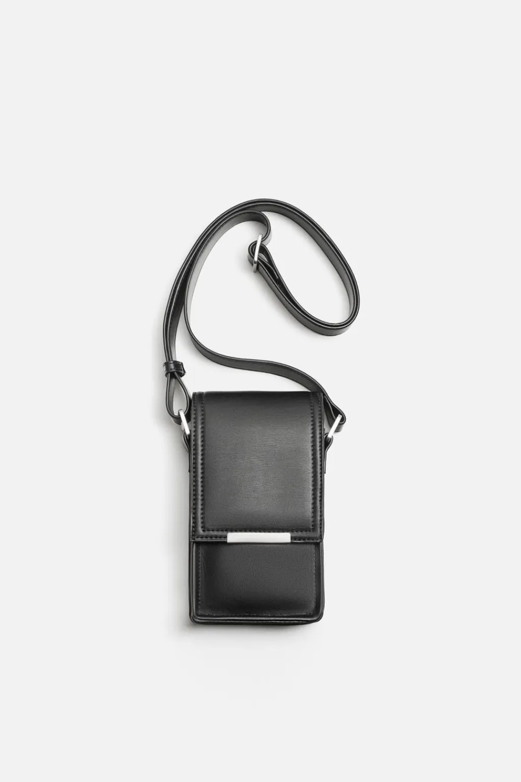 Mini bandolera vertical. Compartimento principal con cierre mediante solapa. El interior cuenta con un bolsillo plano. Compartimento secundario en la parte trasera. Asa de hombro ajustable.