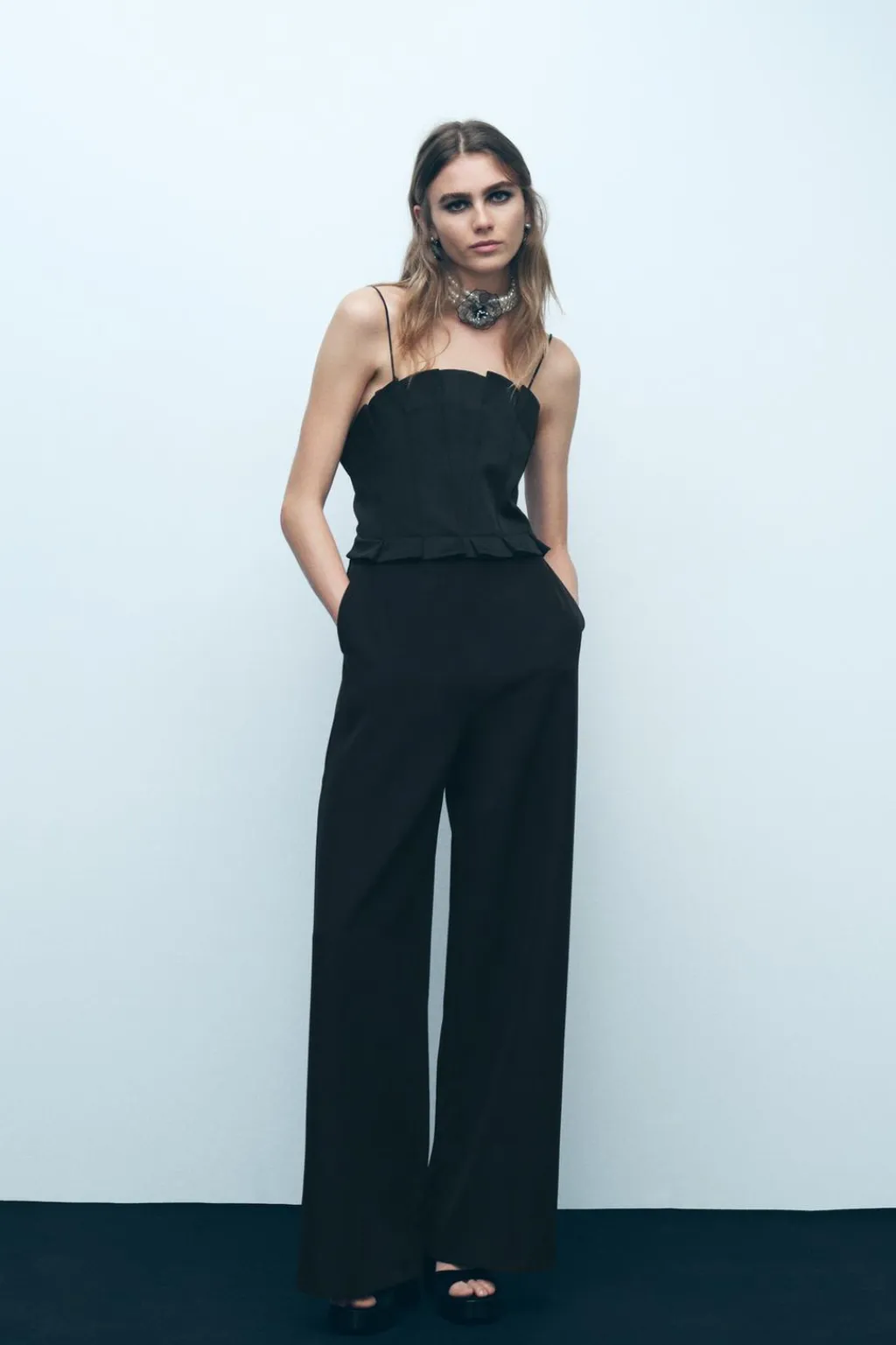 Mono de escote recto con pliegues y hombros descubiertos. Pernera ancha. Cierre en espalda con cremallera oculta en costura.