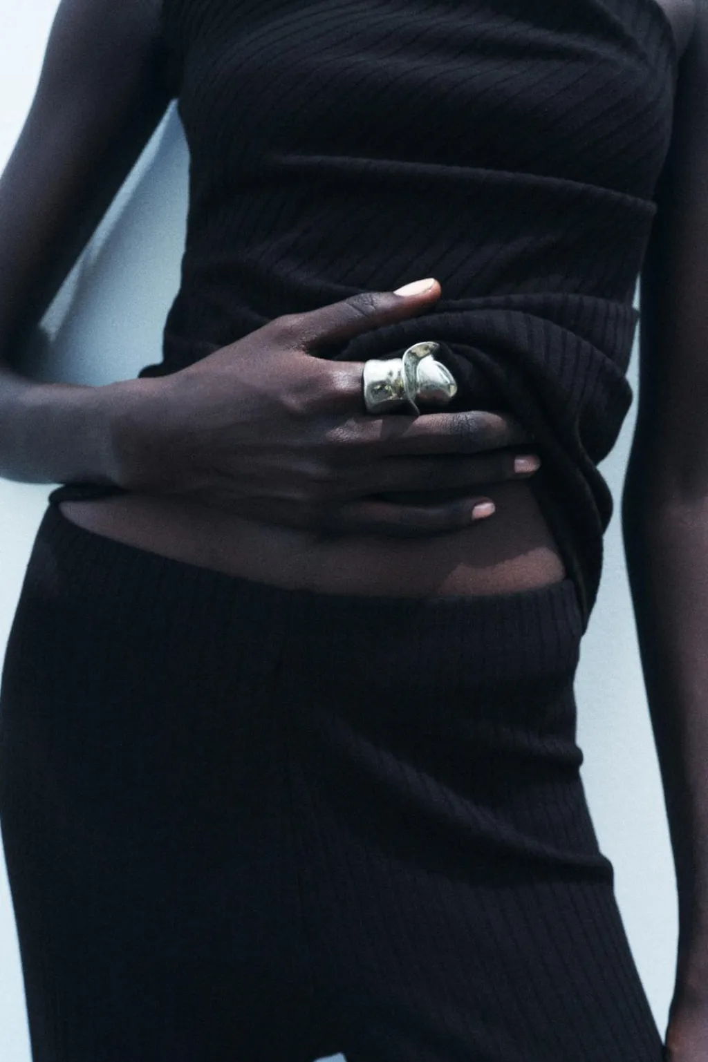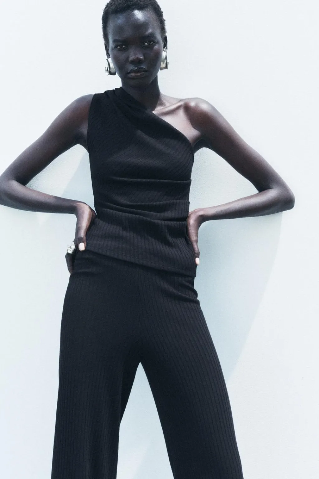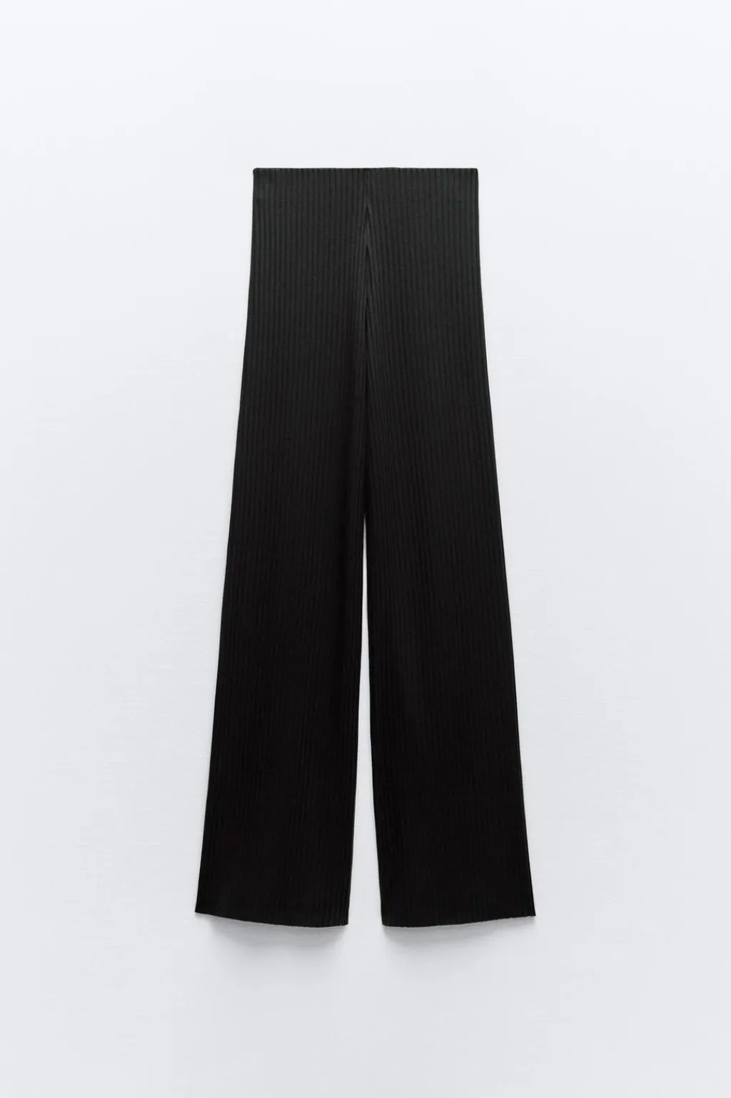 Pantalón de tiro medio y cintura con elástico interior. Pierna ancha. Bajo acabado sin costura.