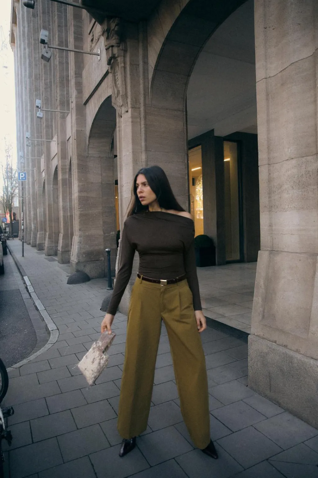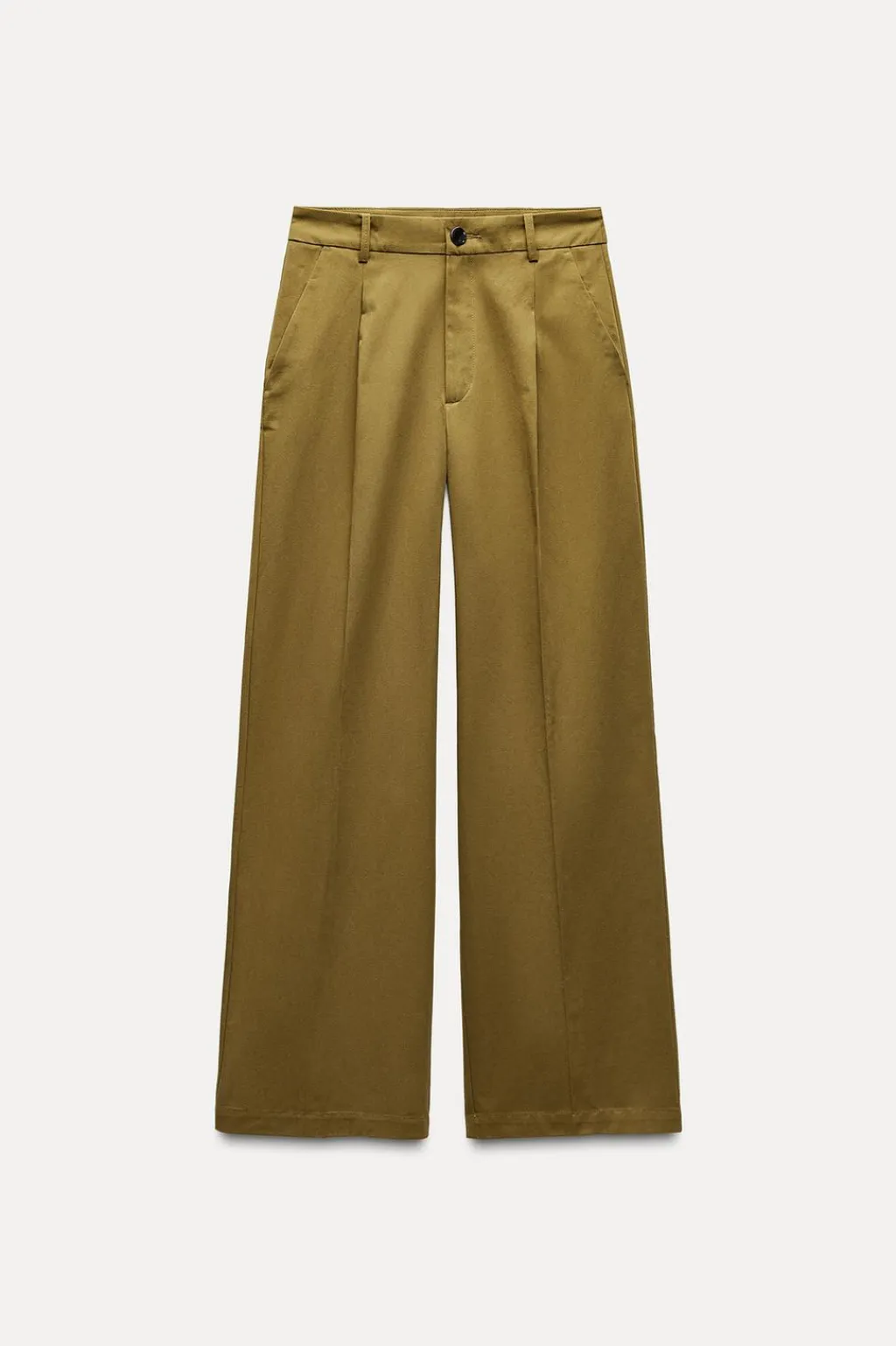 Pantalón de tiro alto con pinzas delanteras. Bolsillos frontales y falsos bolsillos con solapa en espalda. Detalle de trabilla trasera. Pernera ancha. Cierre frontal con cremallera y botón.