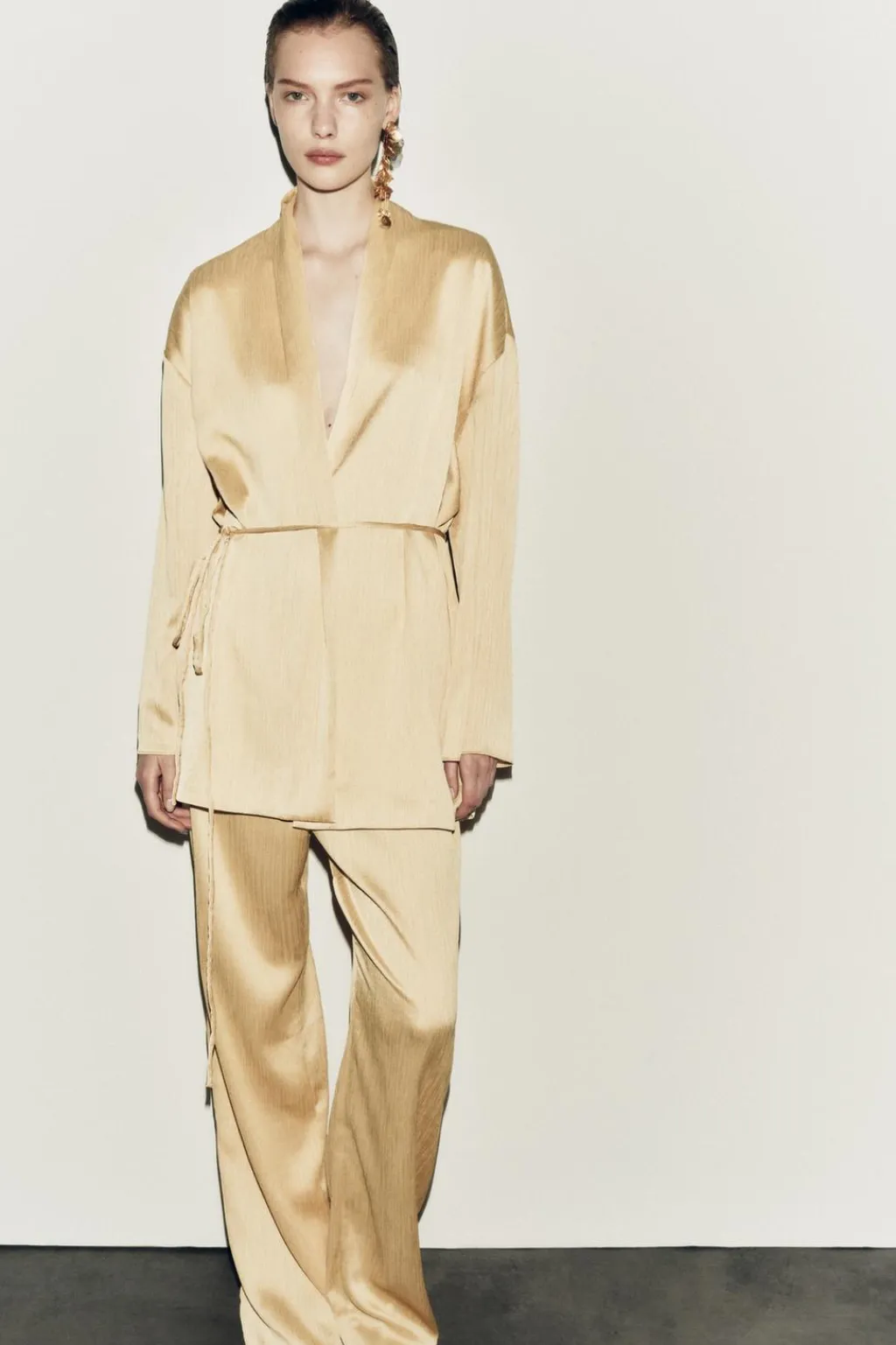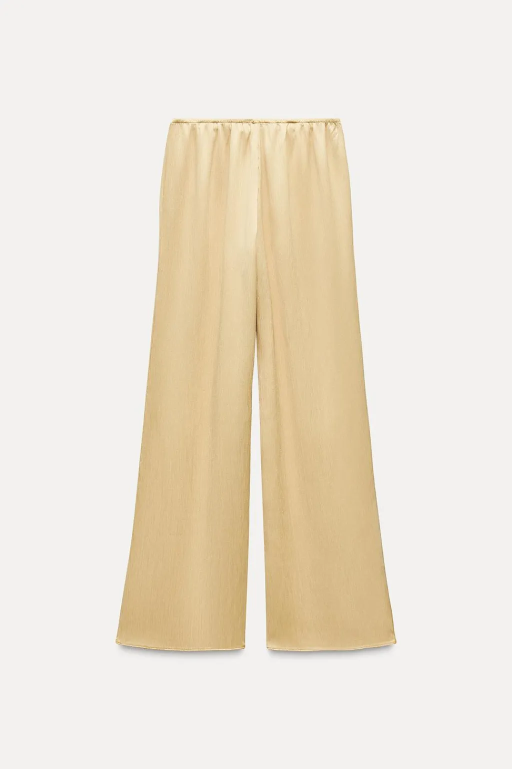 Pantalón de tiro medio y cintura elástica. Detalle de tejido plisado. Pierna ancha.