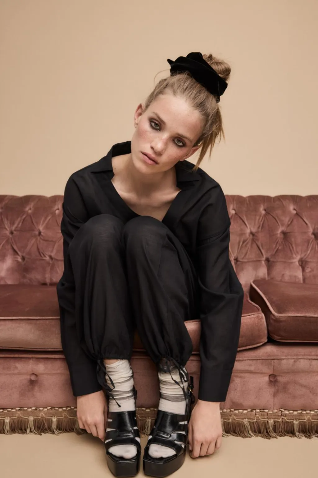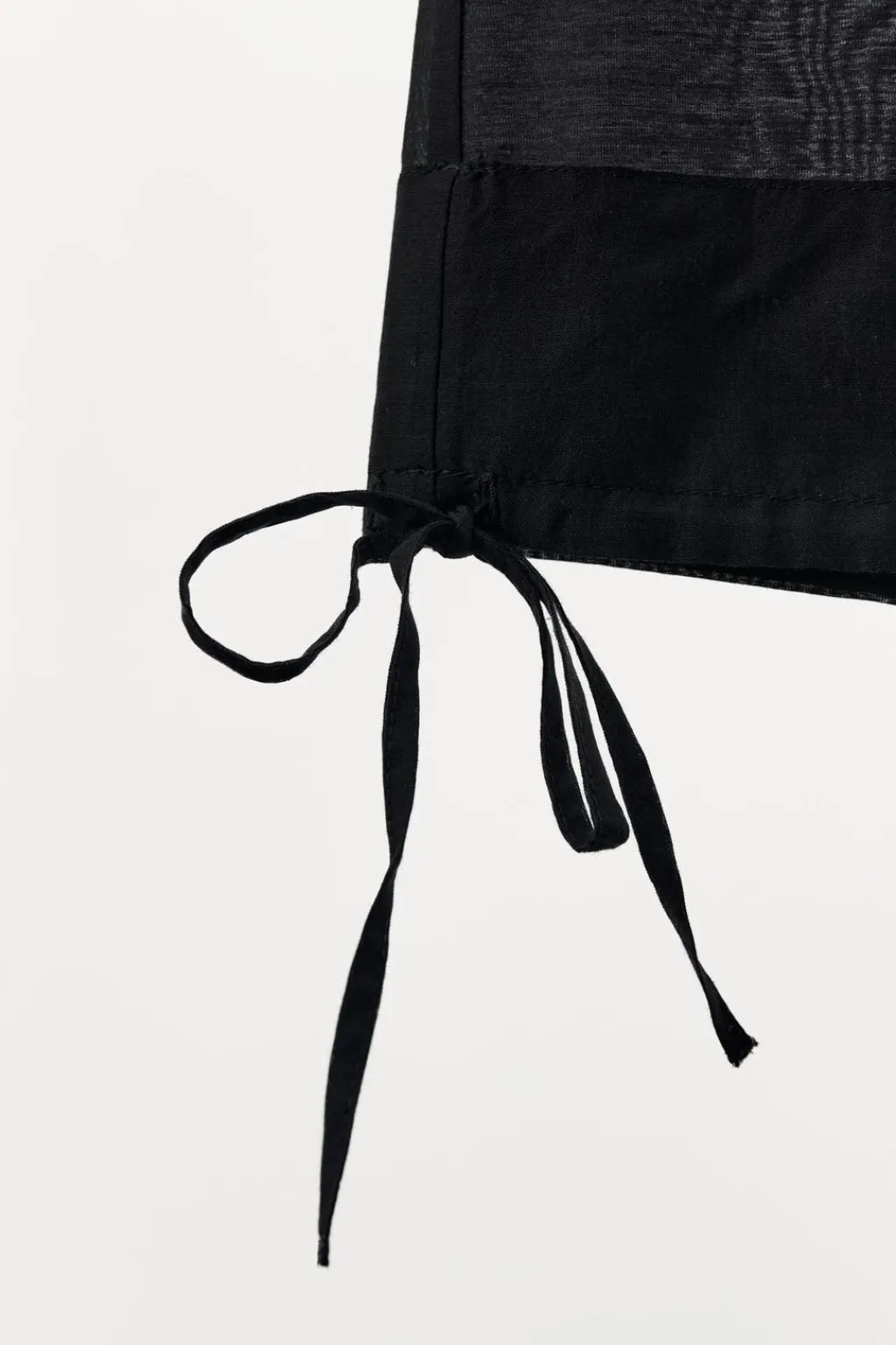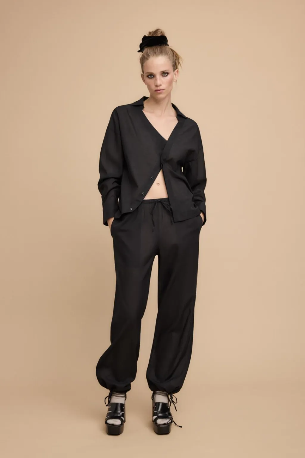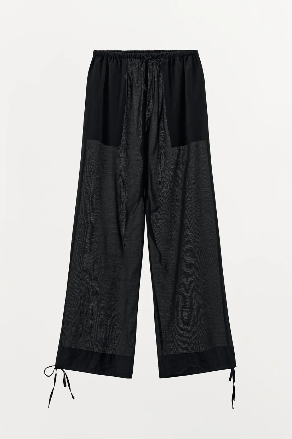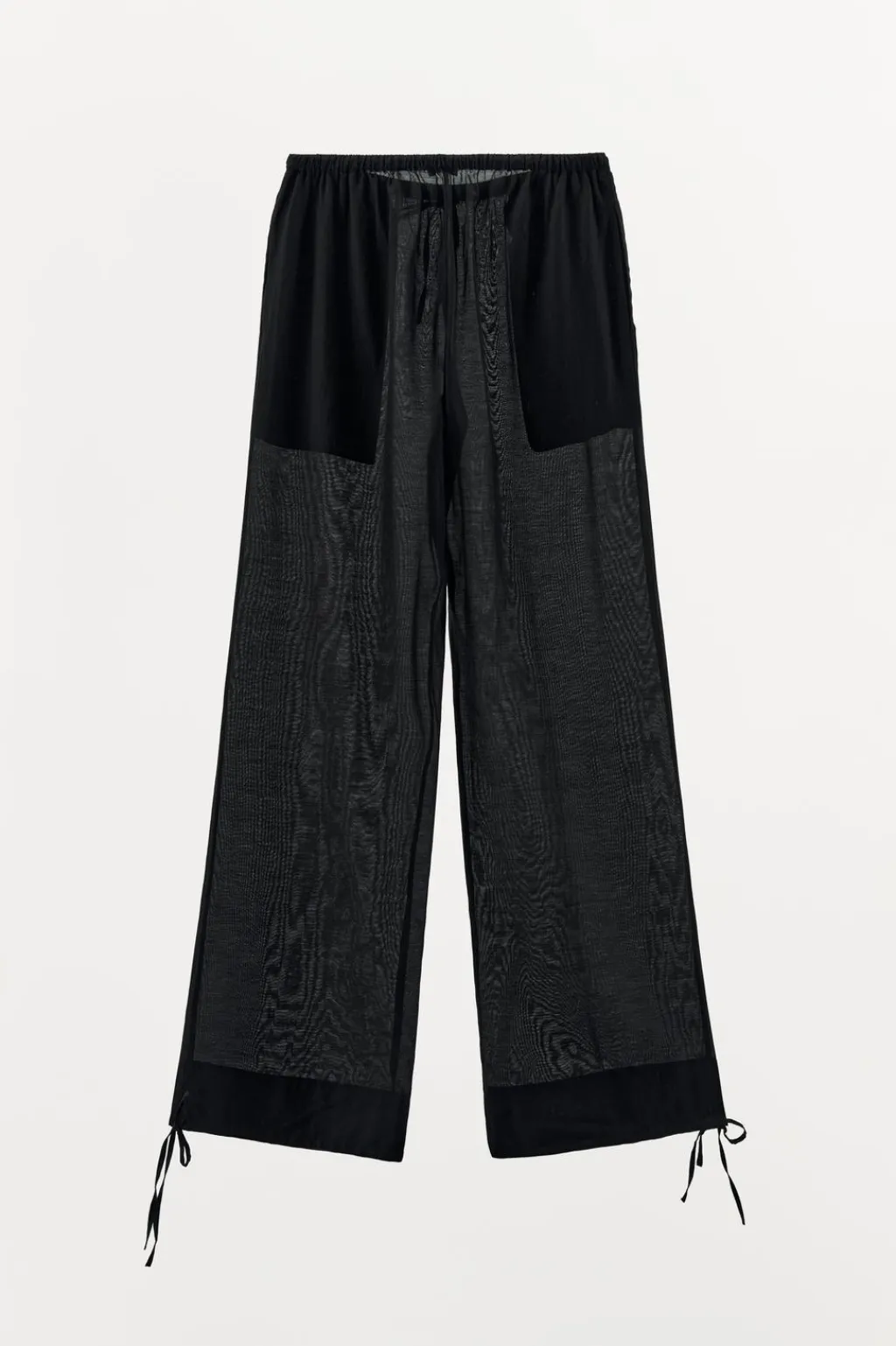 Pantalón semitransparente confeccionado en mezcla de viscosa. Tiro medio y cintura elástica ajustable con lazada. Bolsillos laterales ocultos en costura. Bajos ajustables con lazadas.