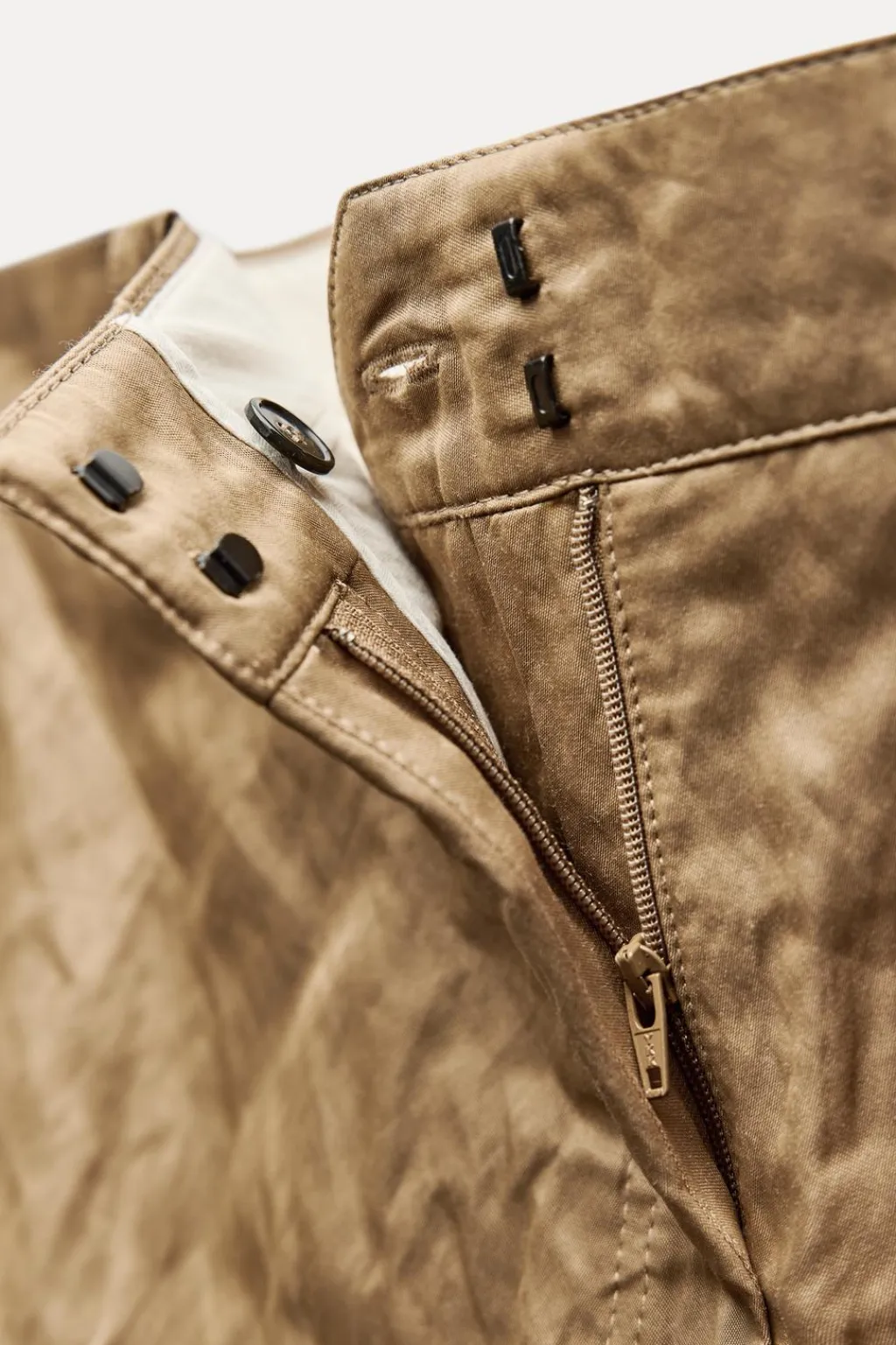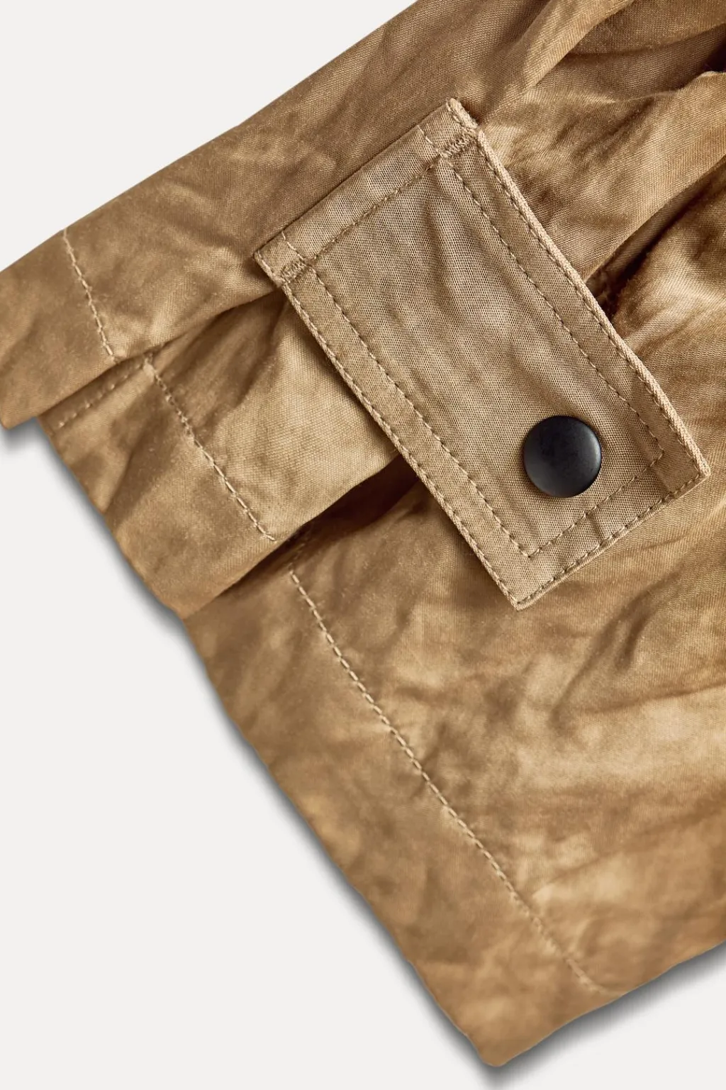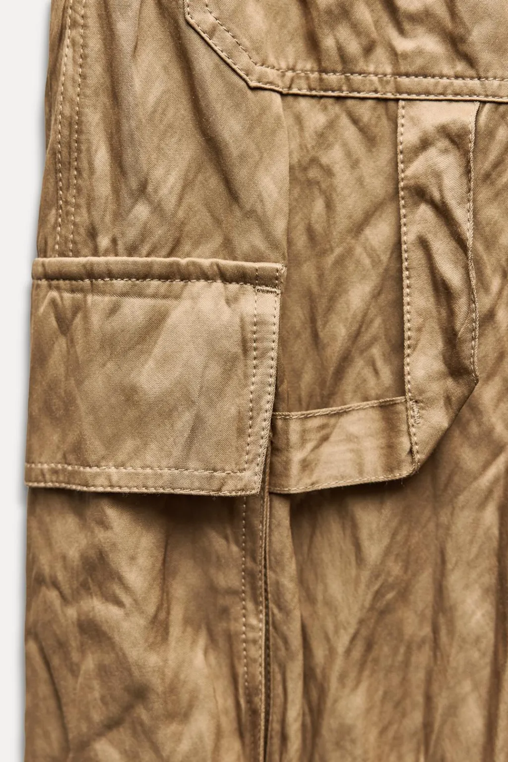 Pantalón confeccionado en hilatura con algodón. Tiro medio y cintura con trabillas. Bolsillos de plastrón con solapa en pierna. Detalle de tejido arrugado. Cierre frontal con cremallera, botón y gancho metálico.
