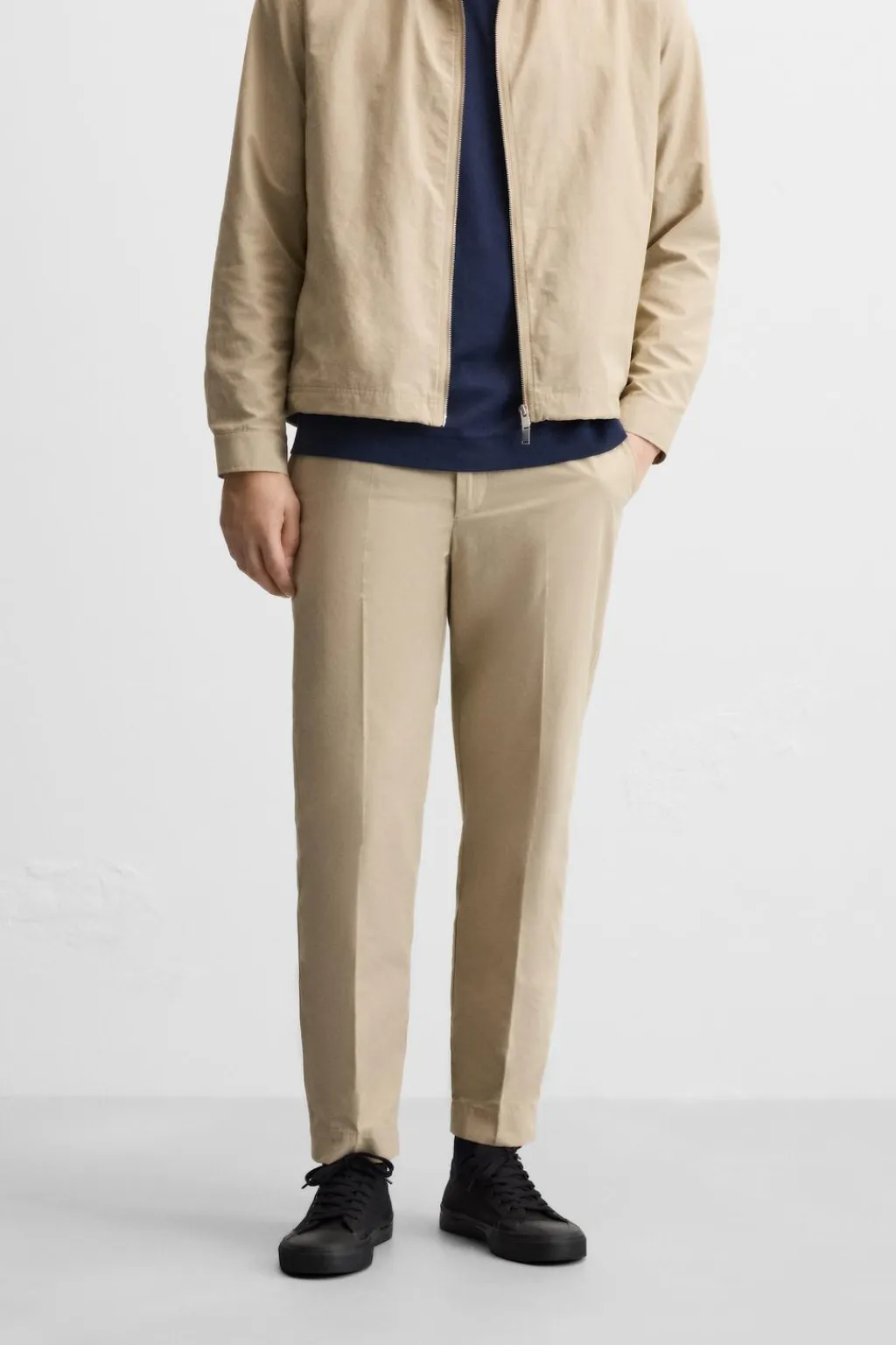 Pantalón slim fit confeccionado en tejido técnico ligero. Bolsillos frontales y detalle de bolsillos traseros de vivo. Cierre frontal con cremallera y botón.