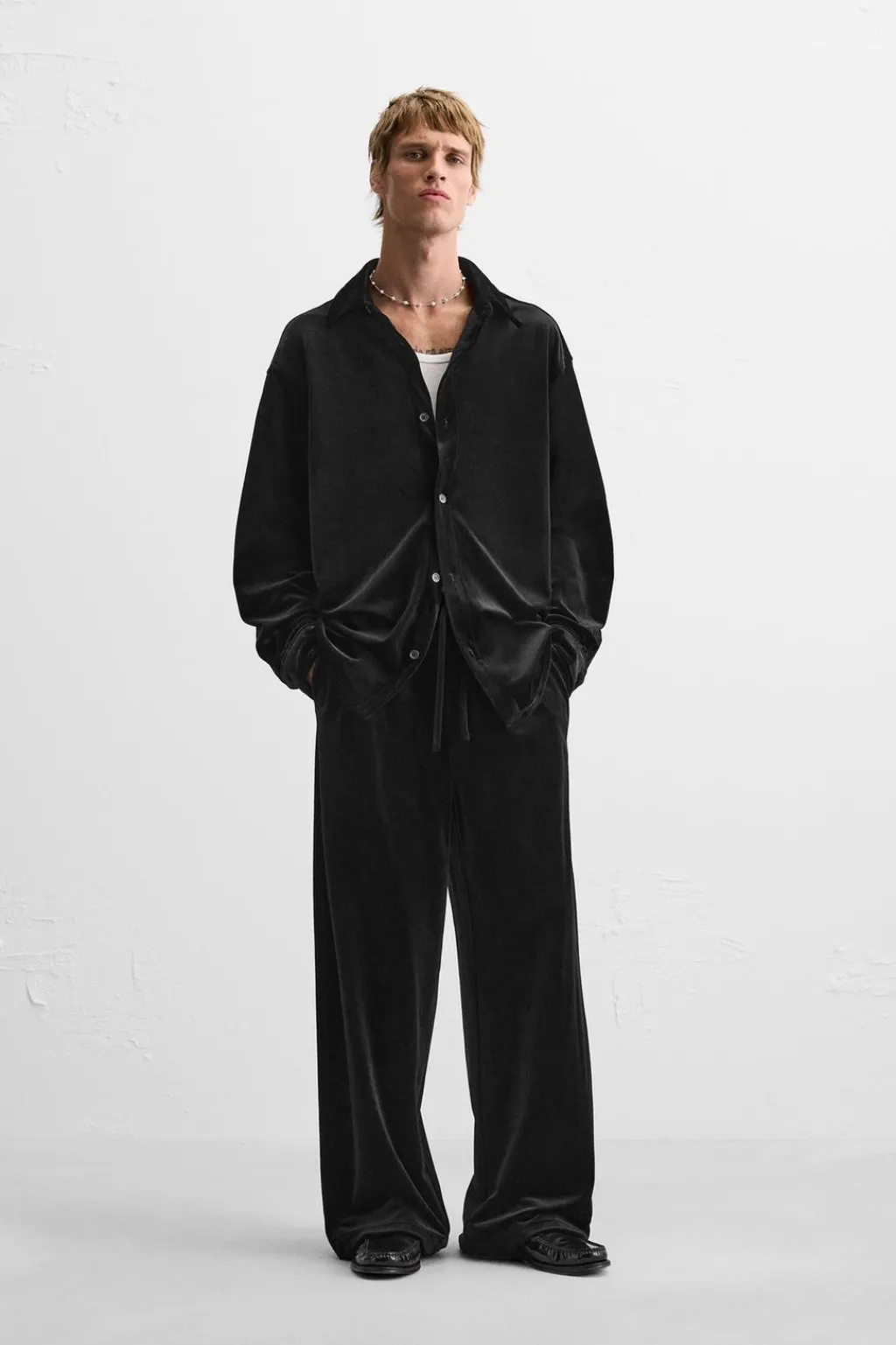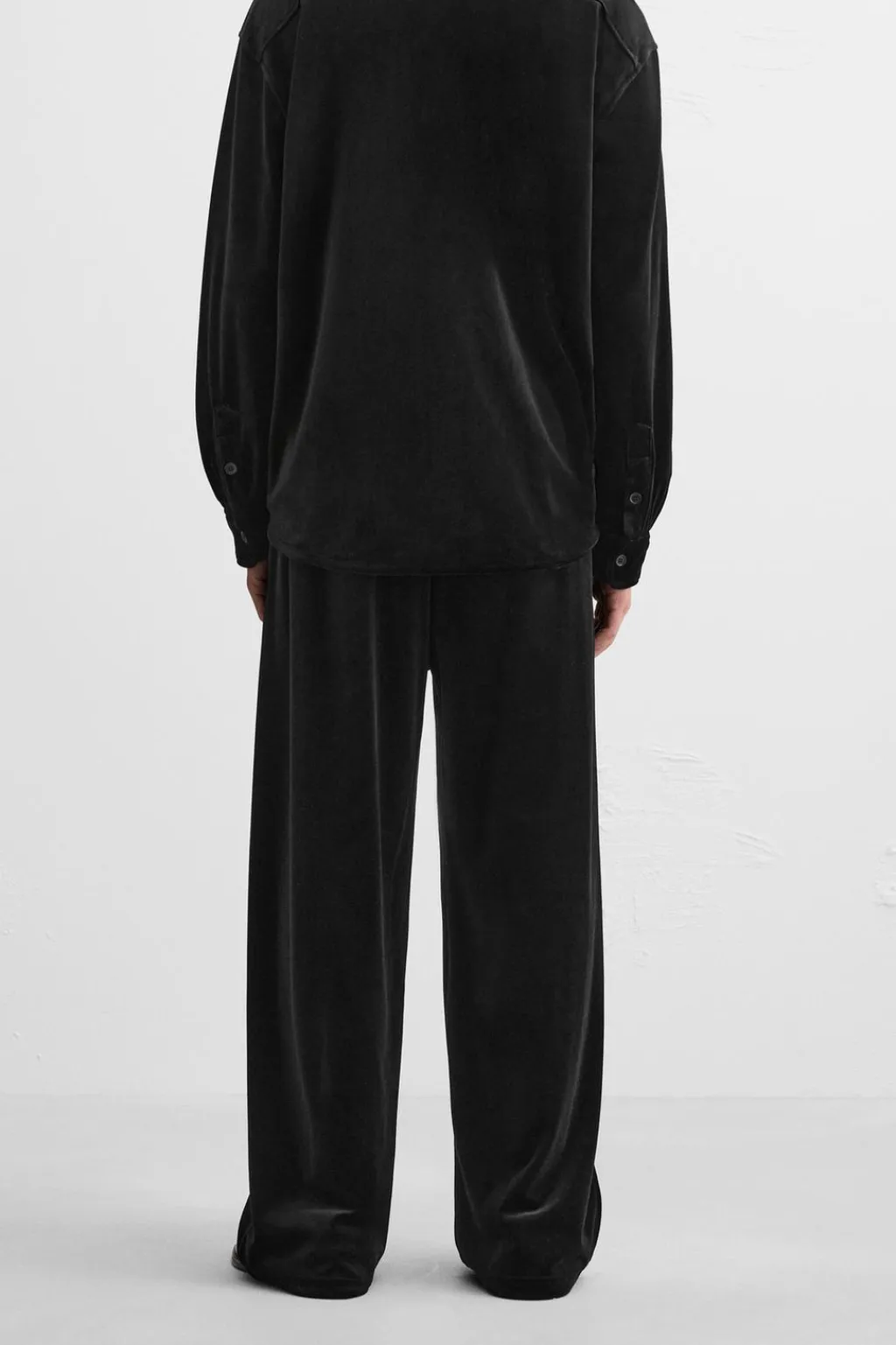 Pantalón relaxed fit confeccionado en tejido con acabado terciopelo. Cintura elástica ajustable con cordones en delantero. Bolsillos frontales y detalle de bolsillos traseros de vivo.