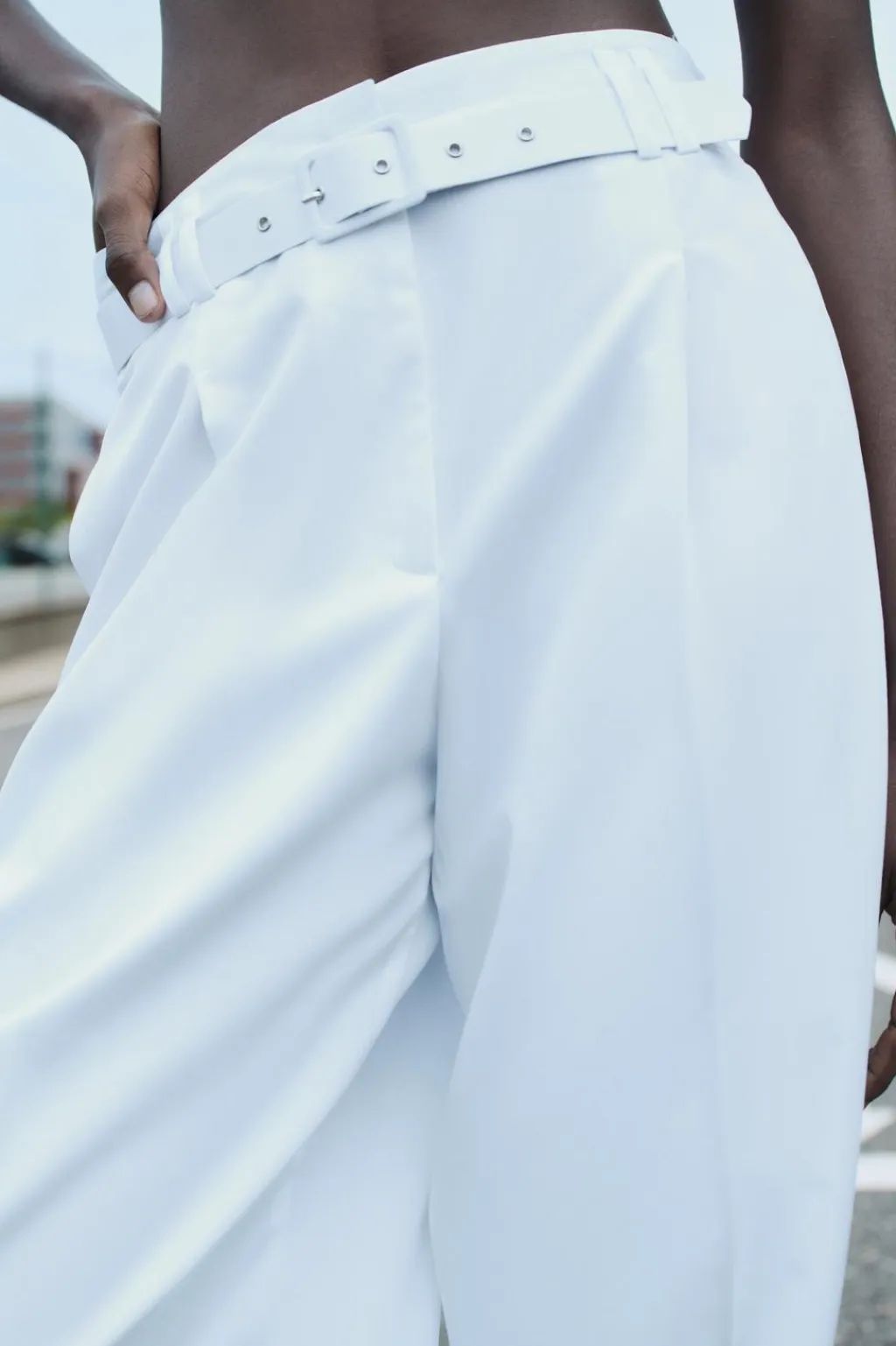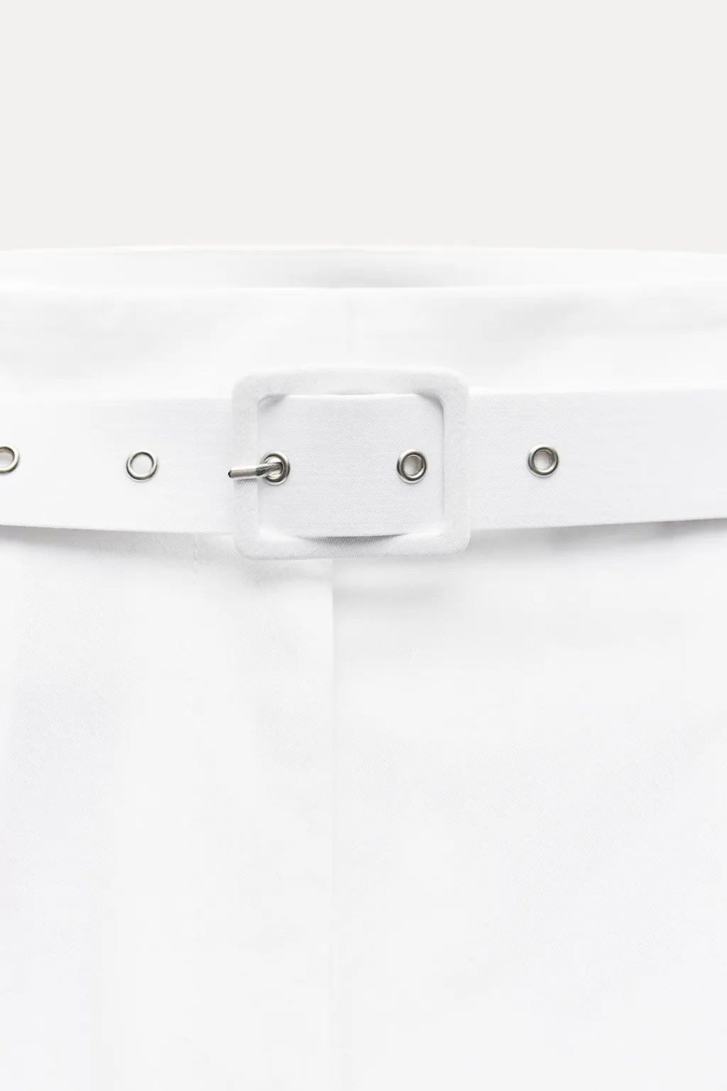 Pantalón de tiro alto con pinzas. Bolsillos laterales y detalle de solapas en espalda. Cinturón con hebilla forrada. Cierre frontal con cremallera, botón interior y ganchos metálicos.