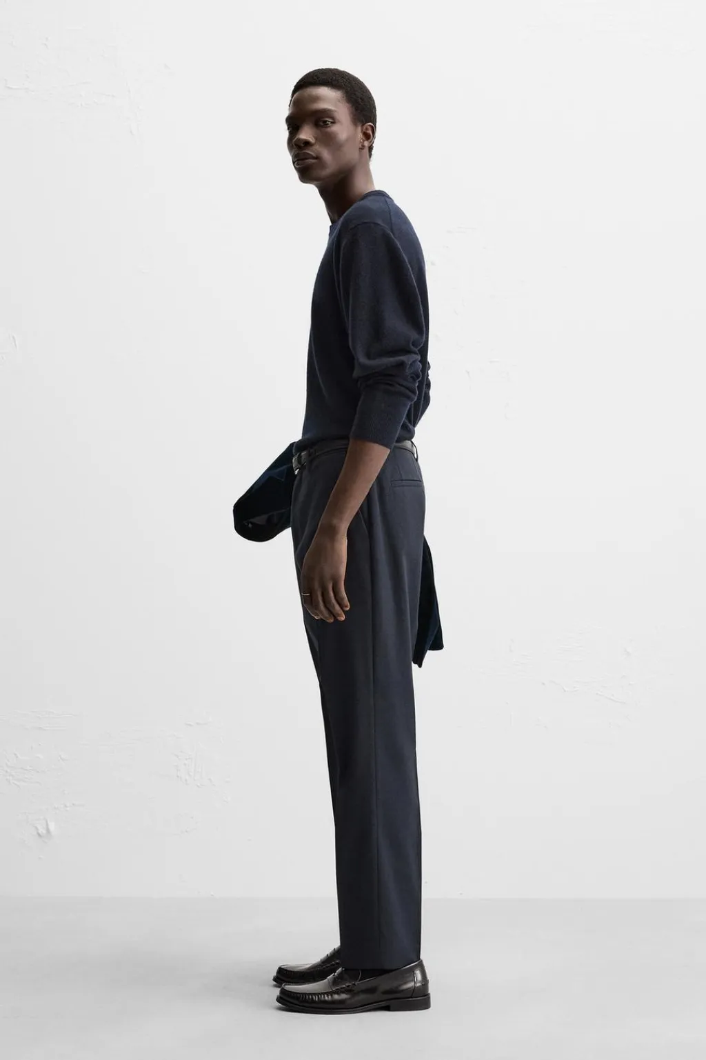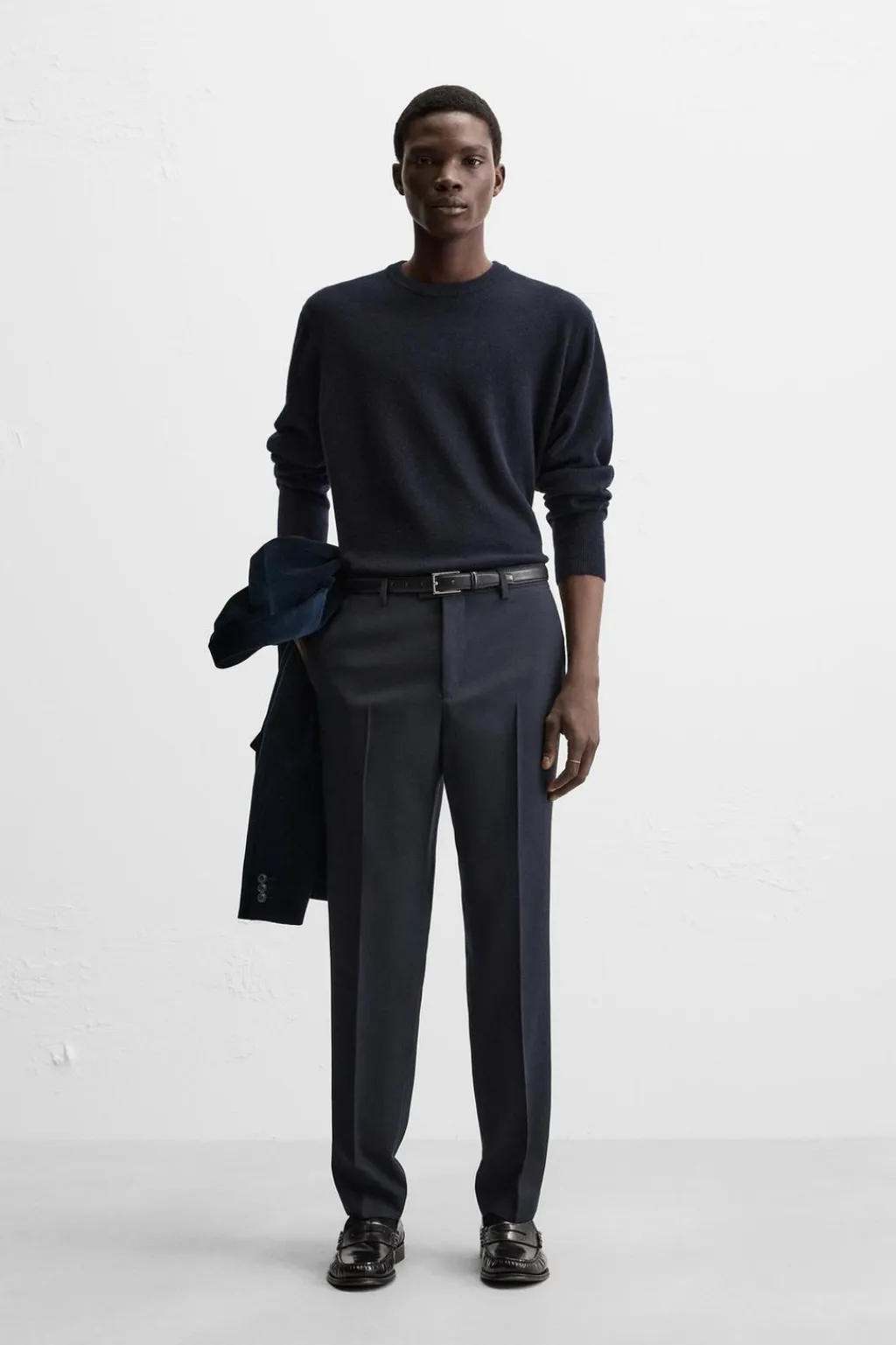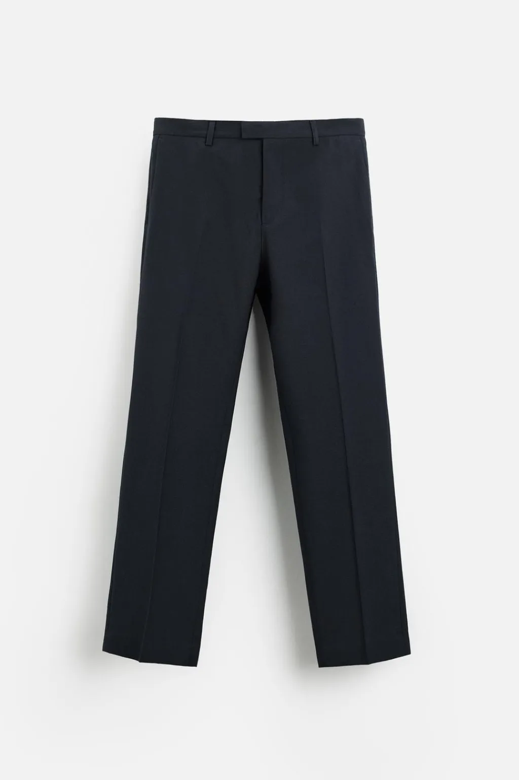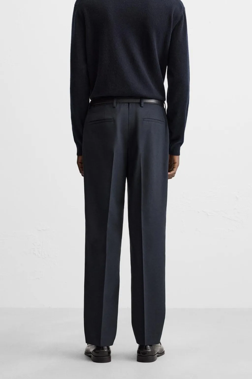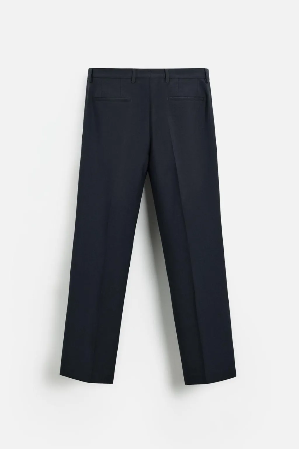 Pantalón regular fit confeccionado en tejido con lana. Bolsillos delanteros y detalle de bolsillos traseros de vivo. Cierre frontal con cremallera y botón.