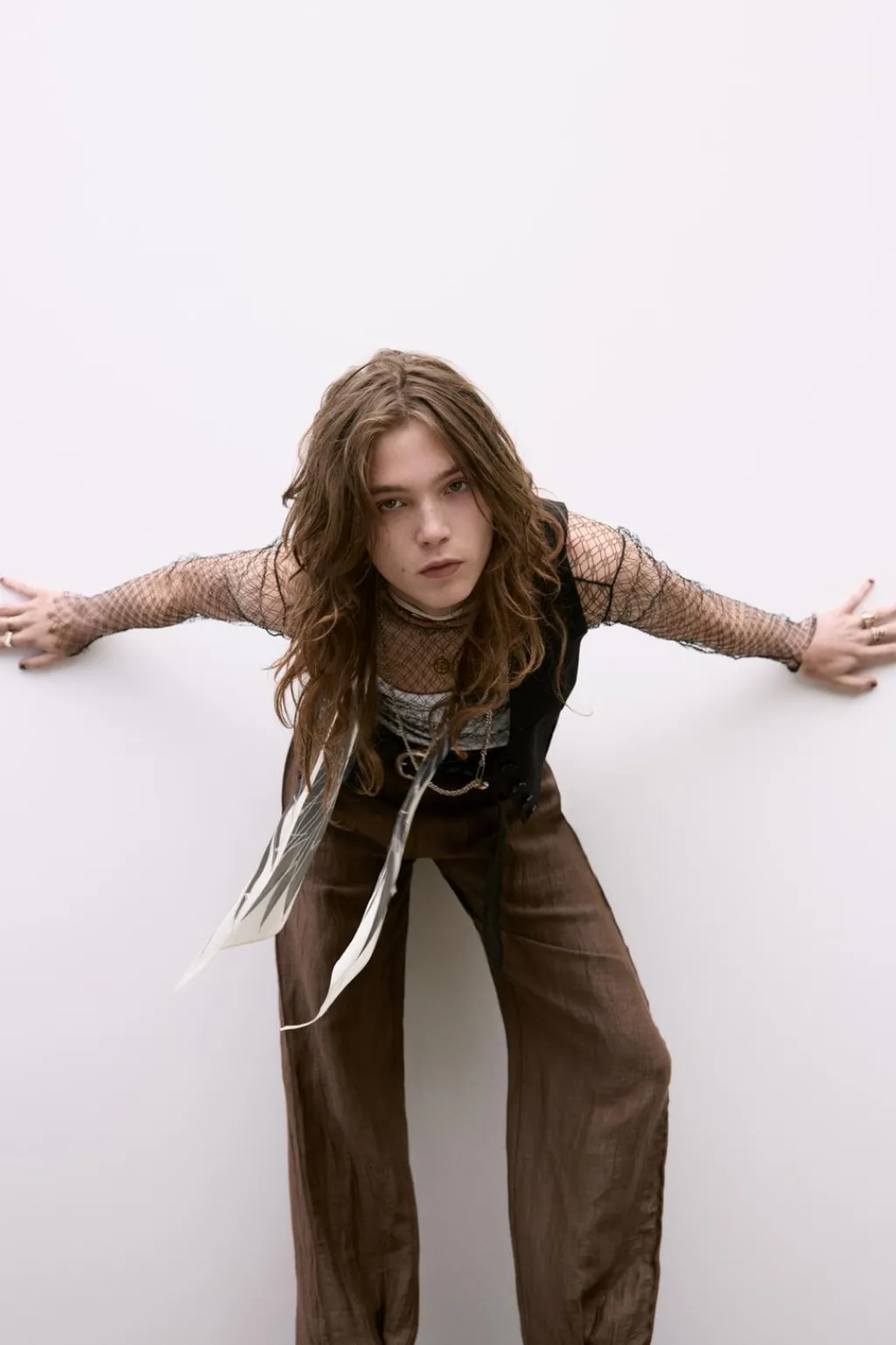Pantalón de tiro medio confeccionado en hilatura con mezcla de lino. Detalle de tejido arrugado. Acabados deshilachados combinados a contraste. Bajo ajustable con botón. Cierre en espalda con cremallera metálica.