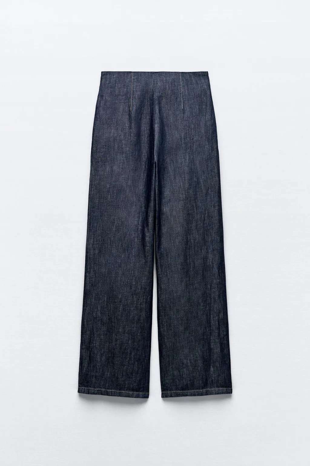 Pantalón confeccionado con lino y algodón. Tiro alto con pinzas y trabillas delanteras. Bolsillos laterales. Pernera ancha. Cierre frontal con cremallera y gancho oculto.