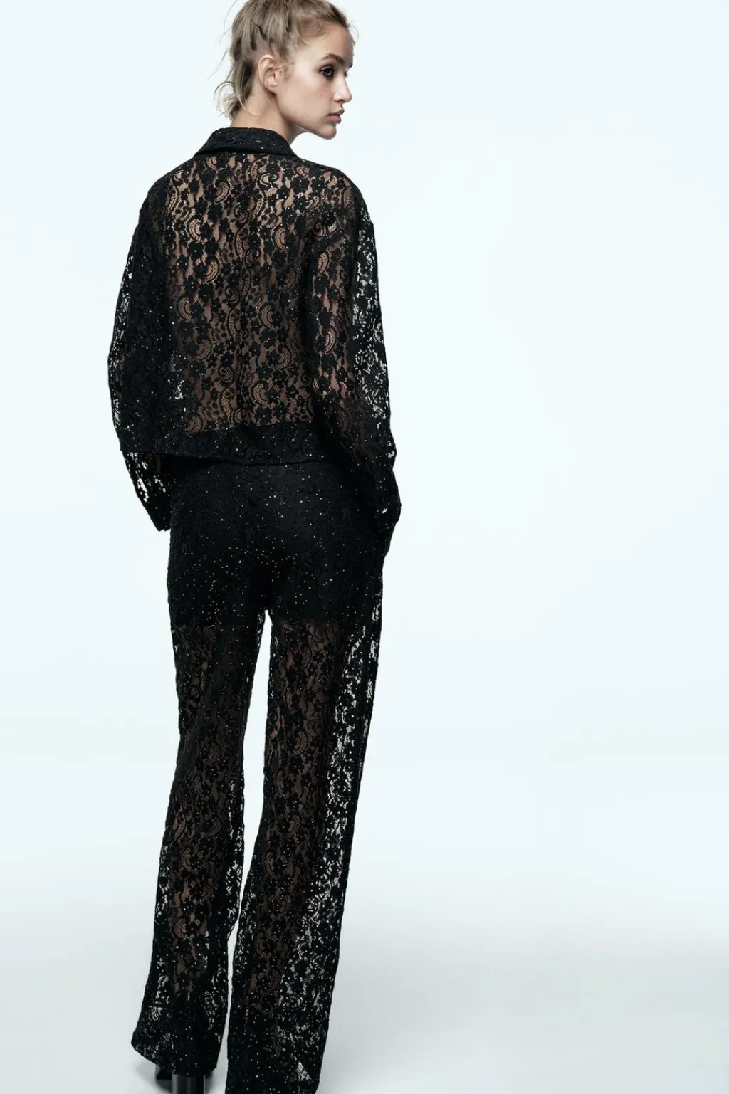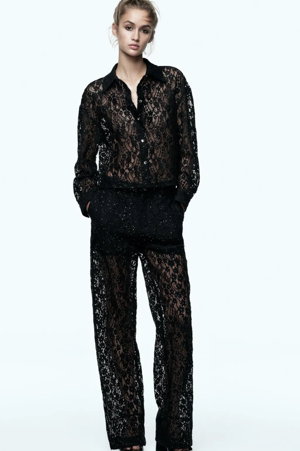 Pantalón de tiro alto con bolsillos delanteros. Detalle aplicación de lentejuelas. Forro interior. Cierre frontal con cremallera y botón metálico.