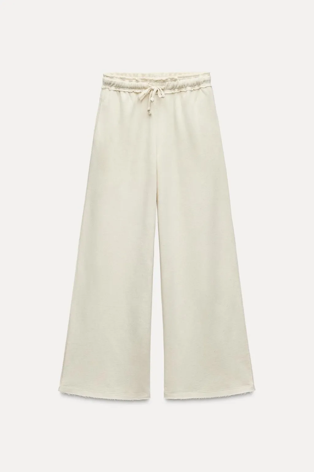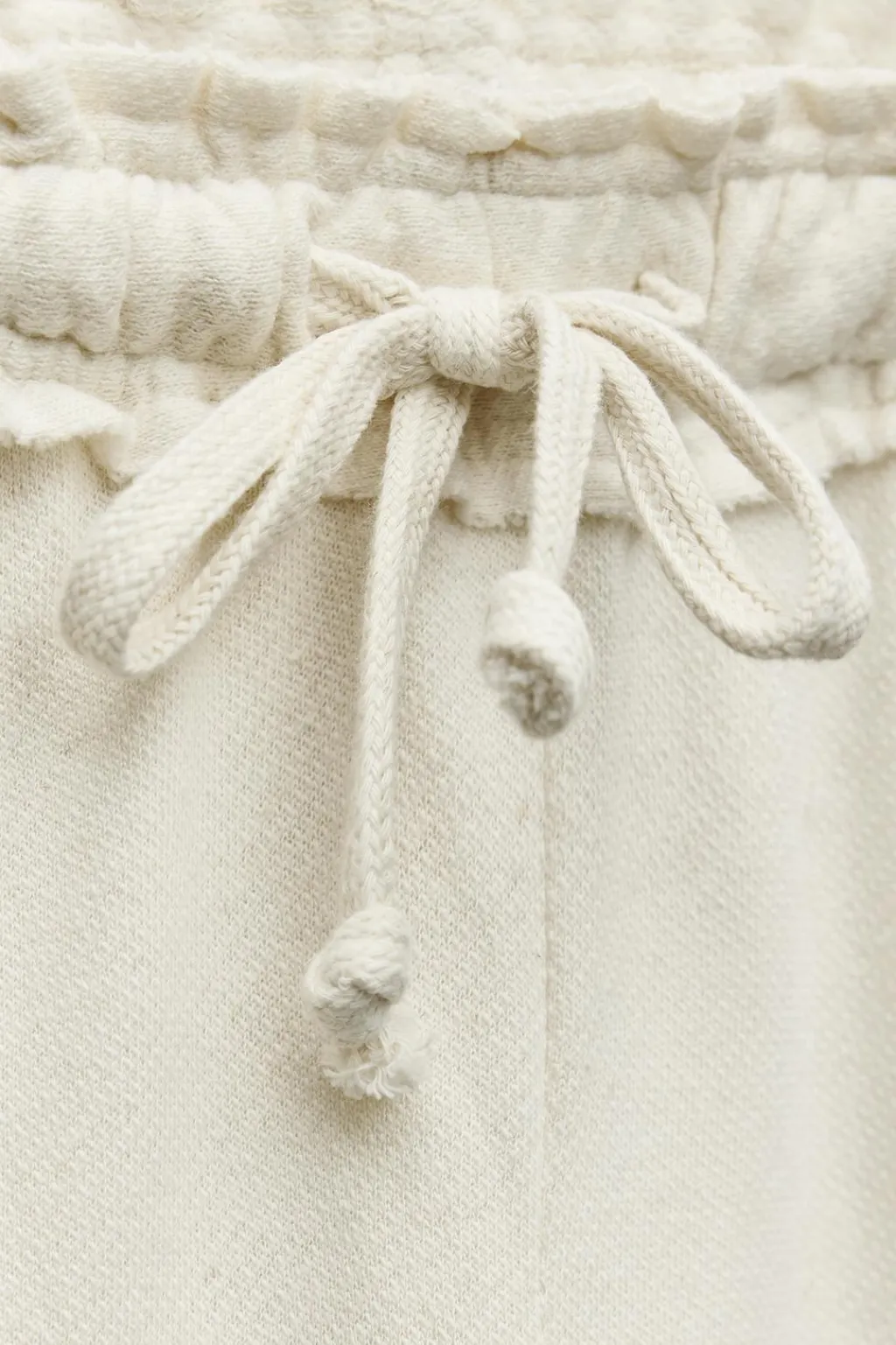 Pantalón de tiro alto con cintura elástica ancha ajustable con cordones. Bolsillos laterales. Pierna recta.