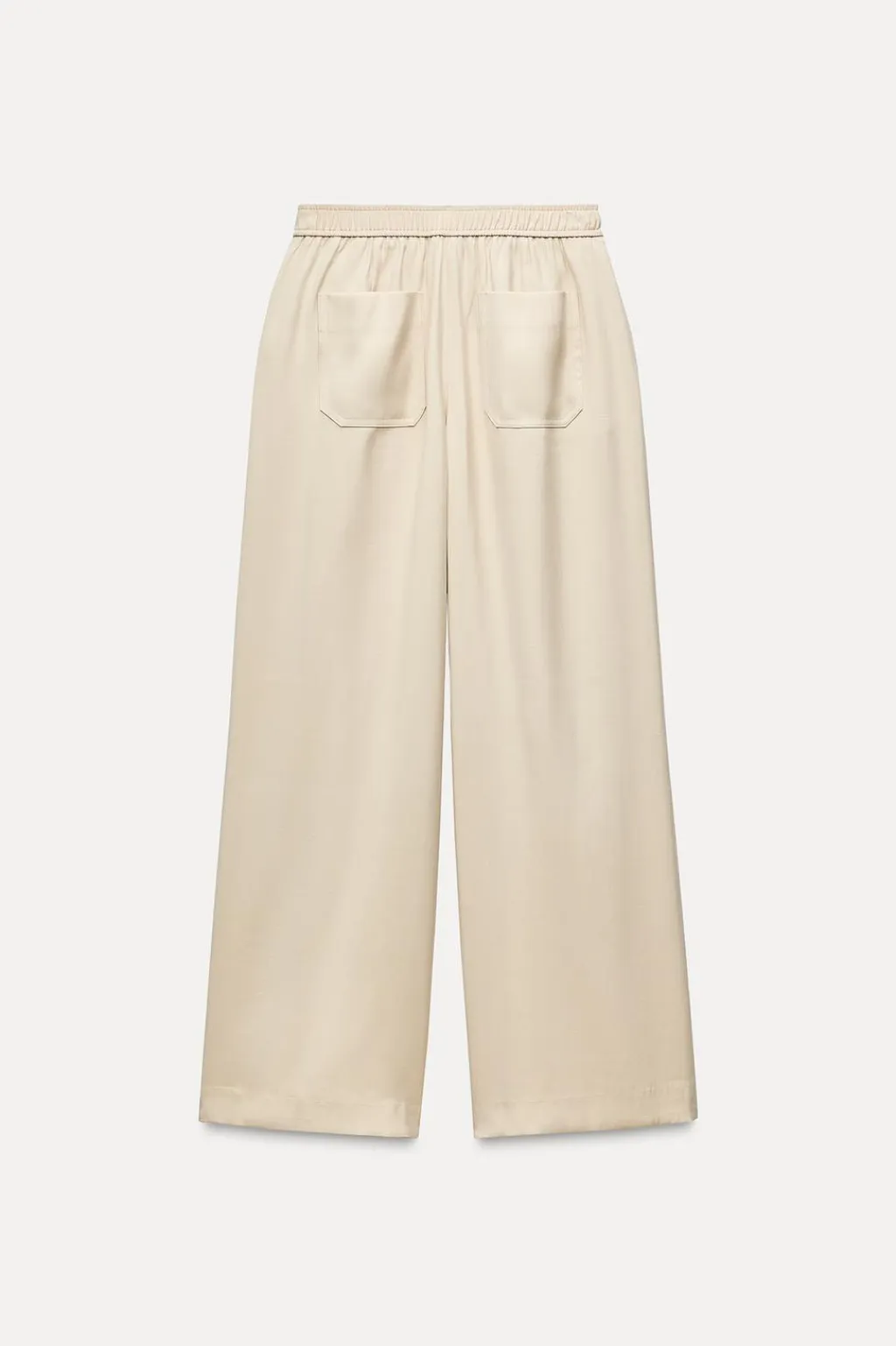 Pantalón de tiro alto con cintura elástica. Bolsillos delanteros y bolsillos de plastrón en espalda. Pernera ancha.
