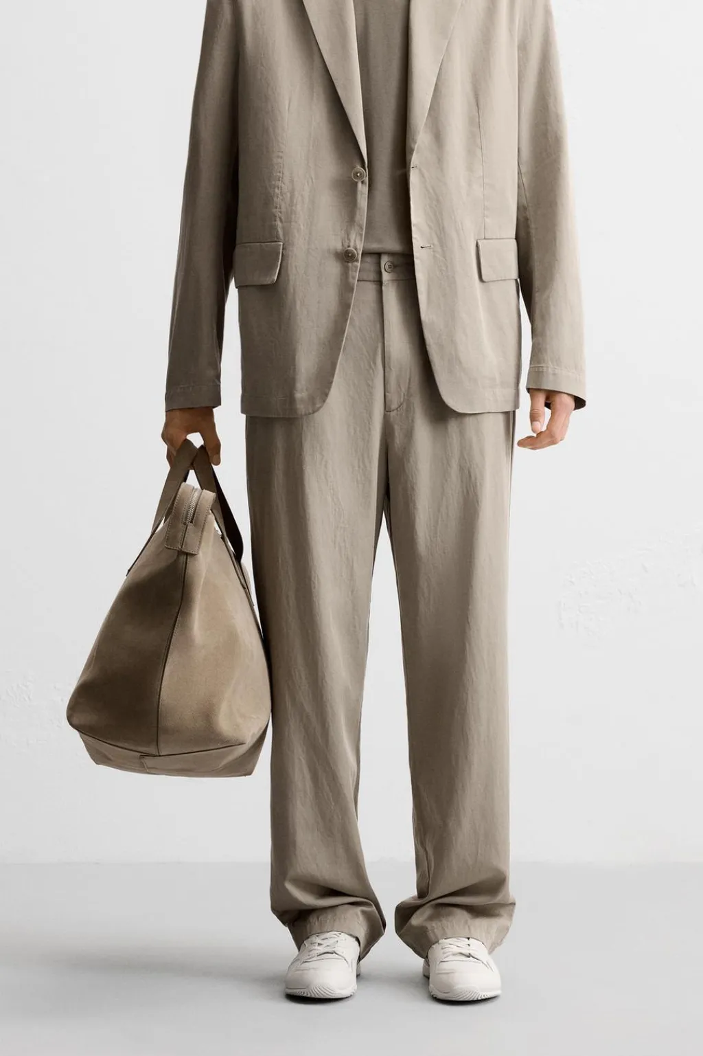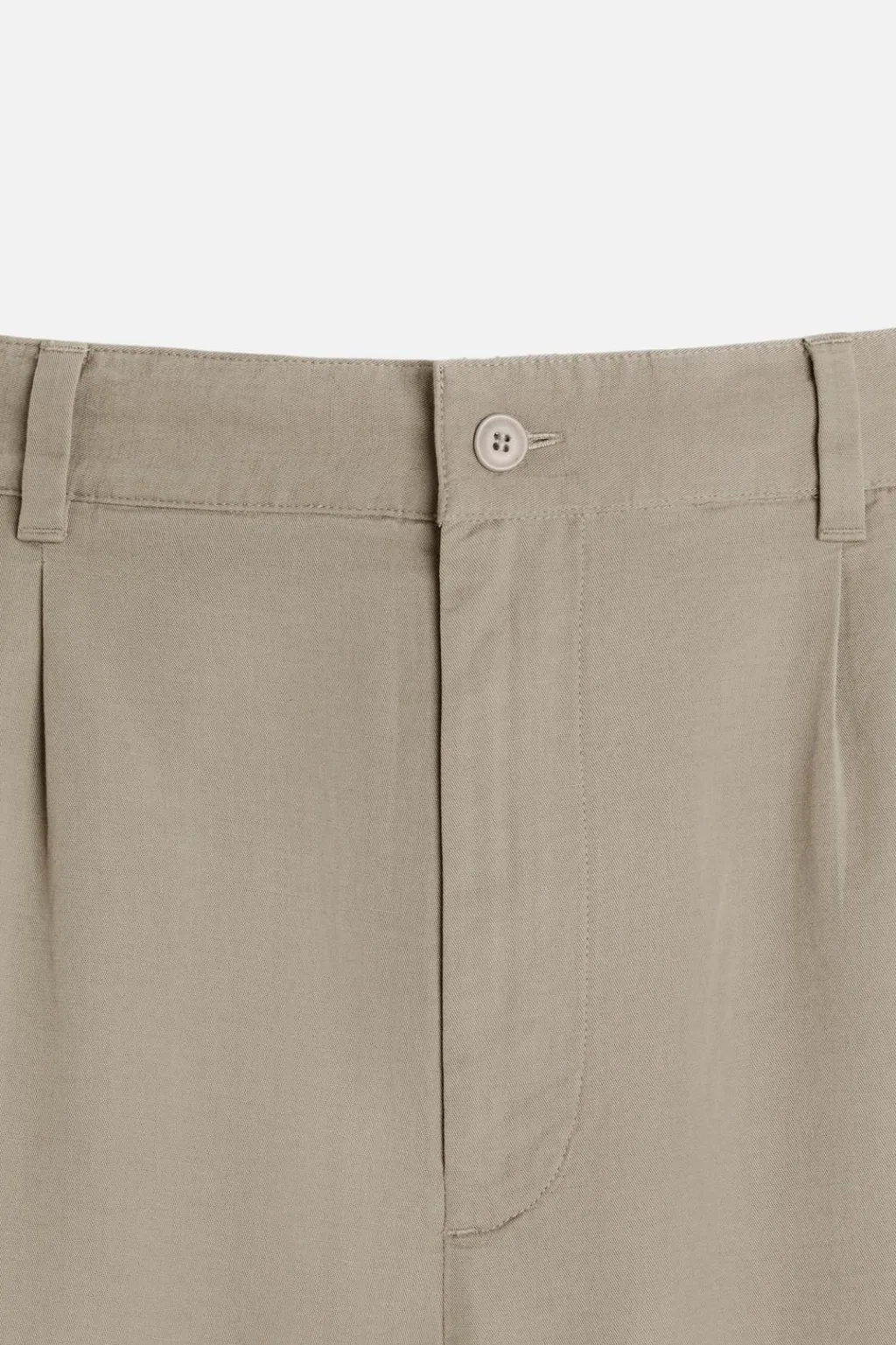 Pantalón regular fit confeccionado en tejido con mezcla de lyocell, algodón y lino. Cintura con detalle de pliegues frontales. Bolsillos en delantero y detalle de bolsillos traseros de vivo. Cierre frontal de cremallera y botón.