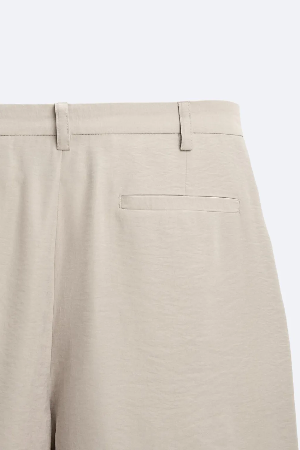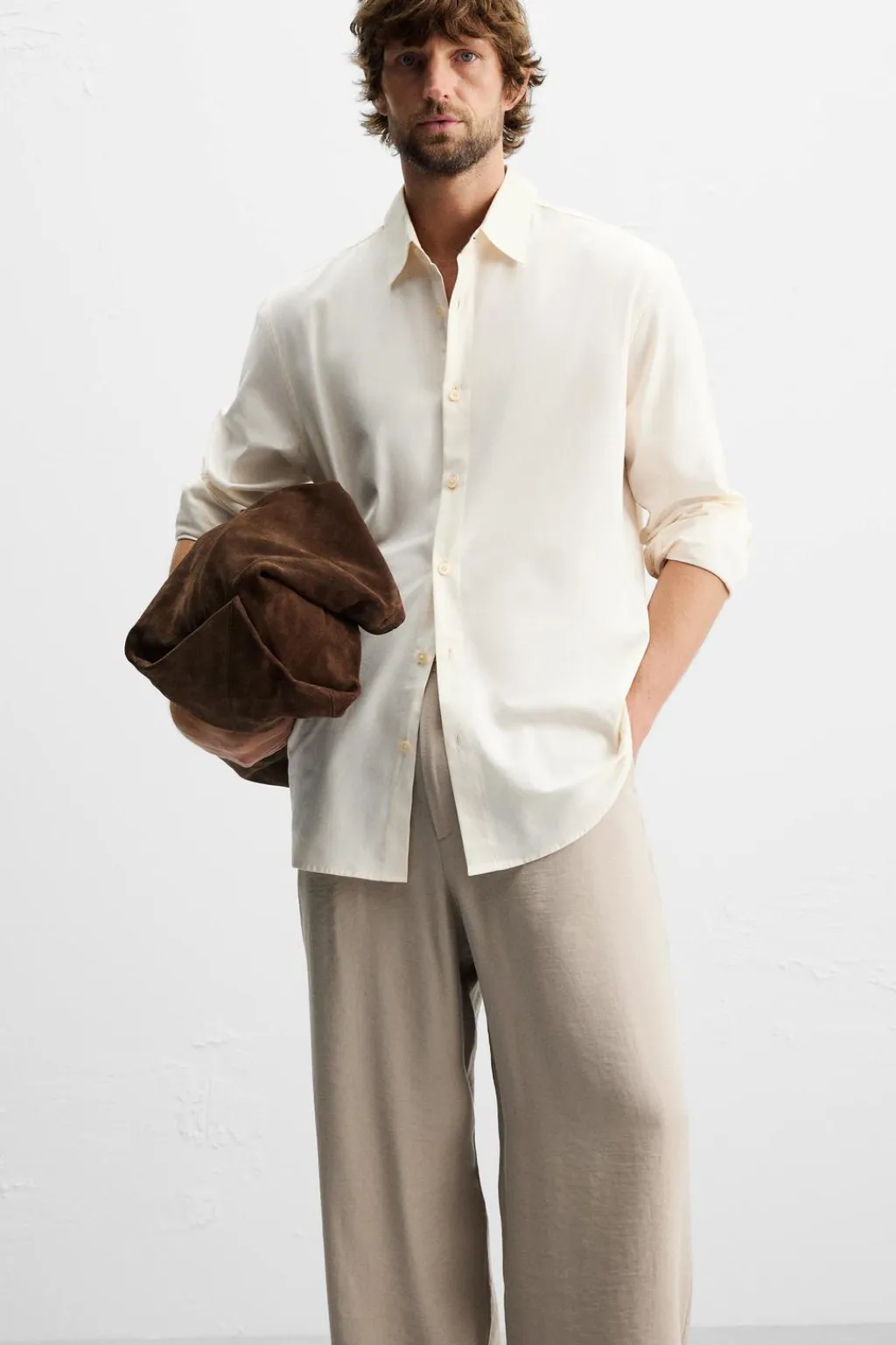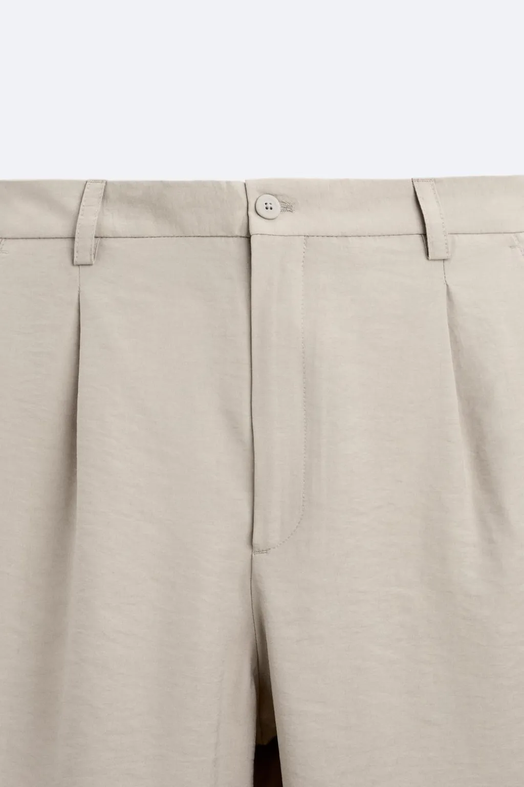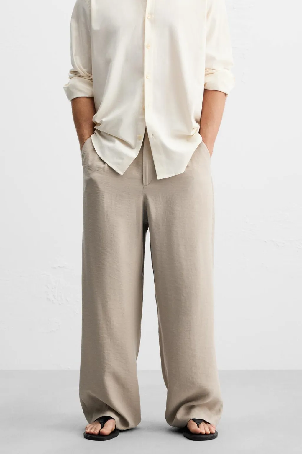 Pantalón relaxed fit confeccionado en tejido ligero con mezcla de modal. Cintura con detalle de pliegues frontales. Bolsillos delanteros y bolsillos traseros de vivo. Cierre frontal con cremallera y botón.