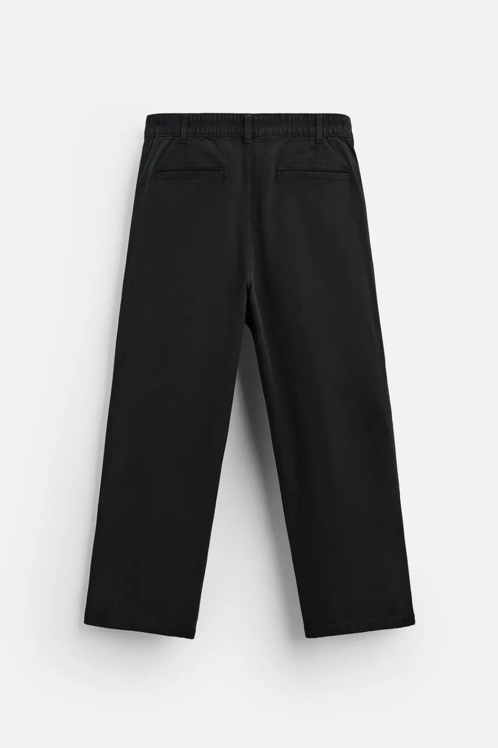 Pantalón relaxed fit. Cintura elástica con detalle de pliegues frontales. Bolsillos delanteros y detalle de bolsillos traseros de vivo. Cierre frontal con cremallera y botón.