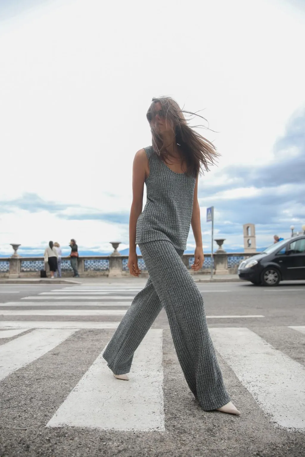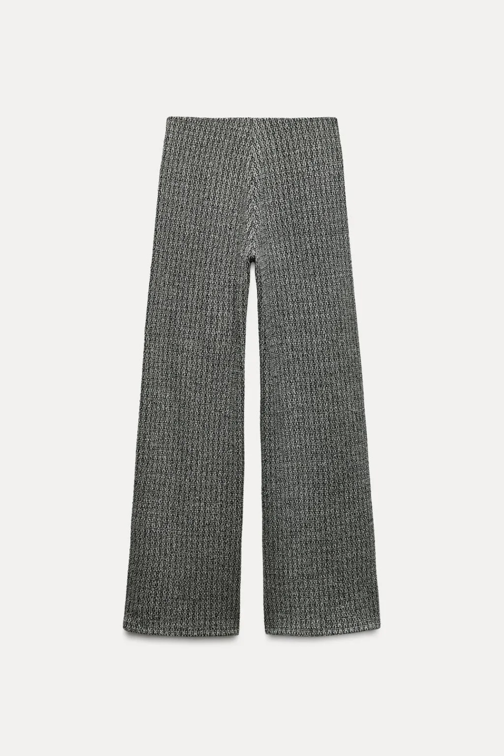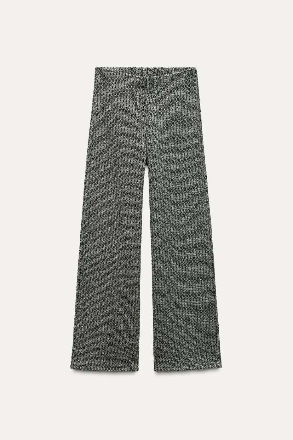 Pantalón de tiro alto y cintura con elástico interior. Pierna ancha.