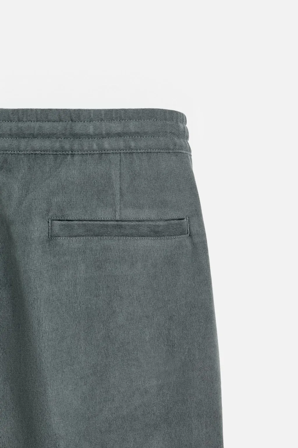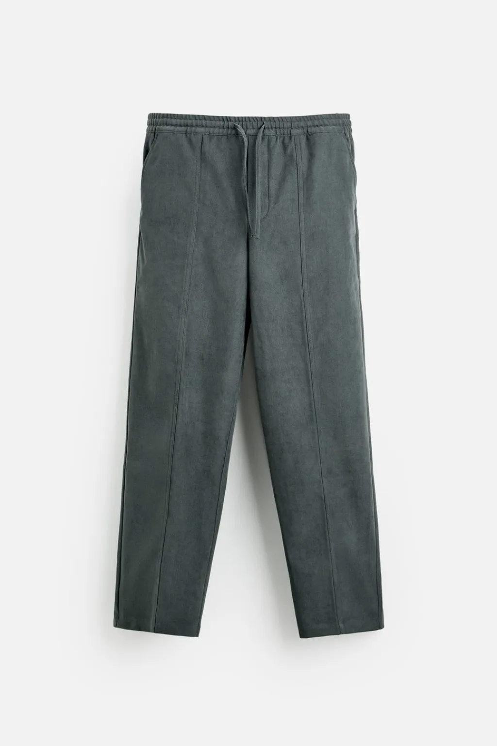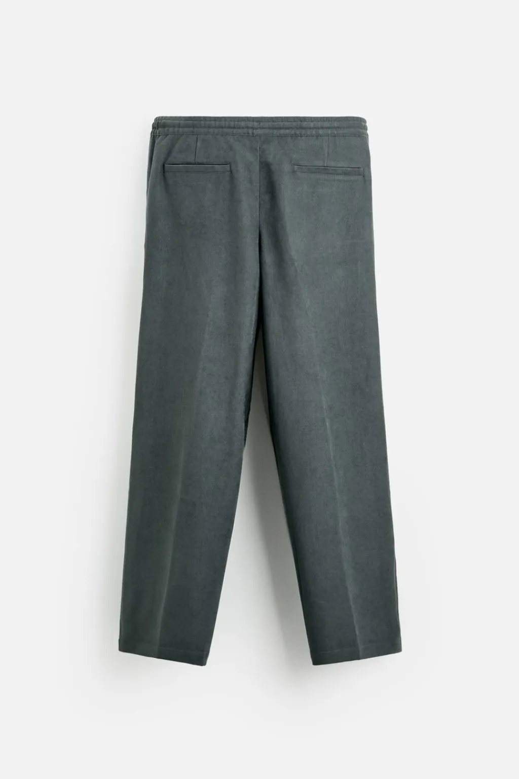 Pantalón regular fit confeccionado en tejido con tacto aterciopelado. Cintura elástica ajustable con cordón. Bolsillos laterales y detalle de bolsillos traseros de vivo.