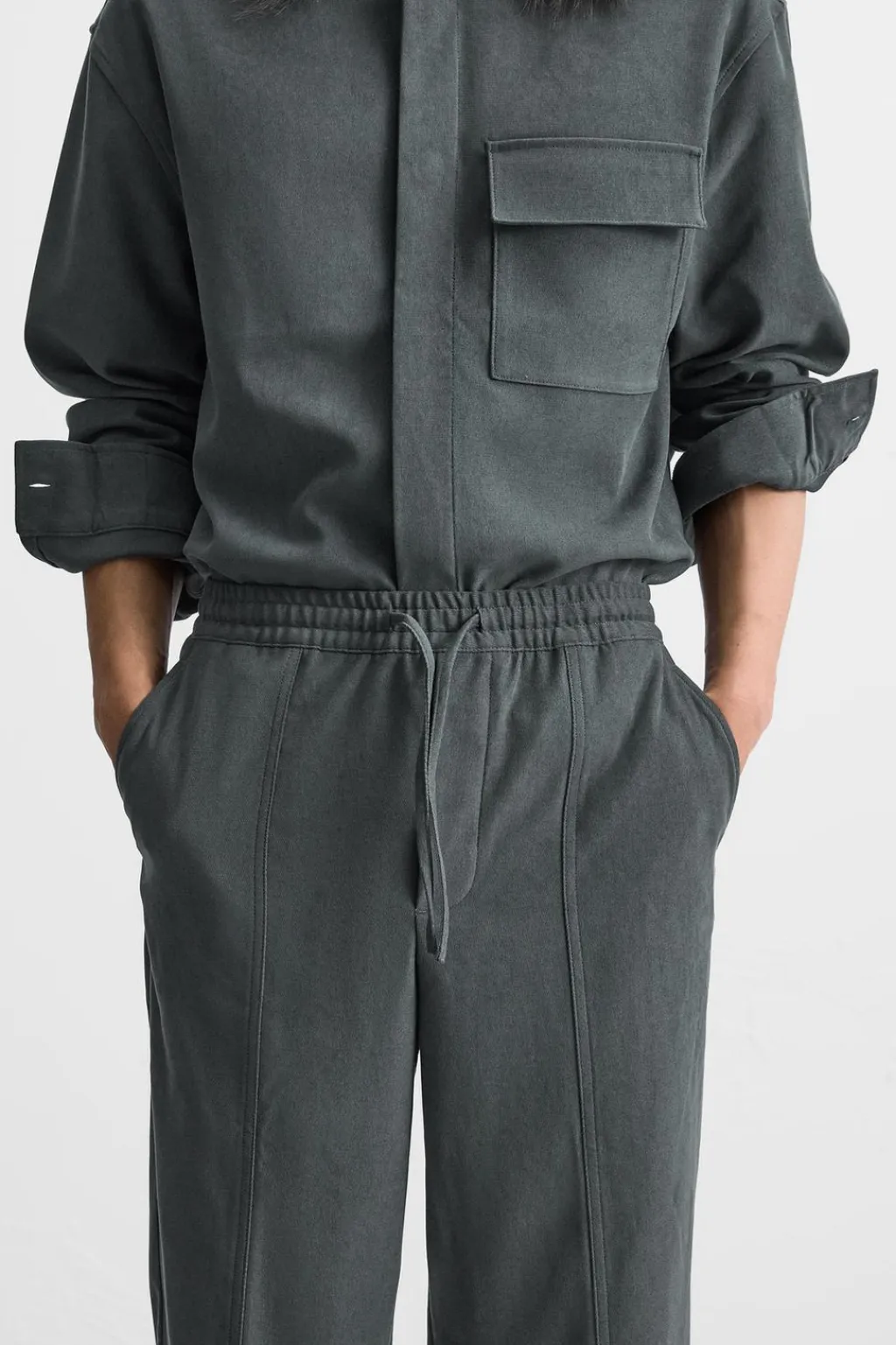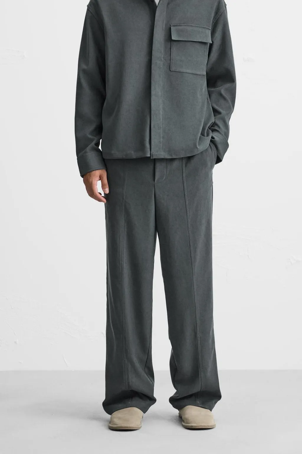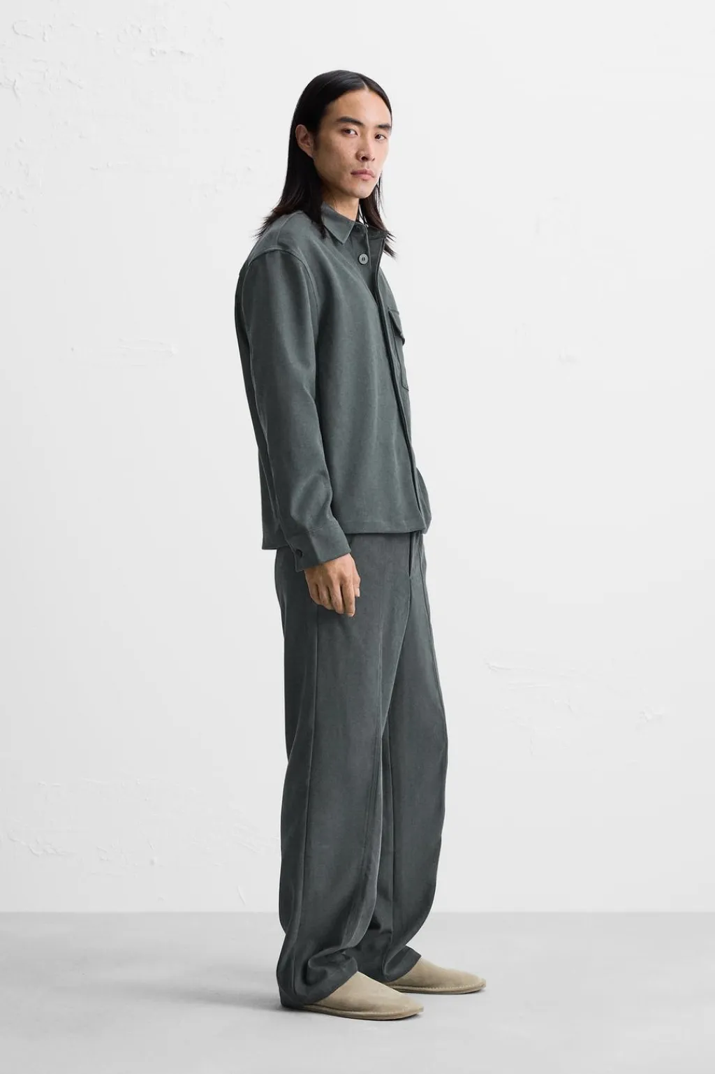 Pantalón regular fit confeccionado en tejido con tacto aterciopelado. Cintura elástica ajustable con cordón. Bolsillos laterales y detalle de bolsillos traseros de vivo.