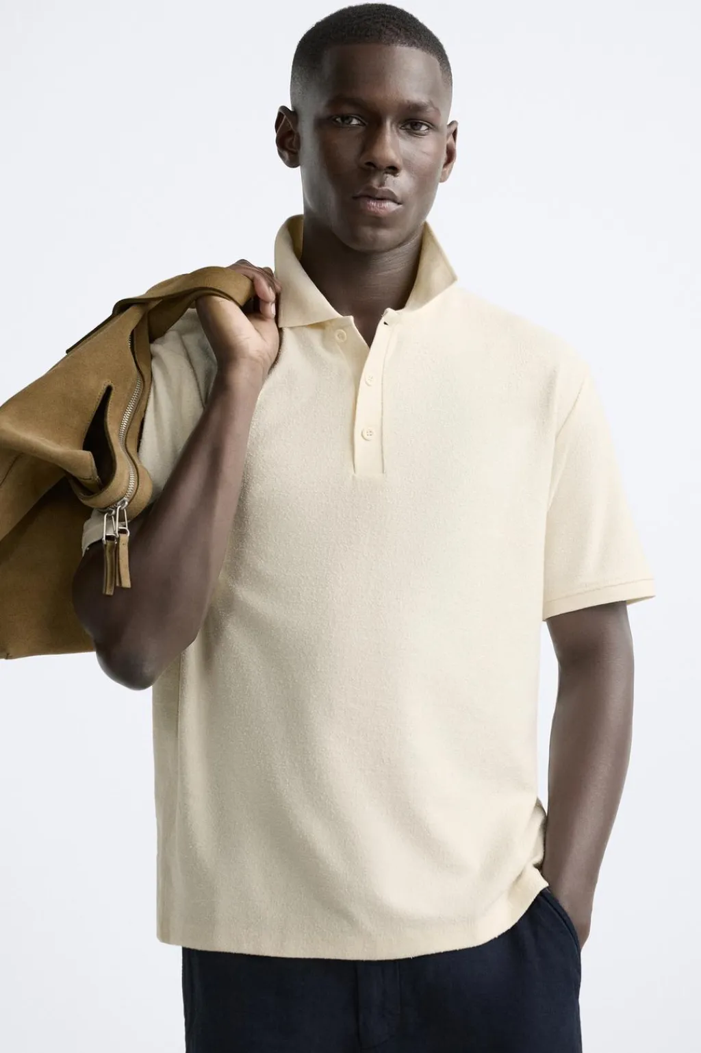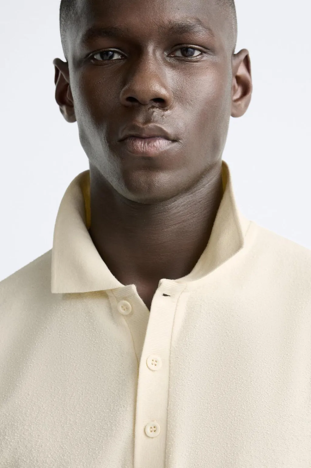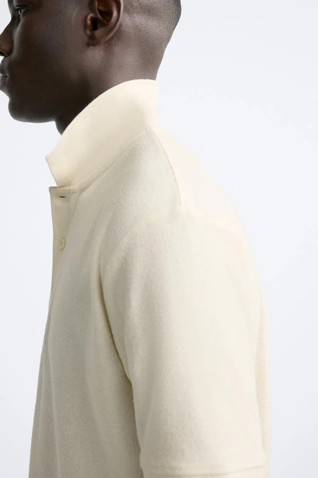 Polo confeccionado en tejido con textura bouclé. Cuello solapa con cierre frontal de botonadura. Manga corta.