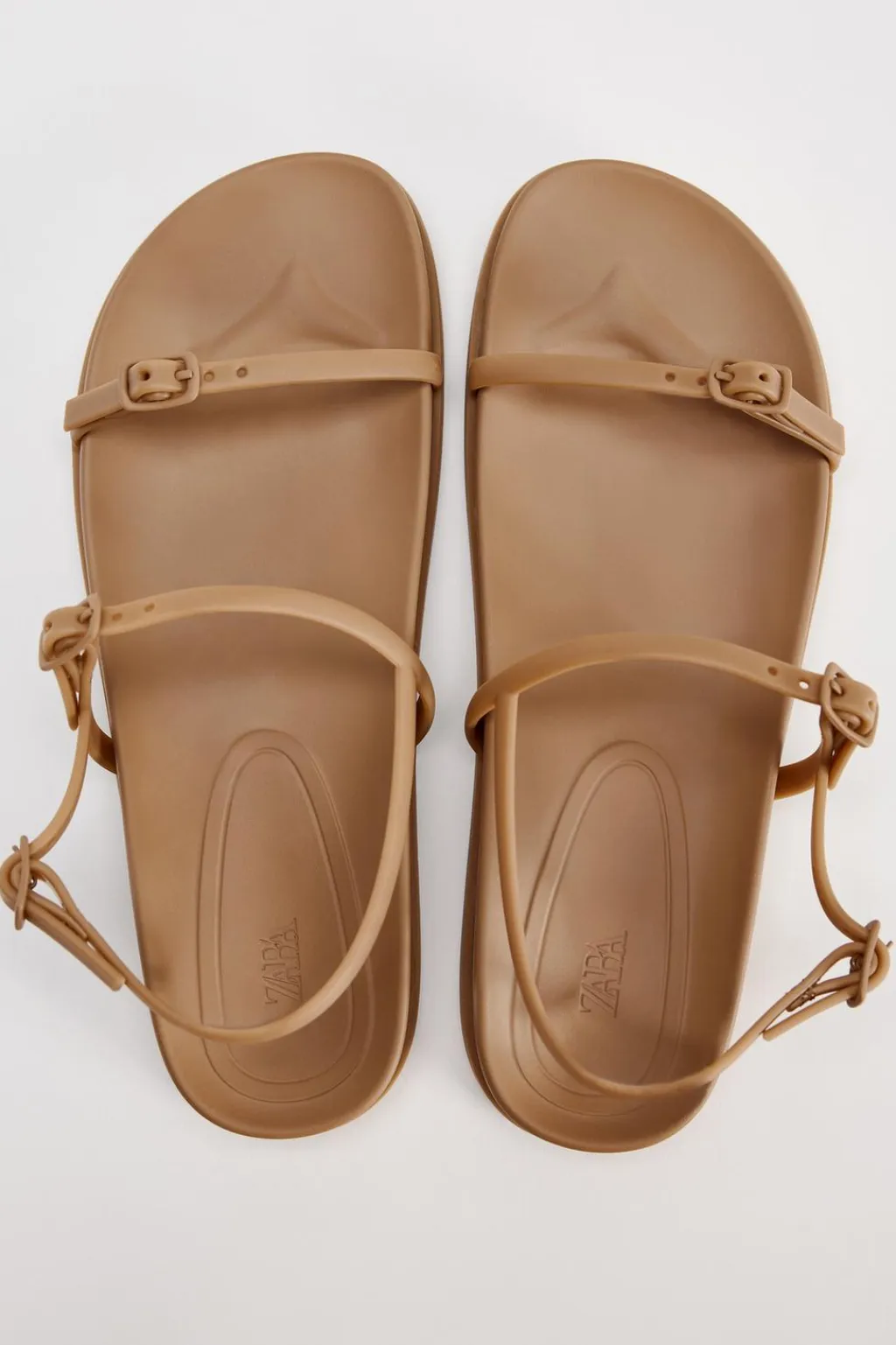 Zapato tipo sandalia plana. Detalle de tiras en la parte delantera. Cierre mediante tira con hebilla al tobillo. Acabado en punta redonda.