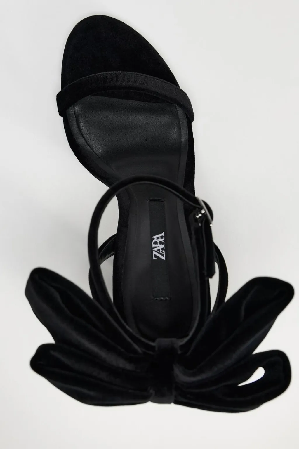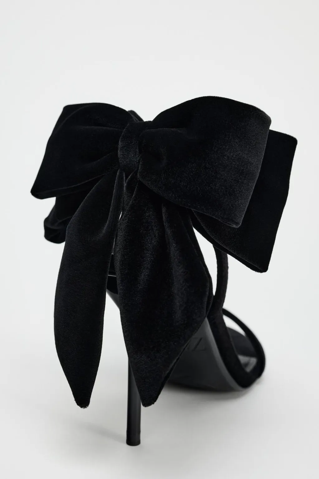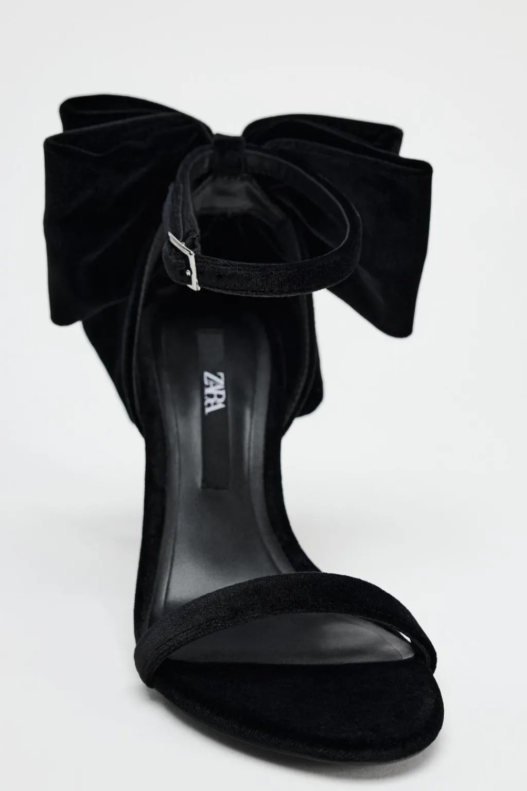 Zapato tipo sandalia con tacón fino. Efecto terciopelo. Detalle de maxi lazo en la parte trasera. Tira en el empeine. Cierre mediante hebilla en la pulsera al tobillo.