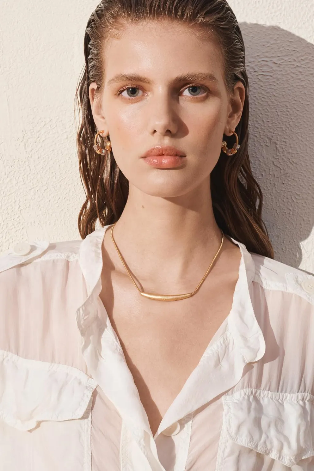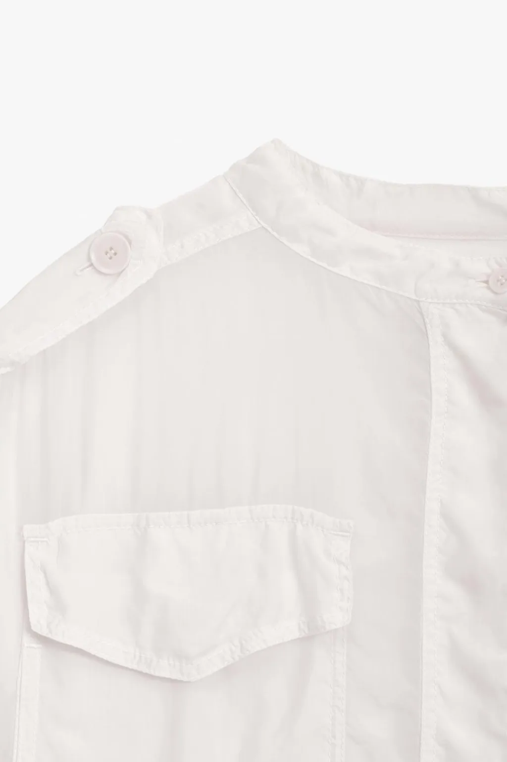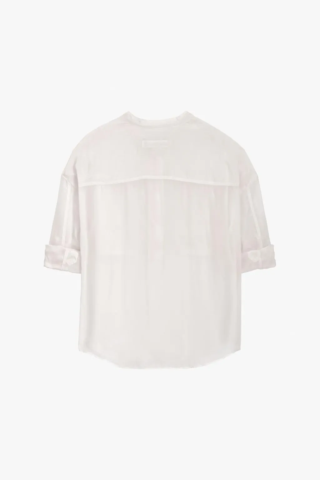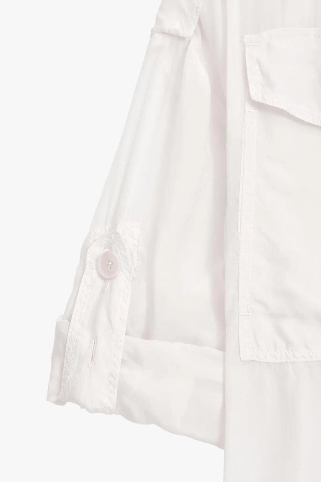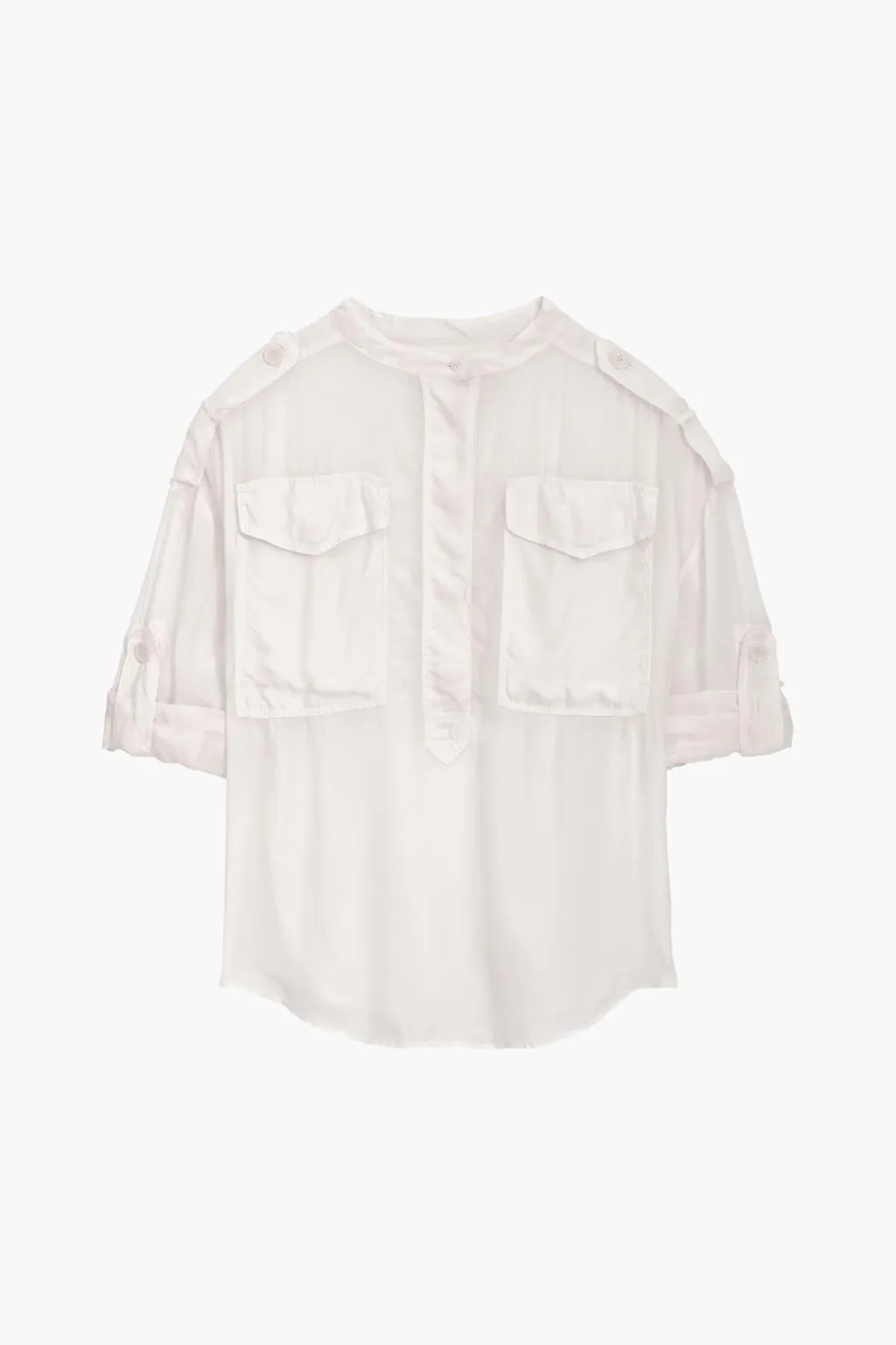 Camisa fluida confeccionada en hilatura de cupro 100%. Cuello redondo con cinta en mismo tejido y trabillas. Manga larga acabada en puño con abertura y botón. Trabillas en hombros. Bolsillos de plastrón con solapa en pecho. Detalle de pespuntes marcados combinados a tono. Cierre frontal con botones ocultos por solapa.