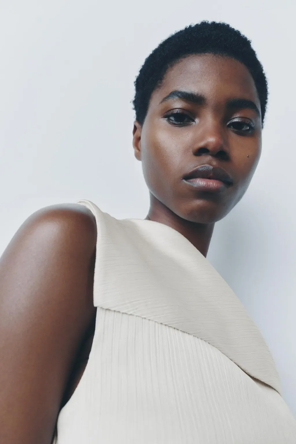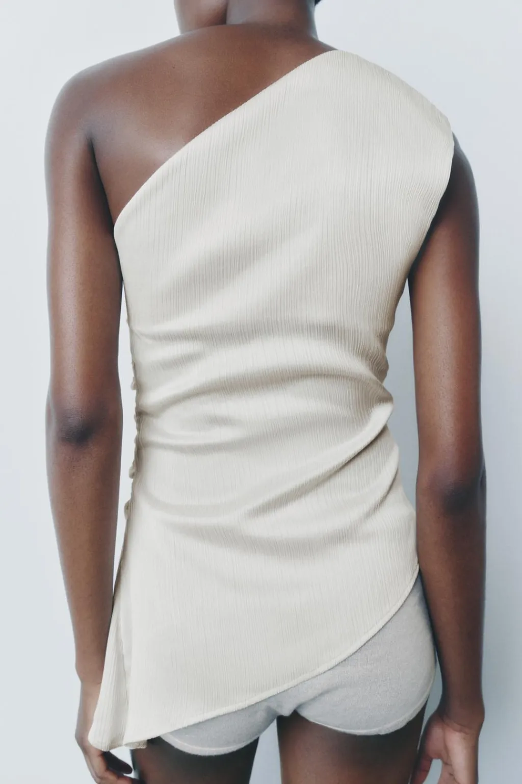 Top de escote asimétrico con hombro descubierto. Detalle de drapeado lateral. Bajo asimétrico. Cierre con cremallera oculta en costura.