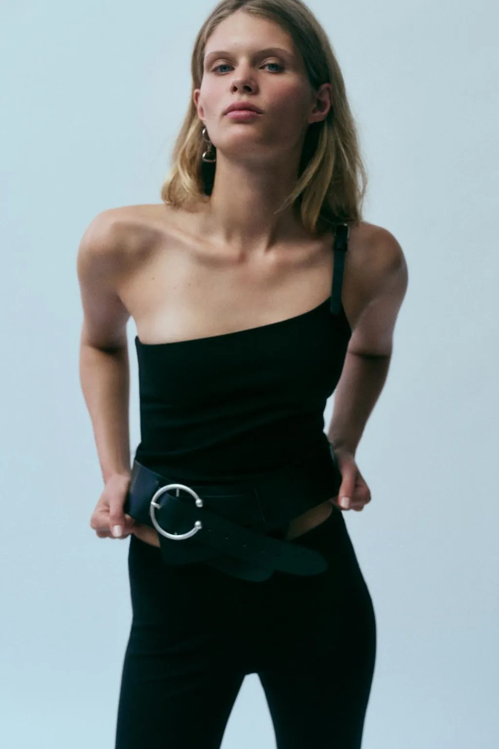 Top de escote asimétrico y tirante ajustable con hebilla.