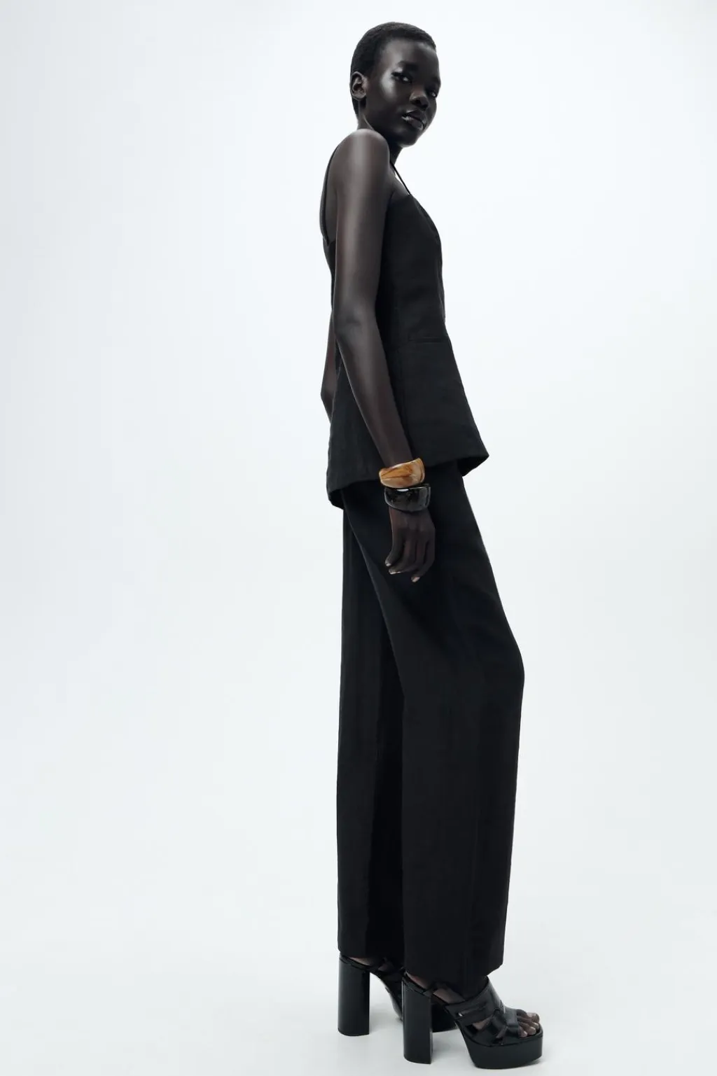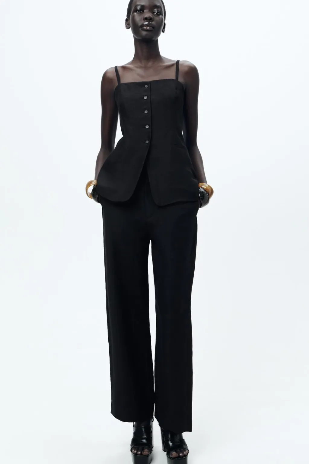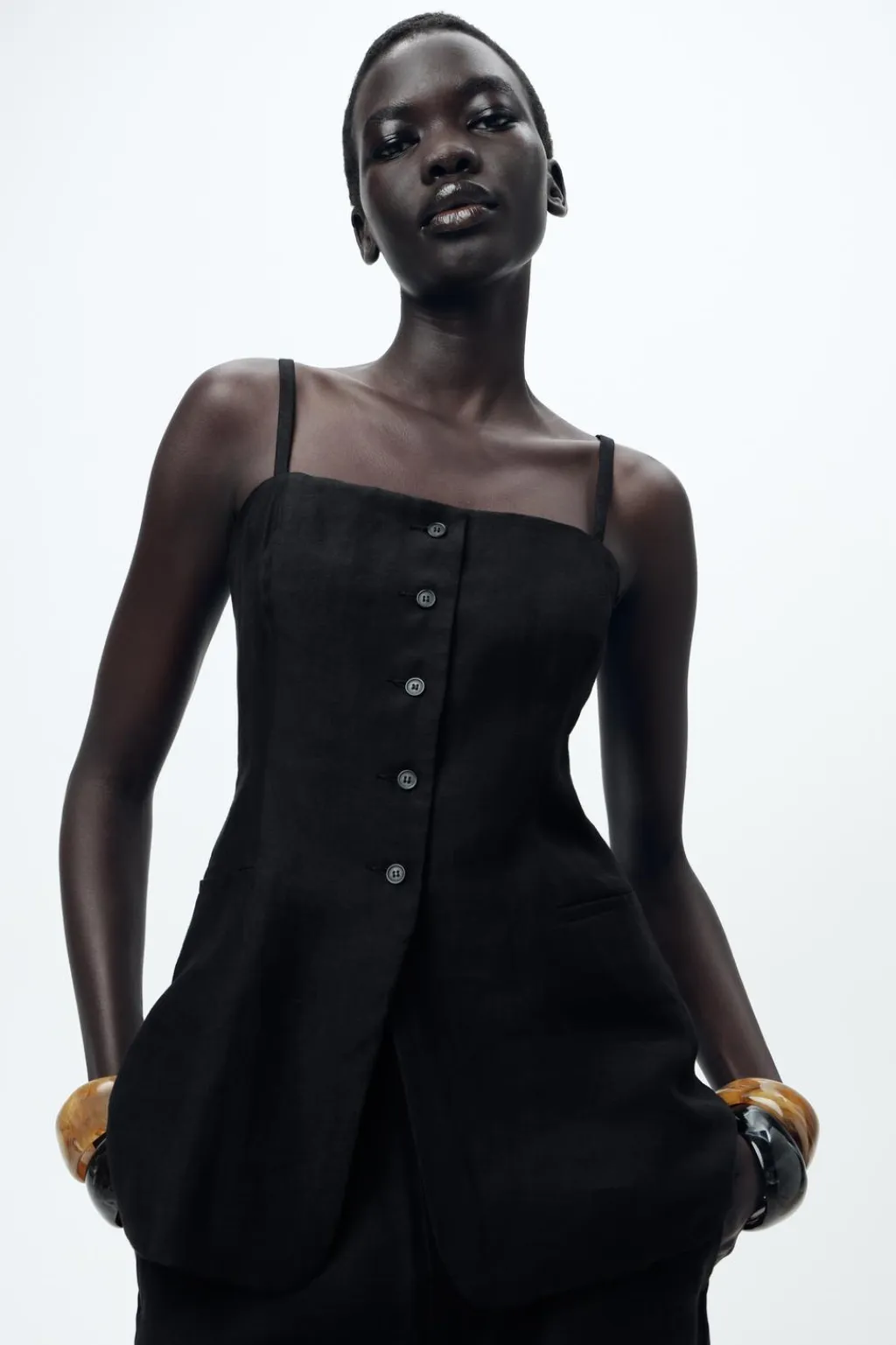 Top tipo chaleco confeccionado en hilatura con lino. Escote recto y tirantes finos. Falsos bolsillos de vivo en delantero. Bajo asimétrico. Cierre frontal con botones.
