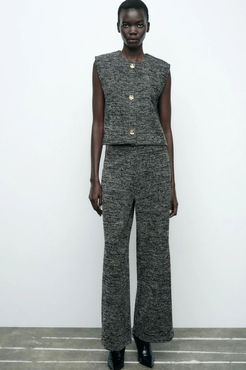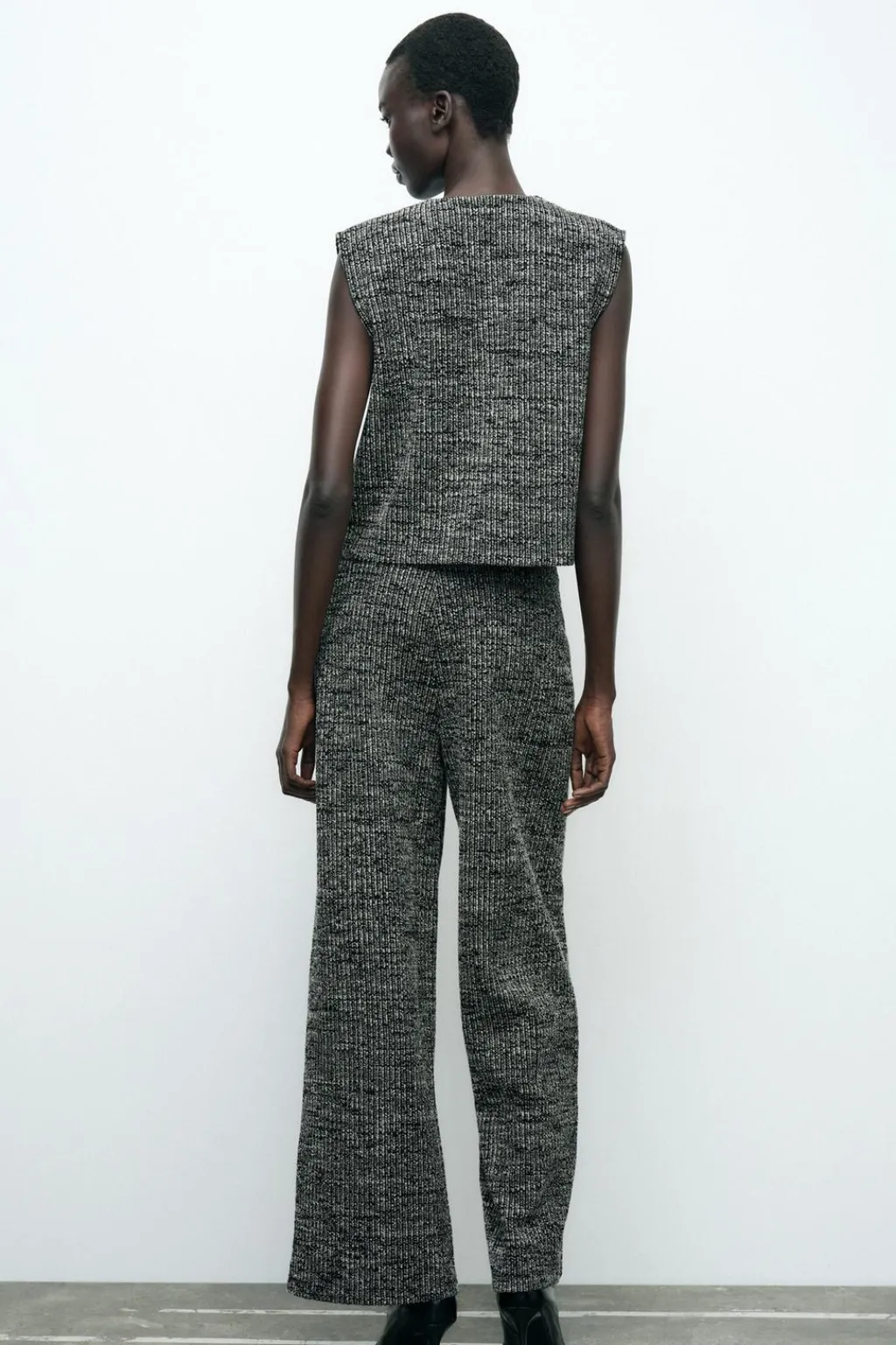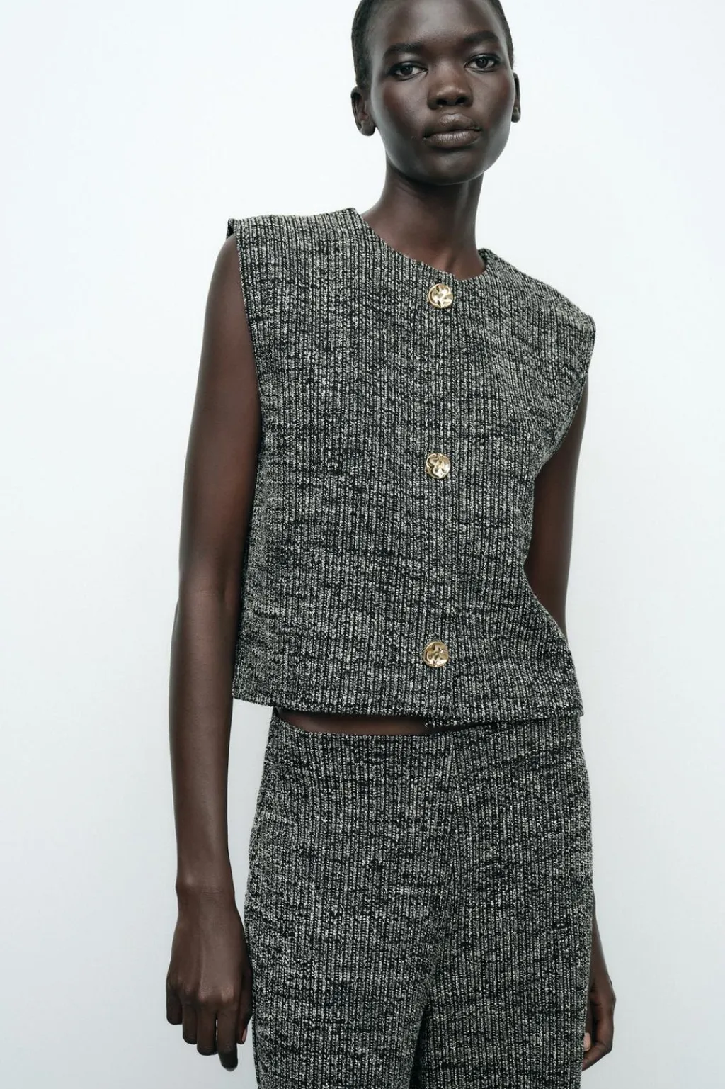Top tipo chaleco de cuello redondo y manga sisa. Cierre frontal con botones metálicos.