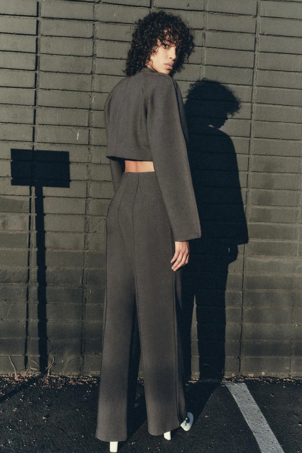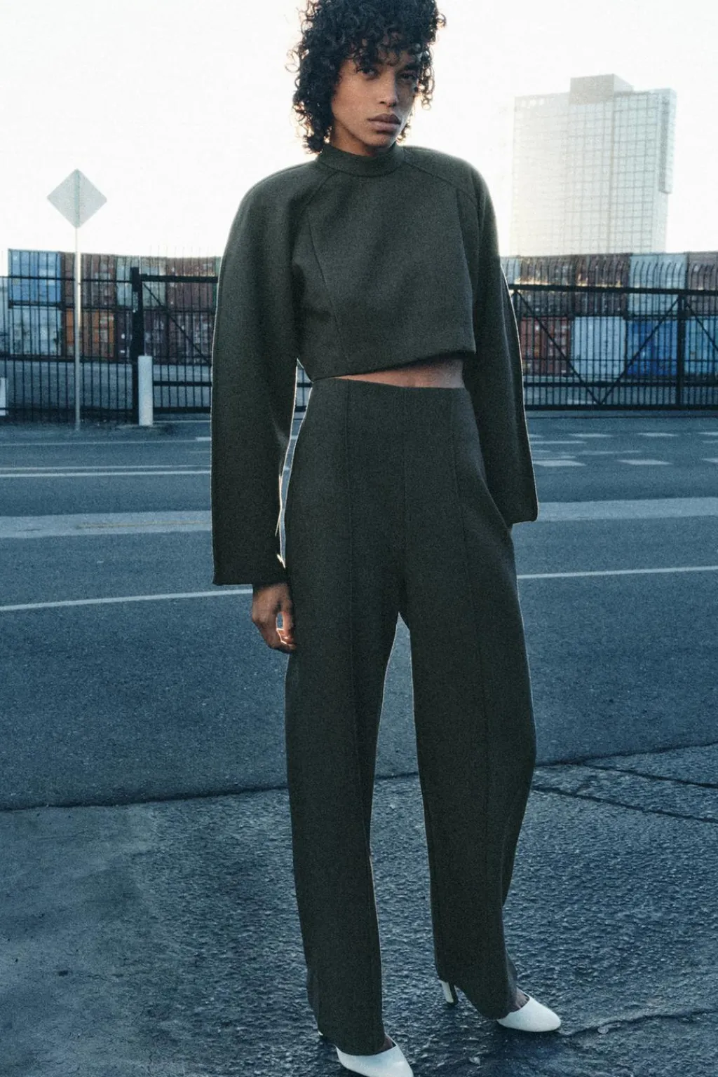 Top corto de cuello perkins y manga larga con volumen. Cierre en espalda con cremallera oculta en costura.