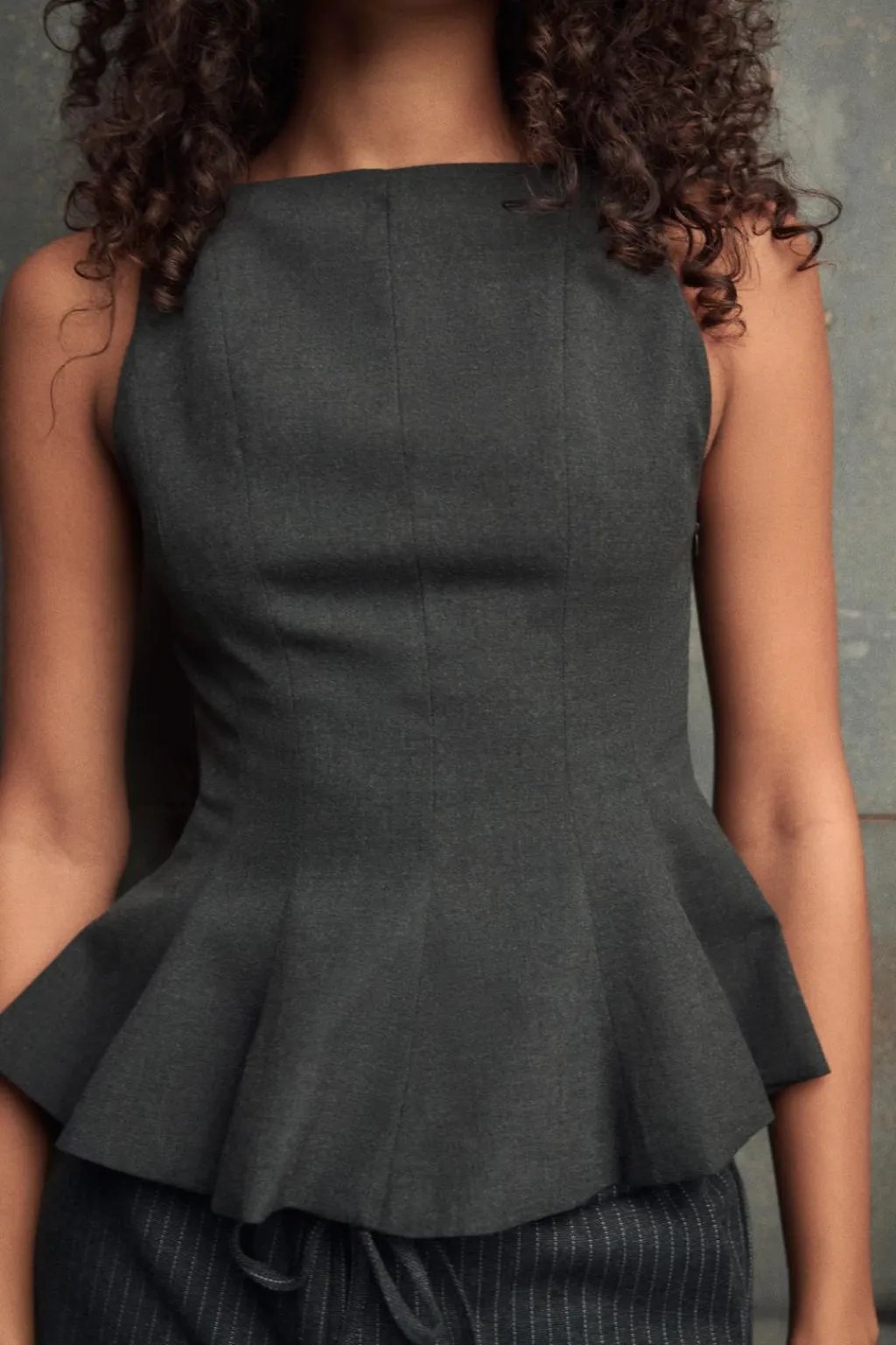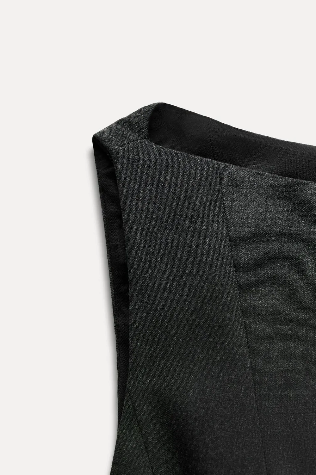 Top entallado de cuello redondo y manga sisa. Forro interior combinado. Bajo acabado en volantes. Cierre lateral con cremallera oculta en costura.