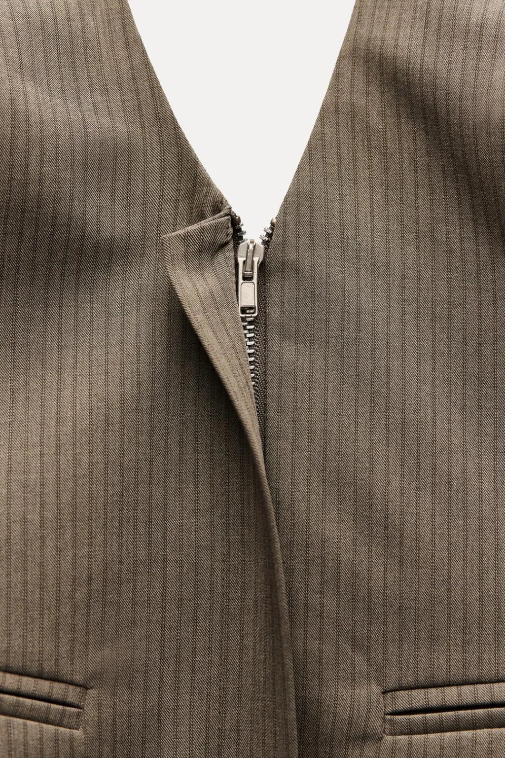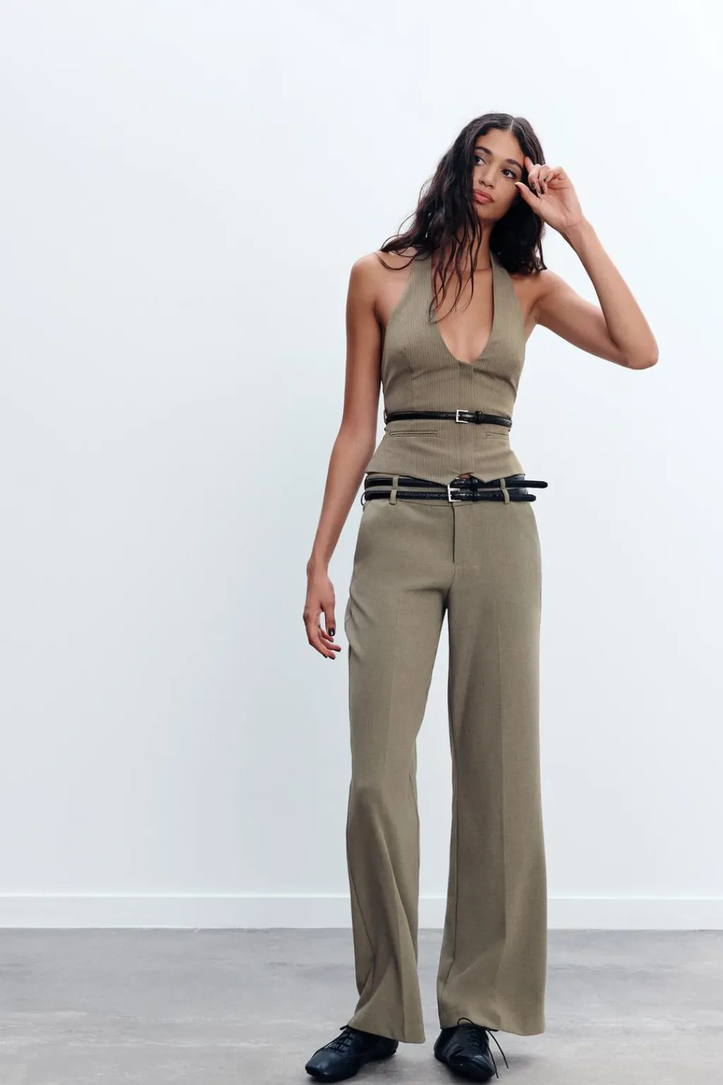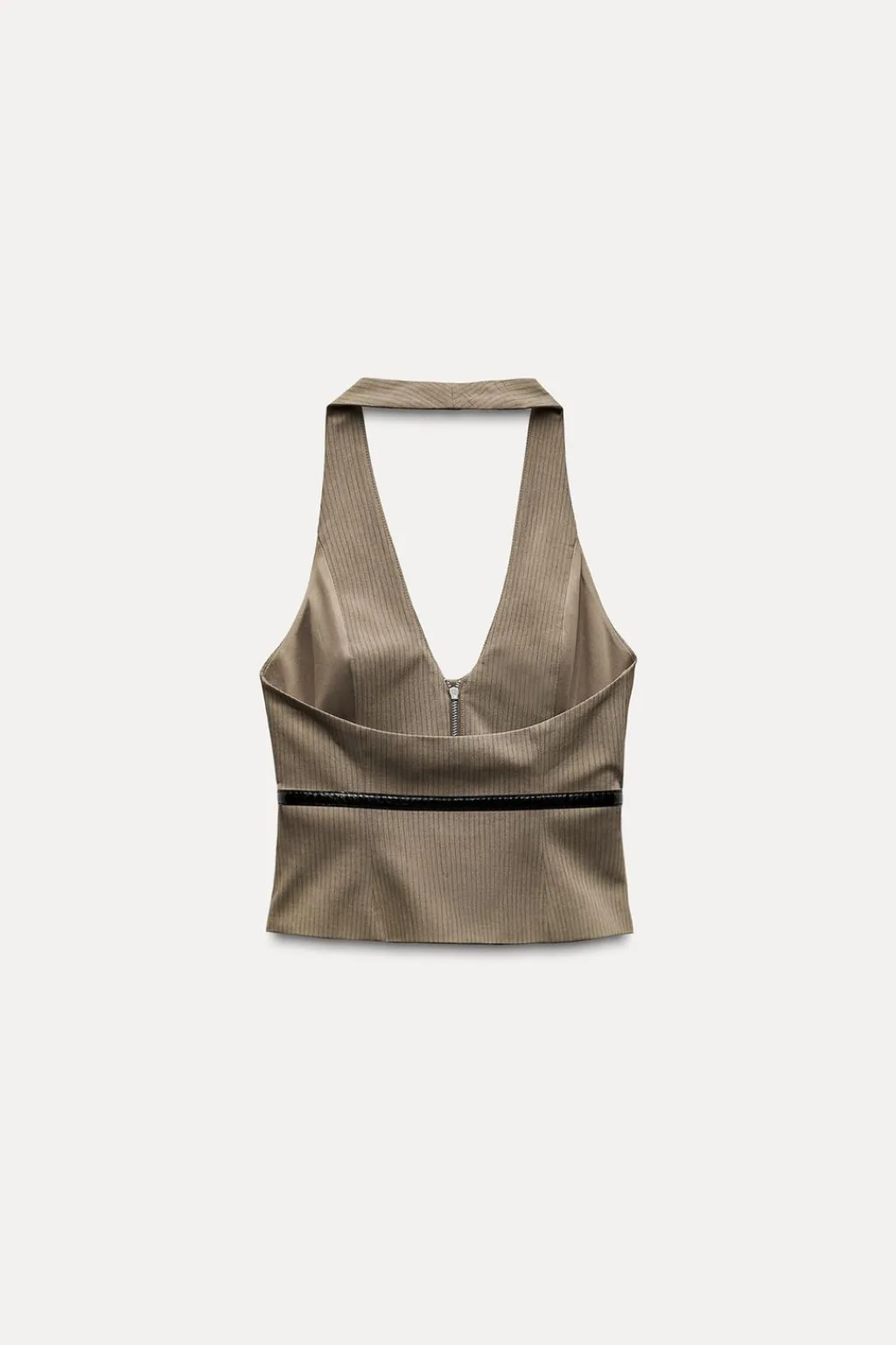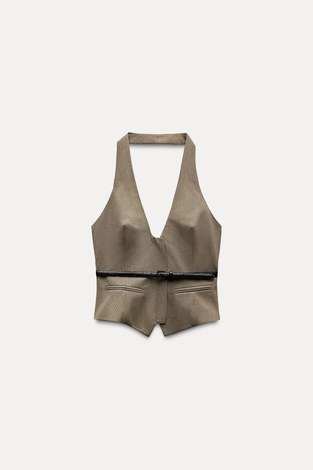 Top de cuello halter y escote pico. Cinturón fino combinado con hebilla metálica. Forro interior. Cierre frontal con cremallera oculta por sopata.