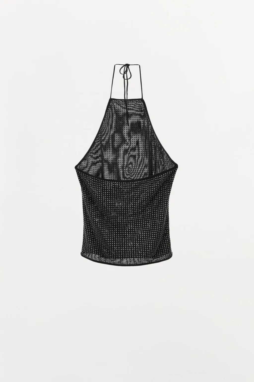 Top de cuello halter ajustable con lazada. Detalle aplicación brillos.