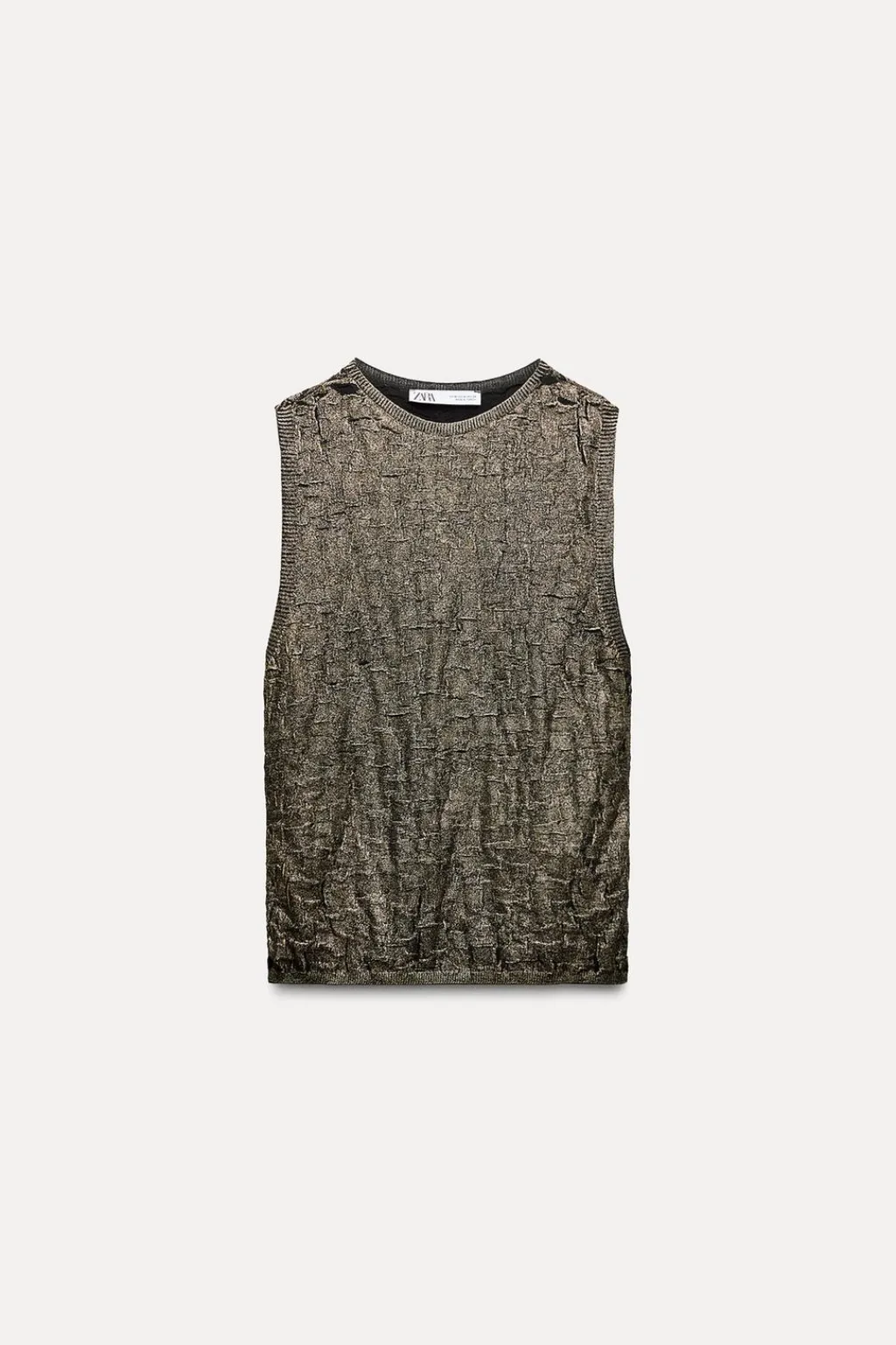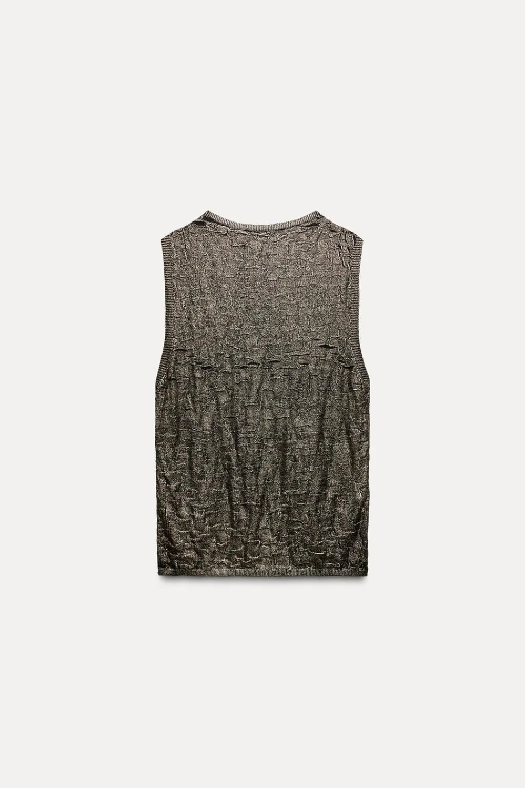 Top de cuello redondo y manga sisa. Detalle de tejido metalizado.