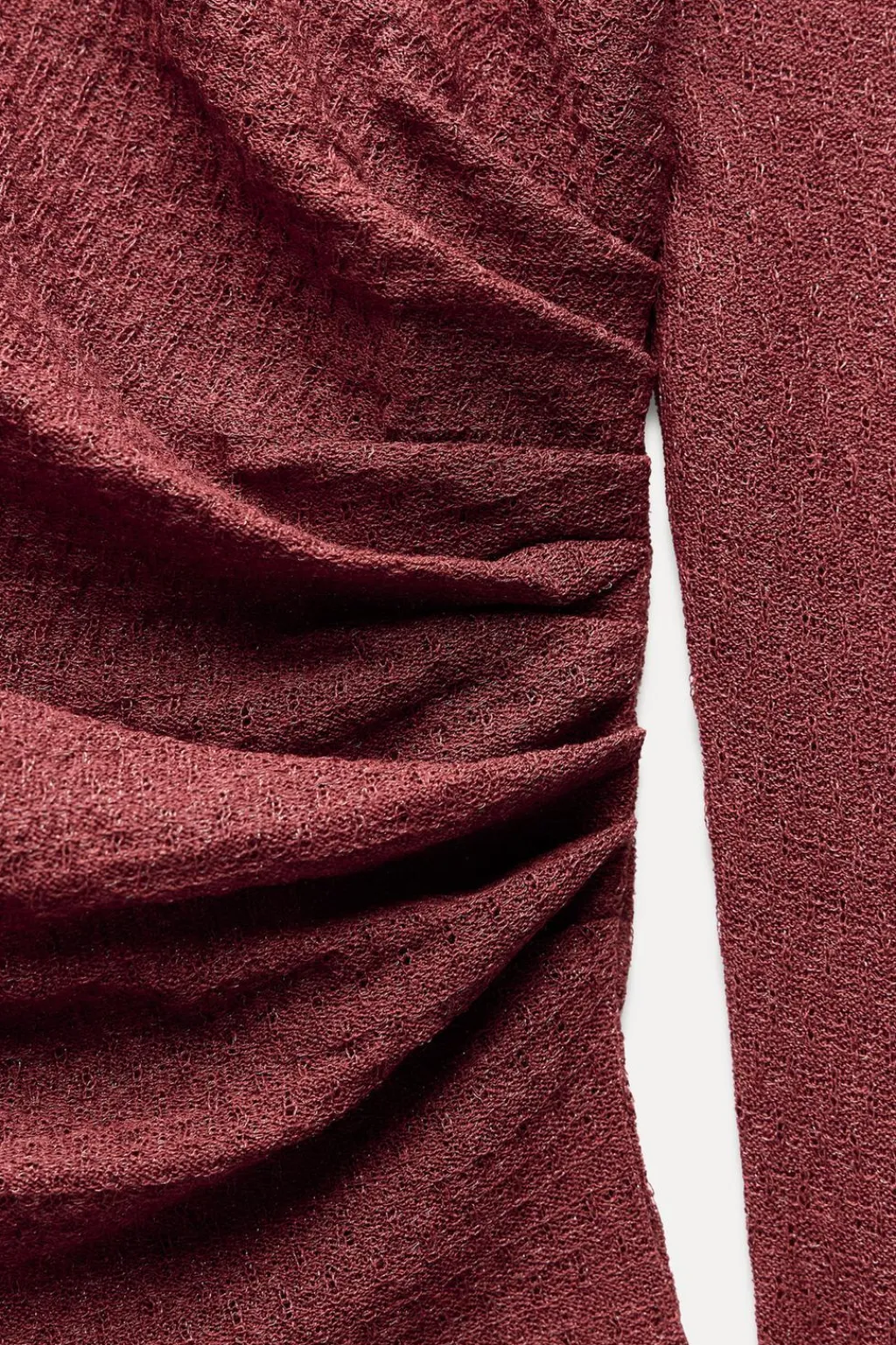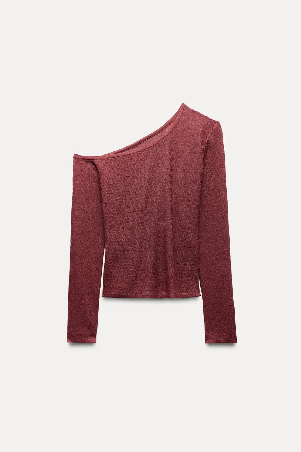 Top de cuello asimétrico amplio y manga larga. Detalle de hilo metalizado y acabados con frunces.